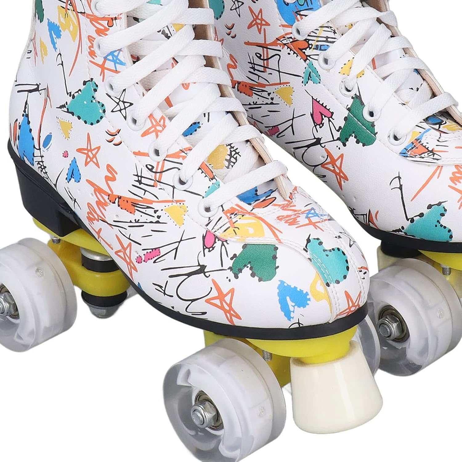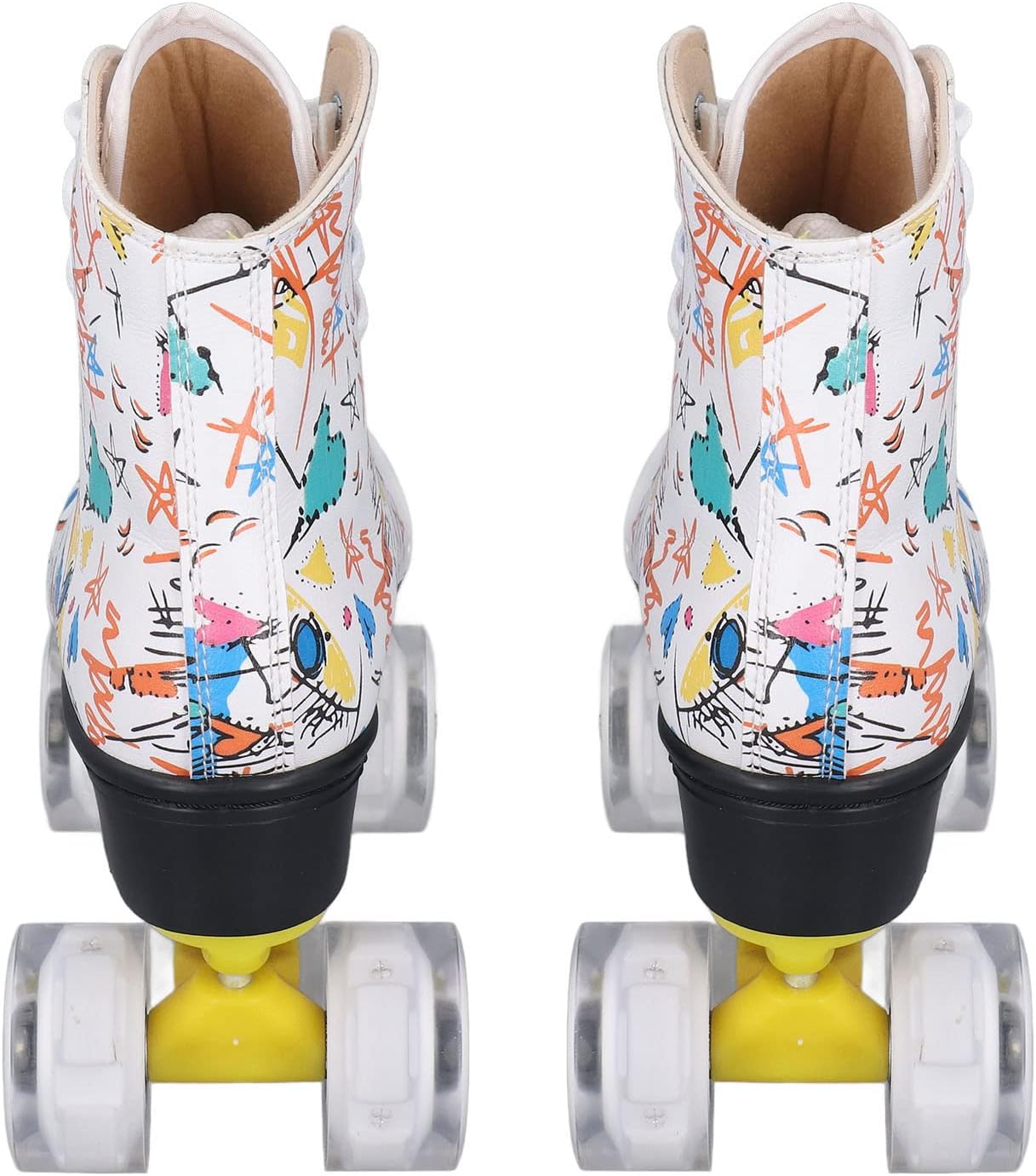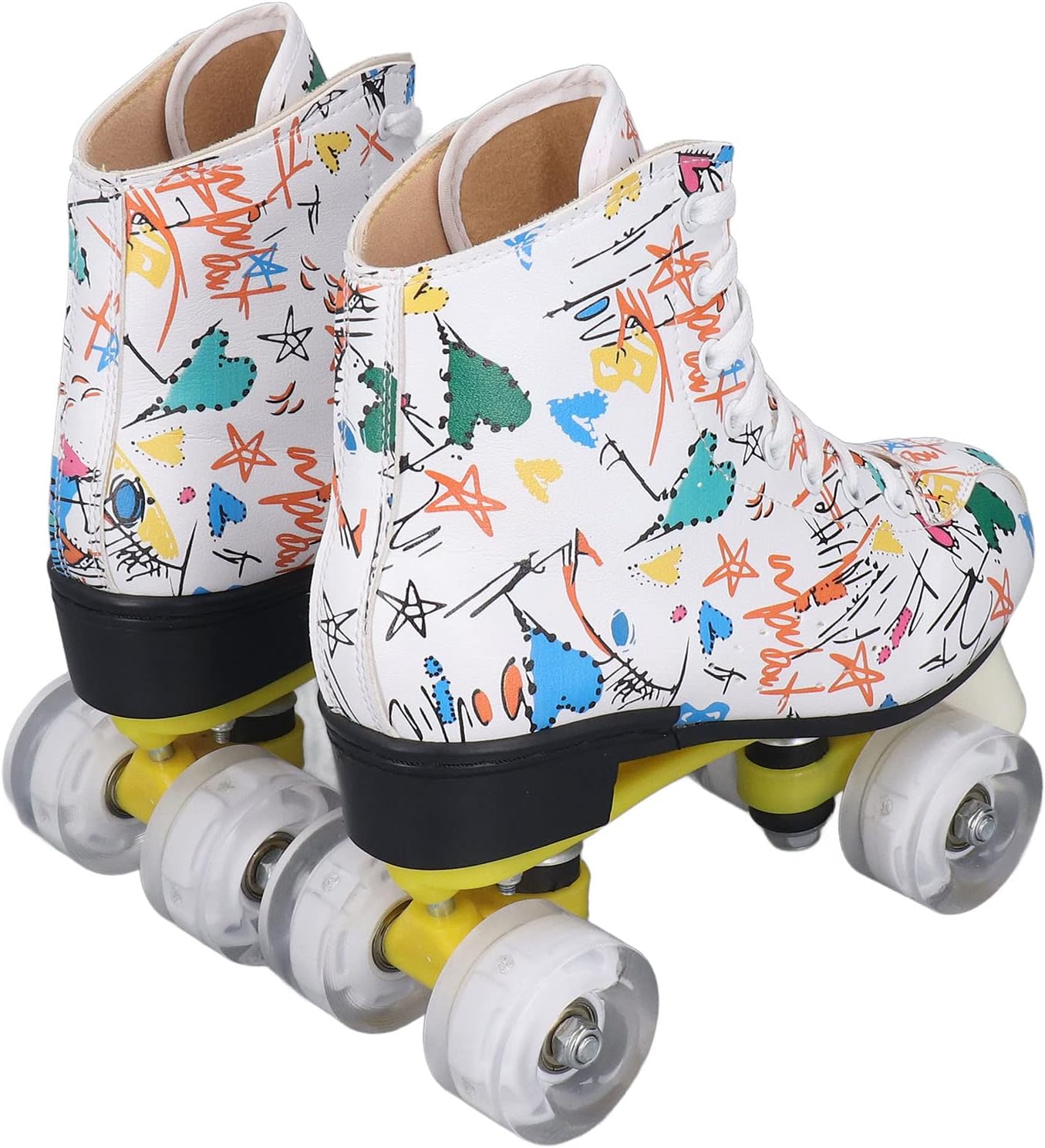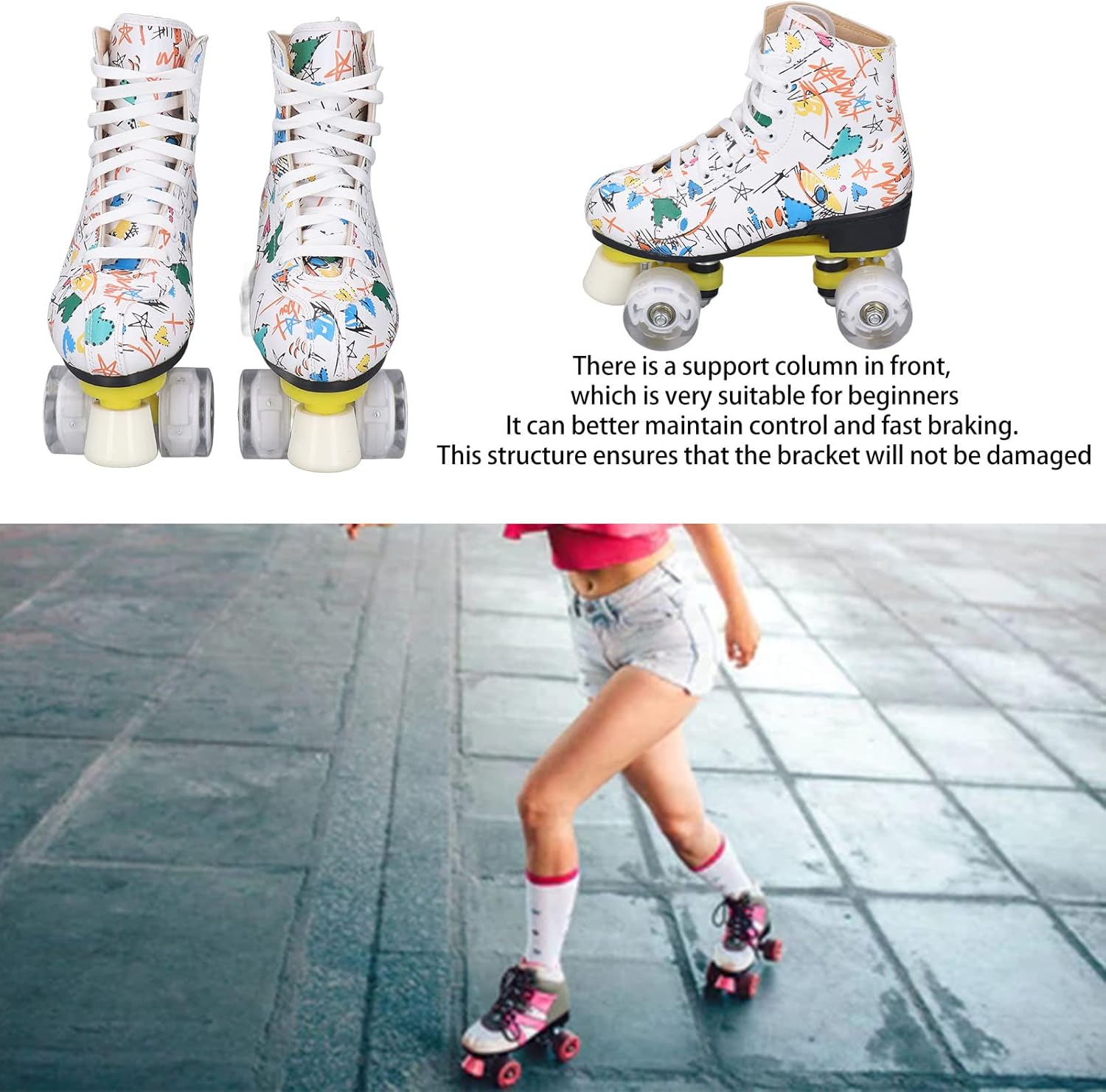 Materiale resistente e durevole: i pattini a rotelle sono dotati di robusti pattini a ruote realizzati con materiali stampati durevoli, che possono fornire prestazioni di pattinaggio sicure e affidabili. Le ruote lucide ti rendono più fresco durante il pattinaggio. Ampie applicazioni: i pattini a rotelle dai colori vivaci sono il per ragazzi, ragazze e fidanzati, fidanzate o familiari. È anche una scelta ideale per pattinaggio indoor e outdo Traspirabilità interna: la traspirabilità interna dei pattini a rotelle a doppia ruota può aiutare i piedi a dissipare rapidamente il calore, prevenire l'odore dei piedi ed evitare il sudore, permettendoti di godere appieno dello scivolamento. Comfort e sicurezza: questi pattini a rotelle utilizzano scarpe alte controllabili per garantire una sicurezza ottimale, mentre i lacci delle scarpe premium offrono la massima protezione per garantire comfort e sicurezza del piede. Colonna di supporto frontale: c'è una colonna di supporto nella parte anteriore, che è molto adatta ai principianti. Può mantenere meglio il controllo e la frenata veloce. Questa struttura assicura che il supporto non venga danneggiato.