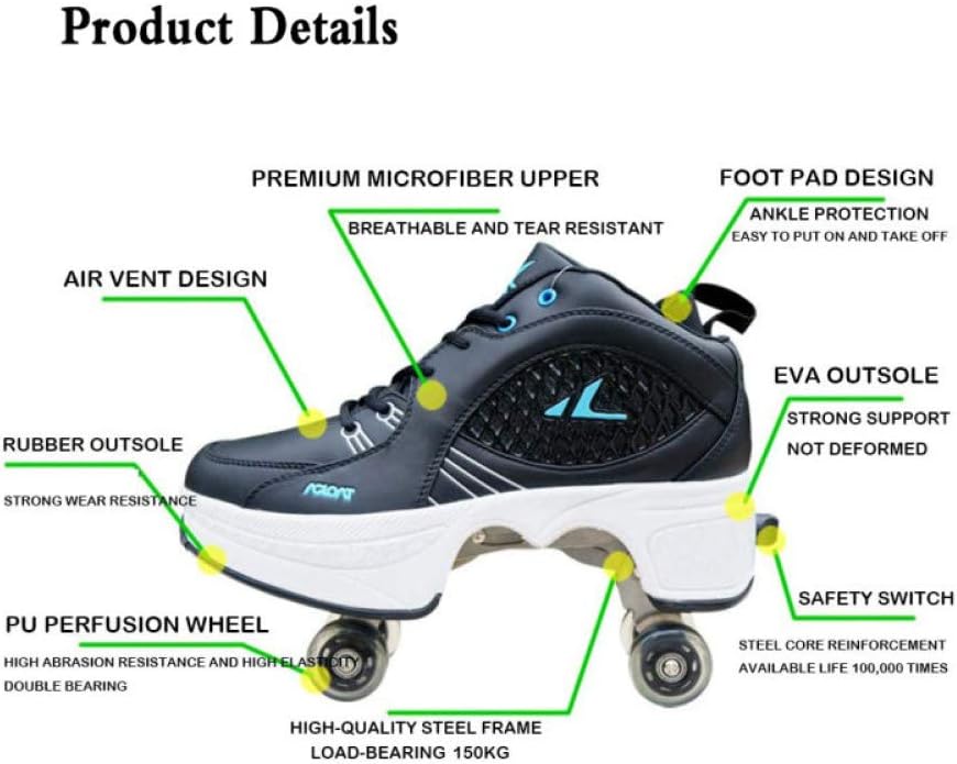 ★ Pattini a rotelle 2 in 1, questa scarpa è diversa dai normali pattini a rotelle sul mercato. Può essere utilizzato non solo per il pattinaggio a rotelle, ma anche per camminare. ★ Materiale: tomaia (microfibra), suola (gomma), materiale della ruota (PU). Usa i lacci tradizionali. Puoi regolare il laccio per scegliere la sensazione più comoda. ★ Secondo il design meccanico, i pattini a rotelle sono stati ripetutamente testati e innovati. ★ Selezione della taglia, la nostra taglia è quella standard. Puoi scegliere la taglia appropriata in base alla tabella delle taglie. Se i tuoi piedi sono un po' larghi, ti consigliamo di scegliere una taglia più grande. ★ Regalo speciale: i pattini a rotelle regolabili multifunzionali sono adatti ad amici di tutte le età, sport unisex. Puoi giocare con amici o bambini o regalarli come regali di Natale.