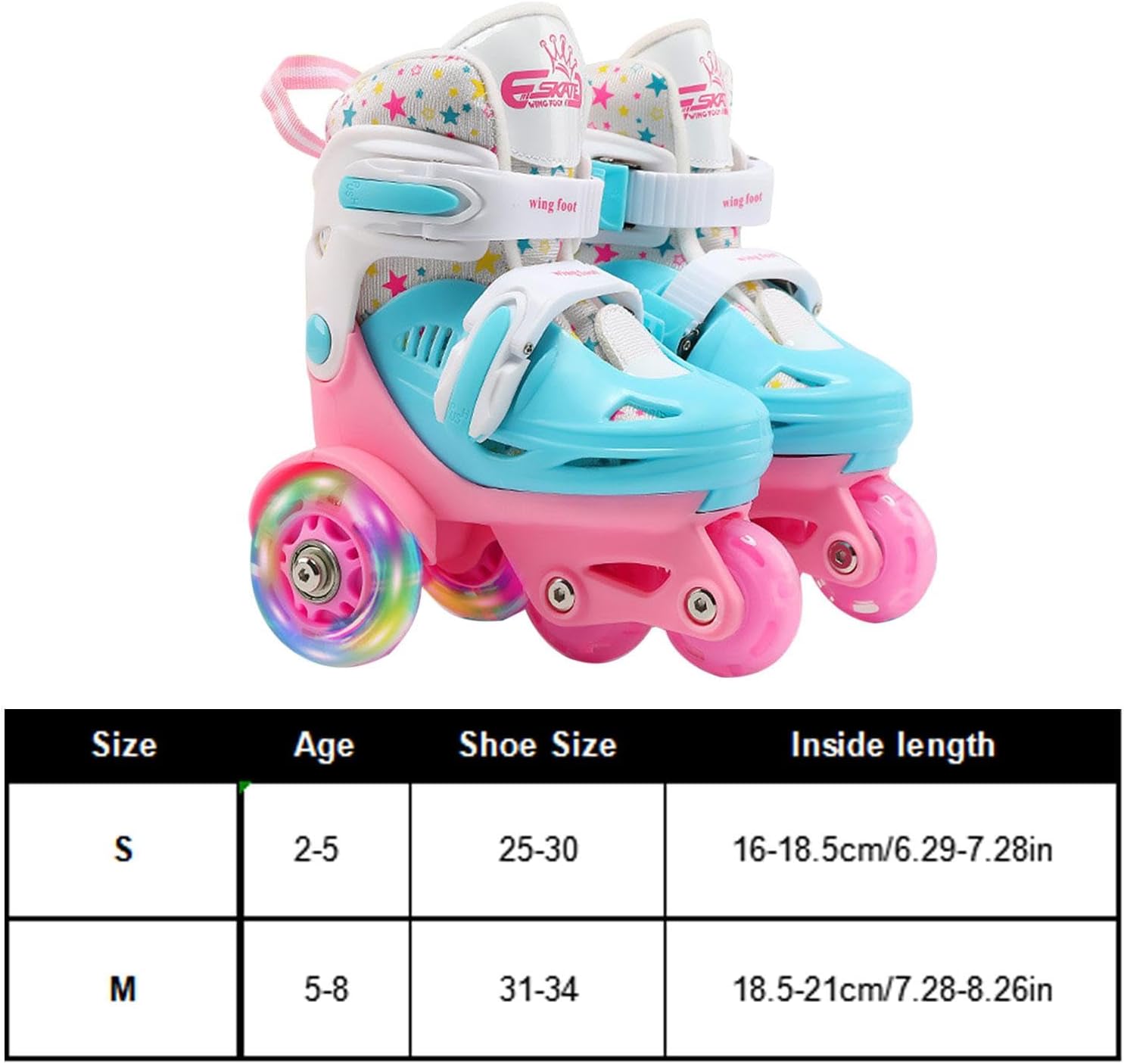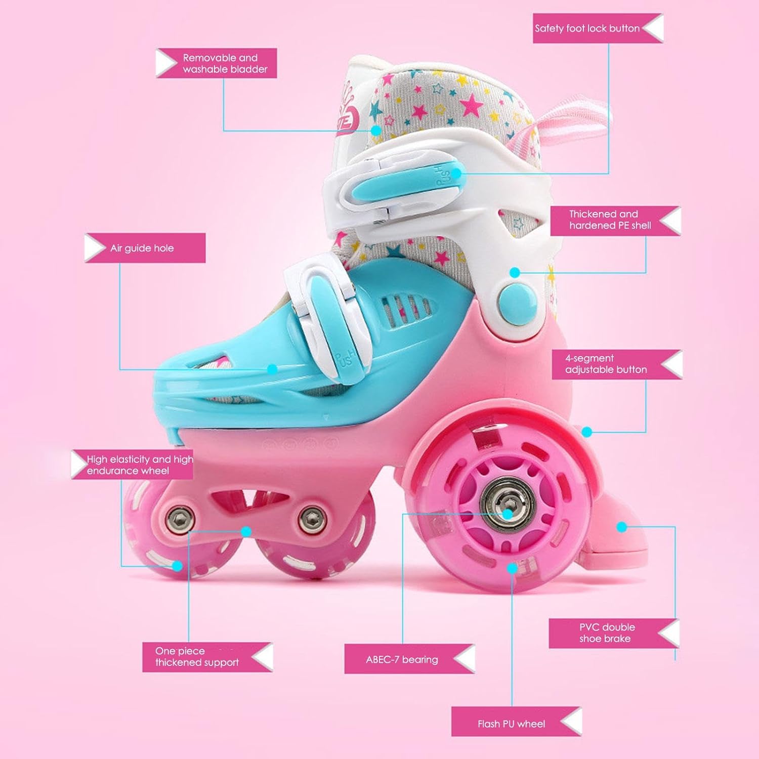 [Dimensione variabile] Le scarpe da skate a rotelle hanno un design regolabile in taglia, più adatto ai bambini in crescita, adatto a bambini dai 2 agli 8 anni. Consulta la nostra tabella delle taglie per vedere i pattini a rotelle adatti ai piedi del tuo bambino, pattini a rotelle in linea regolabili. [Maggiore comfort] Utilizzando cuscinetti selezionati ABEC-7 in acciaio cromato silenzioso per una guida sicura, fluida e silenziosa su un telaio in alluminio rinforzato, il pattino a rotelle per bambini è comodo e sicuro e ha interni morbidi e confortevoli, traspiranti e resistenti. [Altre funzioni] I pattini a rotelle regolabili hanno molte funzioni: i bambini che si allenano regolarmente dormono meglio e hanno un'immunità più forte, permettendo ai bambini di godersi il divertimento dello sport e aiutandoli ad allenare articolazioni e muscoli forti. [La sicurezza prima di tutto] Sicuro e durevole con un elevato fattore di sicurezza di frenata per una migliore usura e una velocità moderata. I pattini a rotelle da esterno sono dotati di freno a doppia scarpa in PVC, incluso un sistema di fibbie di sicurezza a sgancio rapido e ruote ausiliarie a doppia fila per garantire la sicurezza dei bambini. [Buon regalo] I pattini a rotelle per ragazze sono adatti per compleanni, Natale, Ringraziamento e altri giorni speciali, il regalo migliore e premuroso per i bambini, dotati di uno spesso cuscinetto per proteggere le dita dei piedi sulla parte esterna della testa dello stivale.