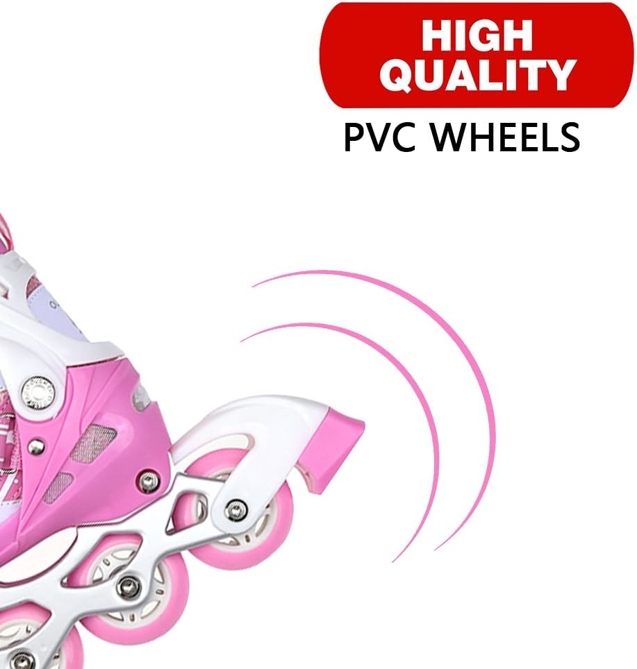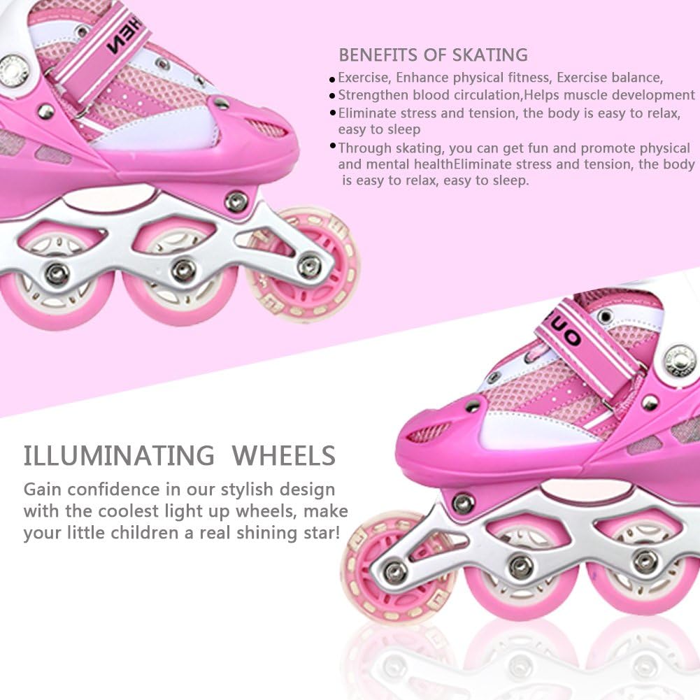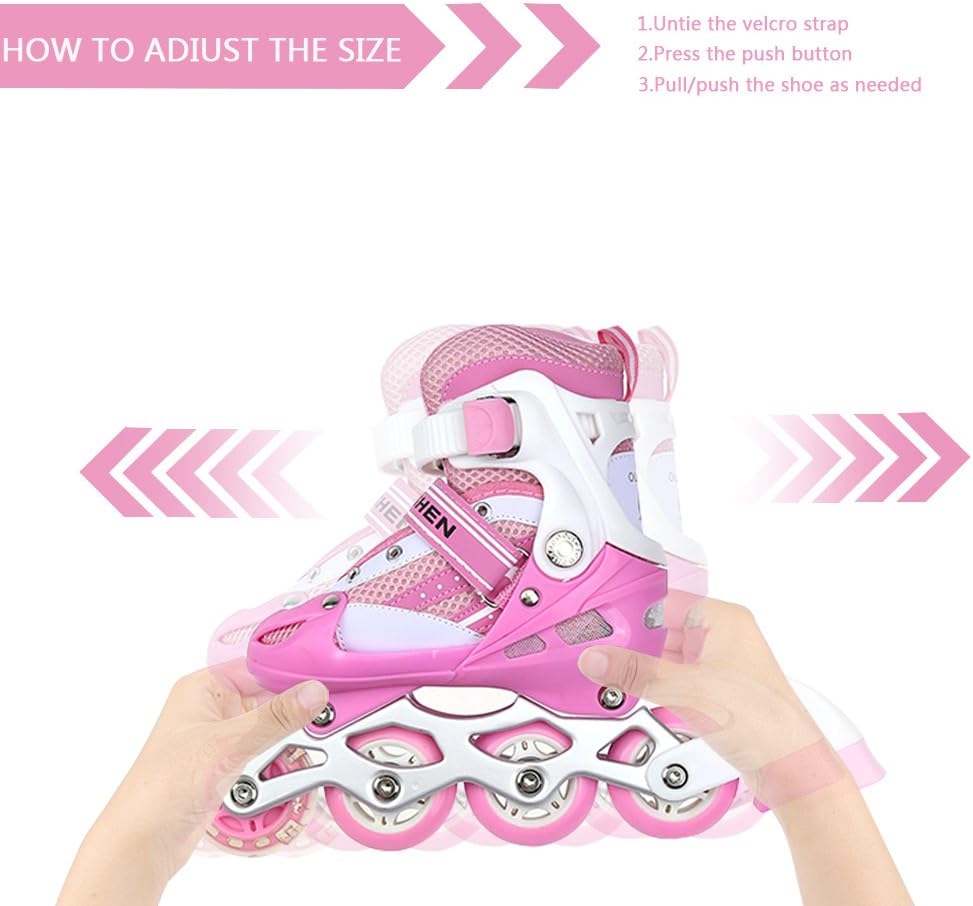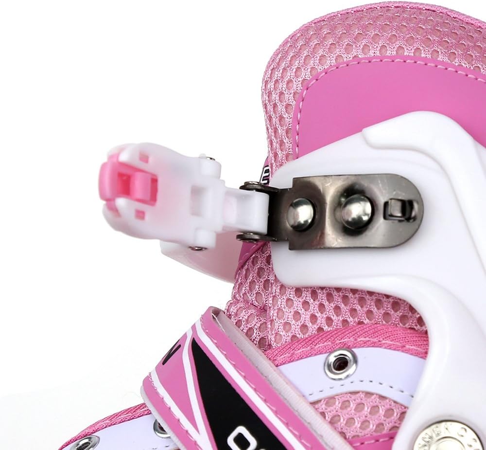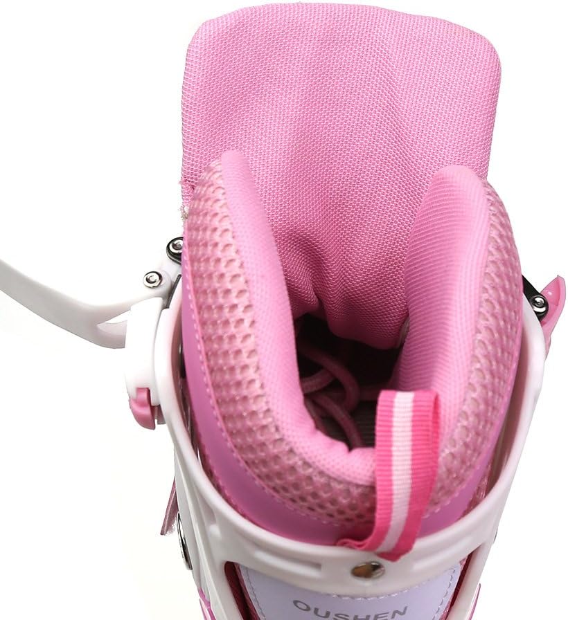 【Pattini a rotelle traspiranti】La tomaia di questo paio di pattini a rotelle per bambini è composta da un materiale semi-morbido e traspirante e una rete sandwich, che può impedire ai piedi del bambino di sudare e mantenerlo traspirante. 【Ruote luminose】8 cuscinetti a ruote allineate permettono al bambino di scivolare liberamente come il vento. Allo stesso tempo, la ruota anteriore brilla, che è più evidente di notte. Ruota singola in PVC, senza elasticità. 【Dimensioni regolabili】C'è un pulsante sul supporto. Tienilo mentre tira o stringi la scarpa per regolare la taglia. Le S/M corrispondono rispettivamente alle taglie 31-34 e 35-38. Questo dipende principalmente dalle dimensioni del bambino e il bambino crescerà molto rapidamente, si prega di controllare la tabella delle taglie prima dell'acquisto. 【Alta Sicurezza】Il supporto in lega di alluminio ad alta resistenza in due parti e il freno sensibile garantiscono la morbidezza e la sicurezza dei pattini in linea. Protezione della caviglia: l'imbottitura interna è super imbottita con una protezione aggiuntiva intorno alla parte superiore della scarpa per pattini che protegge le caviglie dei bambini.