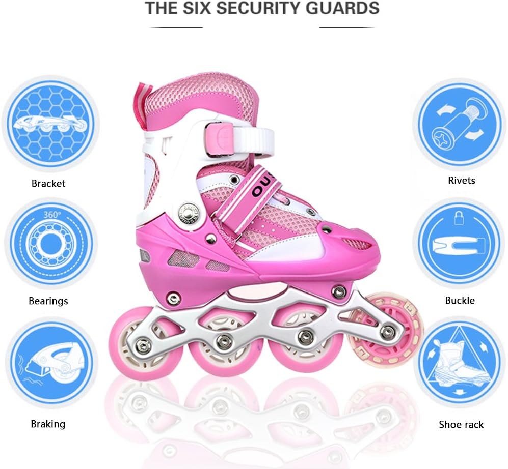 【Pattini a rotelle traspiranti】La tomaia di questo paio di pattini a rotelle per bambini è composta da un materiale semi-morbido e traspirante e una rete sandwich, che può impedire ai piedi del bambino di sudare e mantenerlo traspirante. 【Ruote luminose】8 cuscinetti a ruote allineate permettono al bambino di scivolare liberamente come il vento. Allo stesso tempo, la ruota anteriore brilla, che è più evidente di notte. Ruota singola in PVC, senza elasticità. 【Dimensioni regolabili】C'è un pulsante sul supporto. Tienilo mentre tira o stringi la scarpa per regolare la taglia. Le S/M corrispondono rispettivamente alle taglie 31-34 e 35-38. Questo dipende principalmente dalle dimensioni del bambino e il bambino crescerà molto rapidamente, si prega di controllare la tabella delle taglie prima dell'acquisto. 【Alta Sicurezza】Il supporto in lega di alluminio ad alta resistenza in due parti e il freno sensibile garantiscono la morbidezza e la sicurezza dei pattini in linea. Protezione della caviglia: l'imbottitura interna è super imbottita con una protezione aggiuntiva intorno alla parte superiore della scarpa per pattini che protegge le caviglie dei bambini.