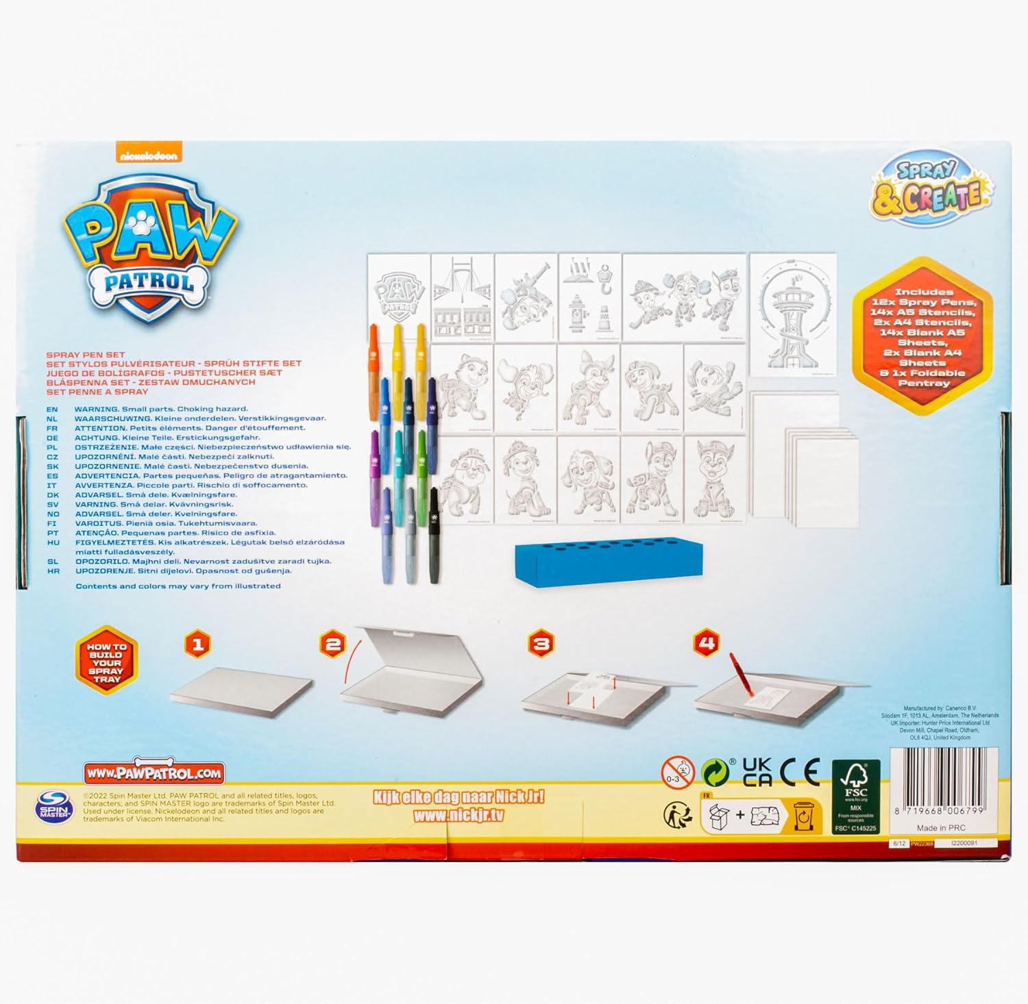 【Set di 28 penne spray】Questo set di penne spray di Paw Patrol è composto da 28 pezzi: 16 stencil e 12 penne spray (penne a pennello) 【Facile da disegnare con l'aiuto di sjablons】Con i 16 diversi stencil Paw Patrol puoi realizzare i disegni più belli. Ogni bambino può farlo. I modelli di disegno sono ovviamente riutilizzabili 【Brush Pen come funziona】Colorare con queste penne a bolle è super facile. Funziona in modo diverso da un pennarello. Puntare la penna a soffiare sul punto che si desidera colorare e soffiare delicatamente sul retro della penna. Puoi anche combinare i colori per far giocare la tua immaginazione 【Figure preferite del Paw Patrol】Con questo set da disegno è facile creare bellissimi disegni dei tuoi personaggi preferiti della Paw Patrol come Chase, Skye e Rubble 【Impara a mescolare i colori】Impara tutto sulla miscelazione dei colori. Puoi usare questi 12 colori di base anche per altri colori. Per fare ciò, segui le istruzioni su come mescolare i colori sulla scatola 【Set da disegno creativo】Il vostro bambino ama disegnare e dipingere con pennarelli o matite. Vuoi provare una forma più creativa di colorare e disegnare? Con questo set di penne spray, il vostro bambino diventerà un vero artista. Età +4 anni