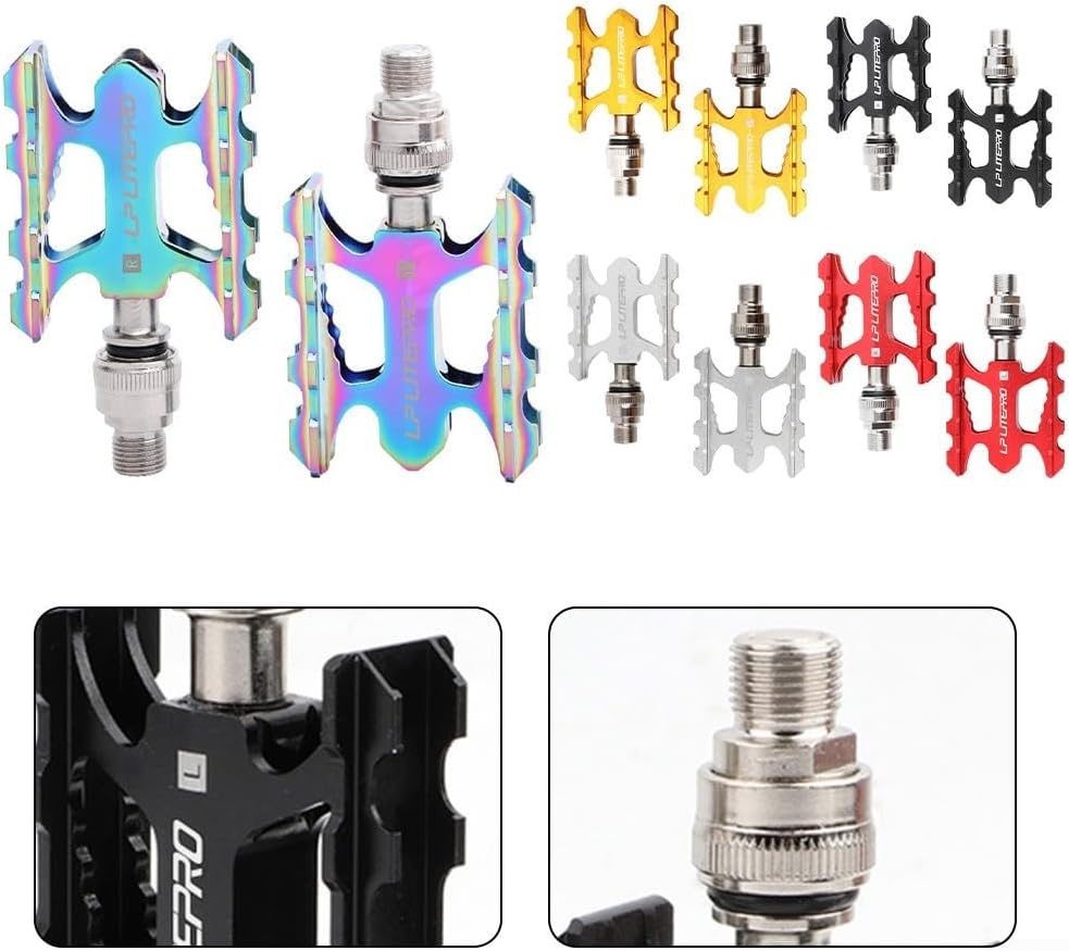 【Ultraleggeri e 】: realizzati in lega di alluminio, questi pedali per bici non sono solo ultraleggeri, ma anche elevati. Sono resistenti ai graffi e all'usura, prestazioni di lunga durata durante le tue corse. Design antiscivolo: dotati di un design antiscivolo per unghie, questi pedali offrono un'esperienza di calpestio più stabile. Sia che tu stia guidando su terreni accidentati o bagnati, la funzione antiscivolo offre un'eccellente presa e migliora la tua sicurezza in bicicletta. 【Liscio ed efficiente】: i pedali sono dotati di cuscinetti DU, che offrono una lubrificazione a risparmio di manodopera per corse più fluide ed efficienti. Il processo di taglio CNC assicura che i bordi siano lisci e il design cavo riduce il peso mantenendo la resistenza. 【Resistente alle intemperie】: con una copertura antipolvere in lega di alluminio, questi pedali impediscono efficacemente l'ingresso di polvere e pioggia, prolungando così la durata complessiva. Puoi guidare con sicurezza in varie condizioni meteorologiche senza preoccuparti di potenziali danni. 【Ampia compatibilità】: questi pedali hanno un diametro di installazione di 14 mm, che li rende adatti per biciclette pieghevoli, mountain bike e bici da strada. Sono inoltre dotati di un meccanismo di sgancio rapido per un facile smontaggio e un comodo utilizzo.