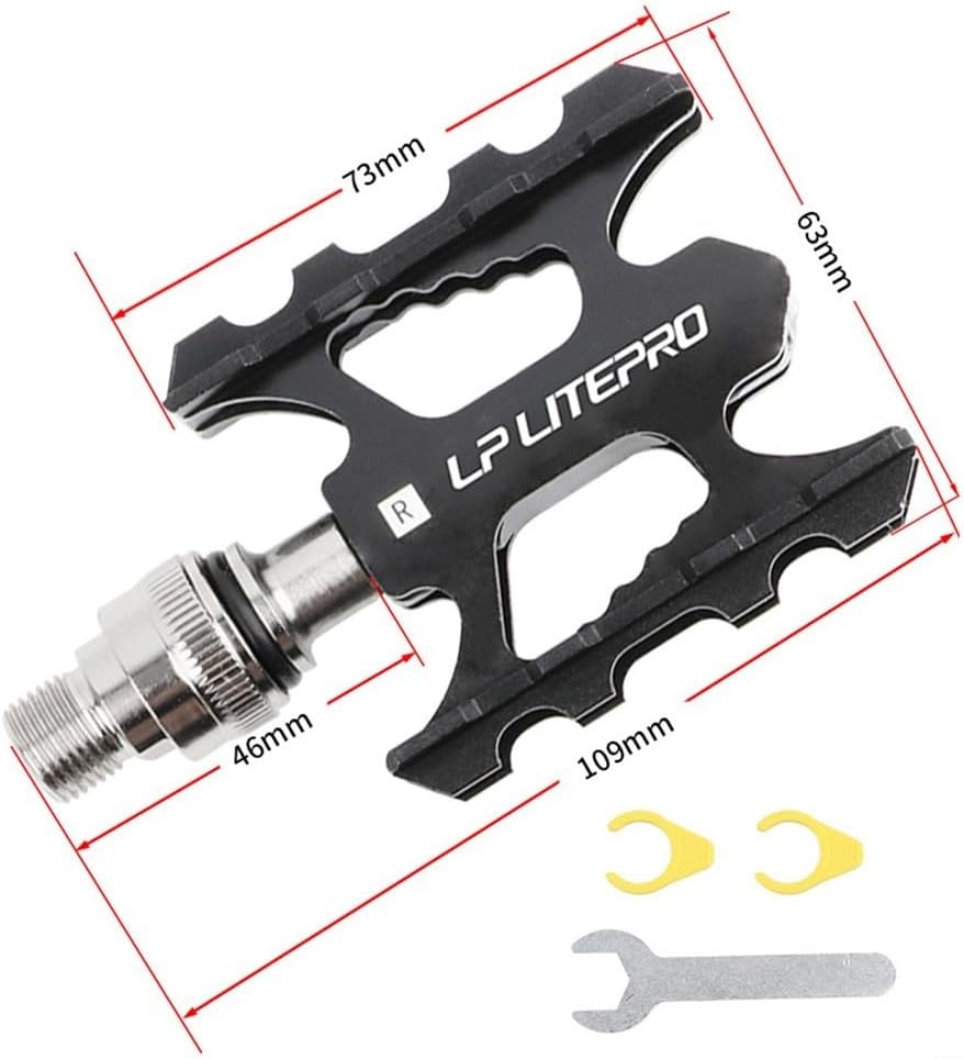 Ultraleggeri e realizzati in lega di alluminio di alta qualità, questi pedali per bici sono leggeri ma allo stesso tempo elevati. Sono resistenti ai graffi, resistenti all'usura e un'esperienza di guida sicura. Cuscinetti sigillati DU antiscivolo: dotati di cuscinetti DU, questi pedali offrono una rotazione fluida e senza sforzo. Il design antiscivolo delle unghie fornisce un calpestio più stabile, offrendo un controllo e una presa ottimali. Copertura antipolvere in lega di alluminio: dotati di una copertura antipolvere in lega di alluminio, questi pedali impediscono efficacemente l'ingresso di polvere e pioggia, prolungando così la durata dei pedali. I pedali rimarranno in ottime condizioni anche in condizioni meteorologiche difficili. Compatibile e con un diametro di installazione di 14 mm, questi pedali possono essere facilmente installati su biciclette pieghevoli, mountain bike e bici da strada. Sono inoltre progettati con un piede a sgancio rapido, che consente un facile smontaggio con la comoda fibbia a sgancio rapido. Taglio CNC: questi pedali sono realizzati con taglio CNC, bordi lisci e un design scavato che riduce efficacemente il peso senza compromettere la resistenza. Goditi prestazioni e comfort migliori con questi pedali per bici.