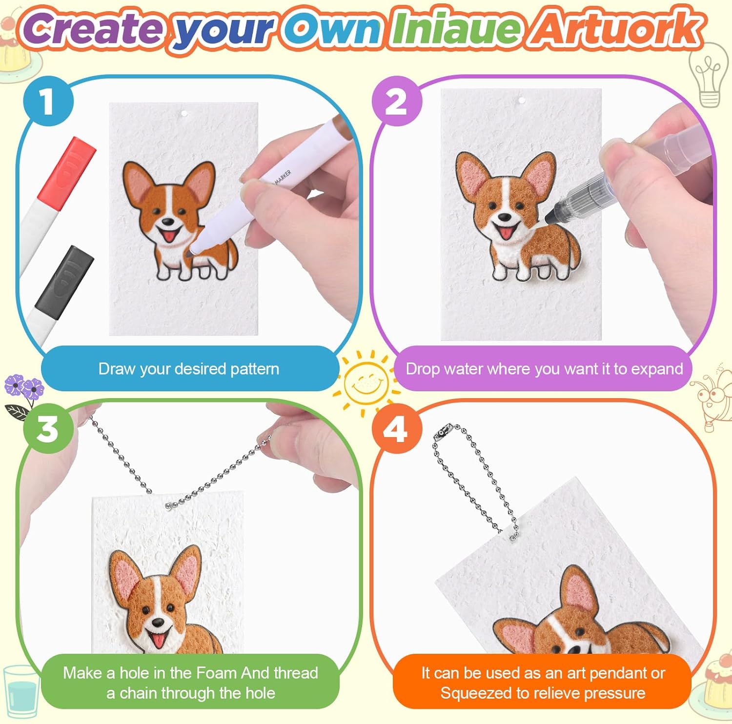 Contenuto del set: Il kit include 10 fogli di carta strutturata in schiuma, 12 pennarelli colorati, 3 pennelli ad acqua di diverse dimensioni, 10 cordini con perline e un mini cavalletto. Nessun materiale aggiuntivo richiesto Espansione magica: La speciale carta in schiuma si espande a contatto con l’acqua, creando automaticamente una trama tridimensionale Crea in 3 semplici passaggi: Disegna il tuo motivo, tocca con il pennello ad acqua e guarda il disegno gonfiarsi in rilievo entro 30 secondi. Facile e divertente per tutti. Stimola la creatività: Il lavoro completato può essere esposto sul cavalletto. La carta si può ritagliare o assemblare, perfetta per creare biglietti 3D, decorazioni festive o etichette personalizzate con i cordini Ideale per molte occasioni: Adatto per attività scolastiche, lavoretti creativi in famiglia, decorazioni natalizie o feste. Un modo coinvolgente per sviluppare manualità e immaginazione