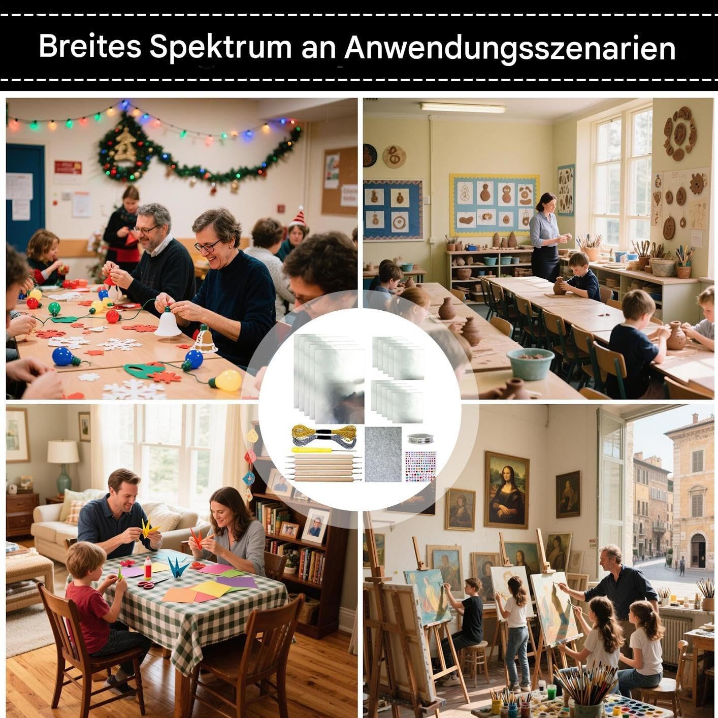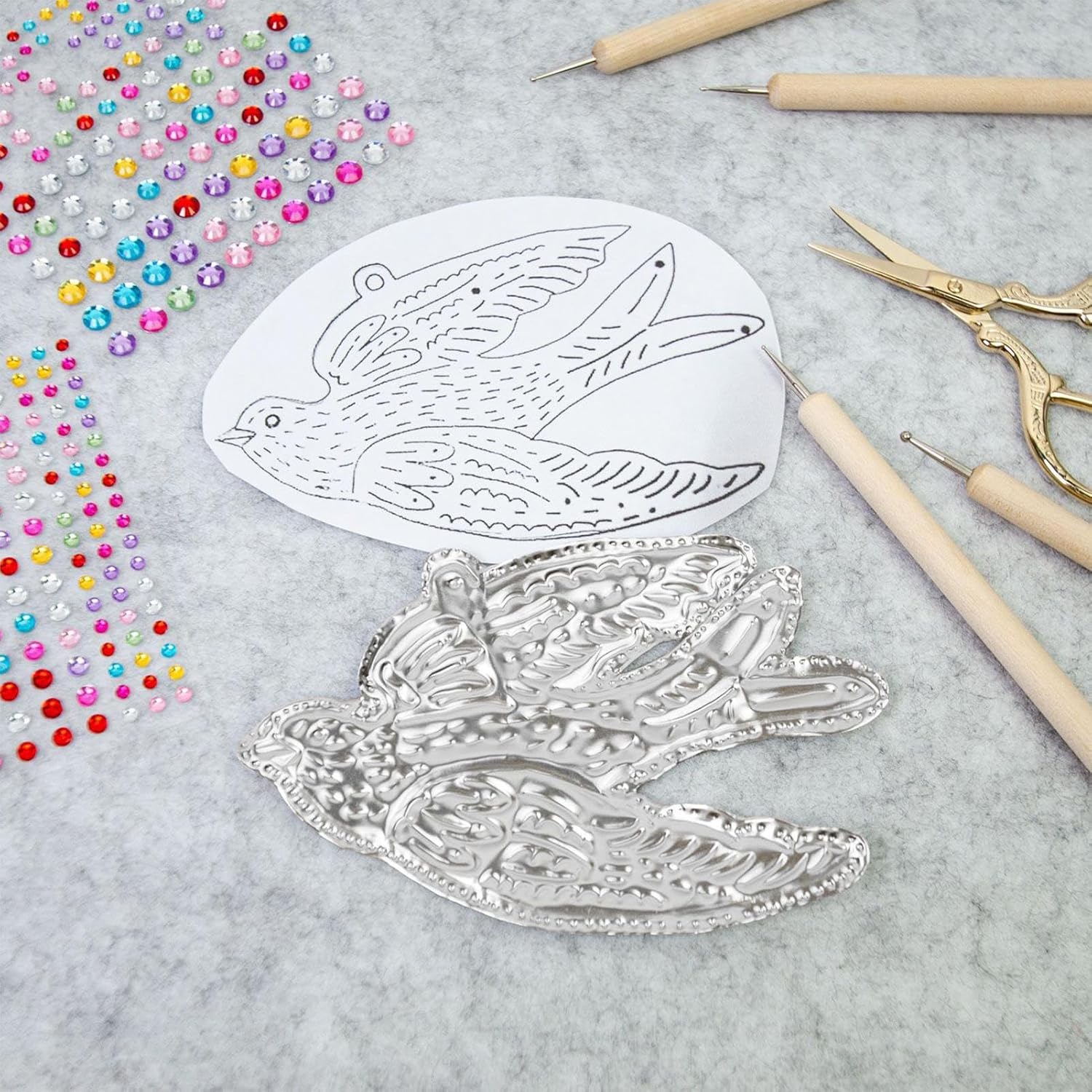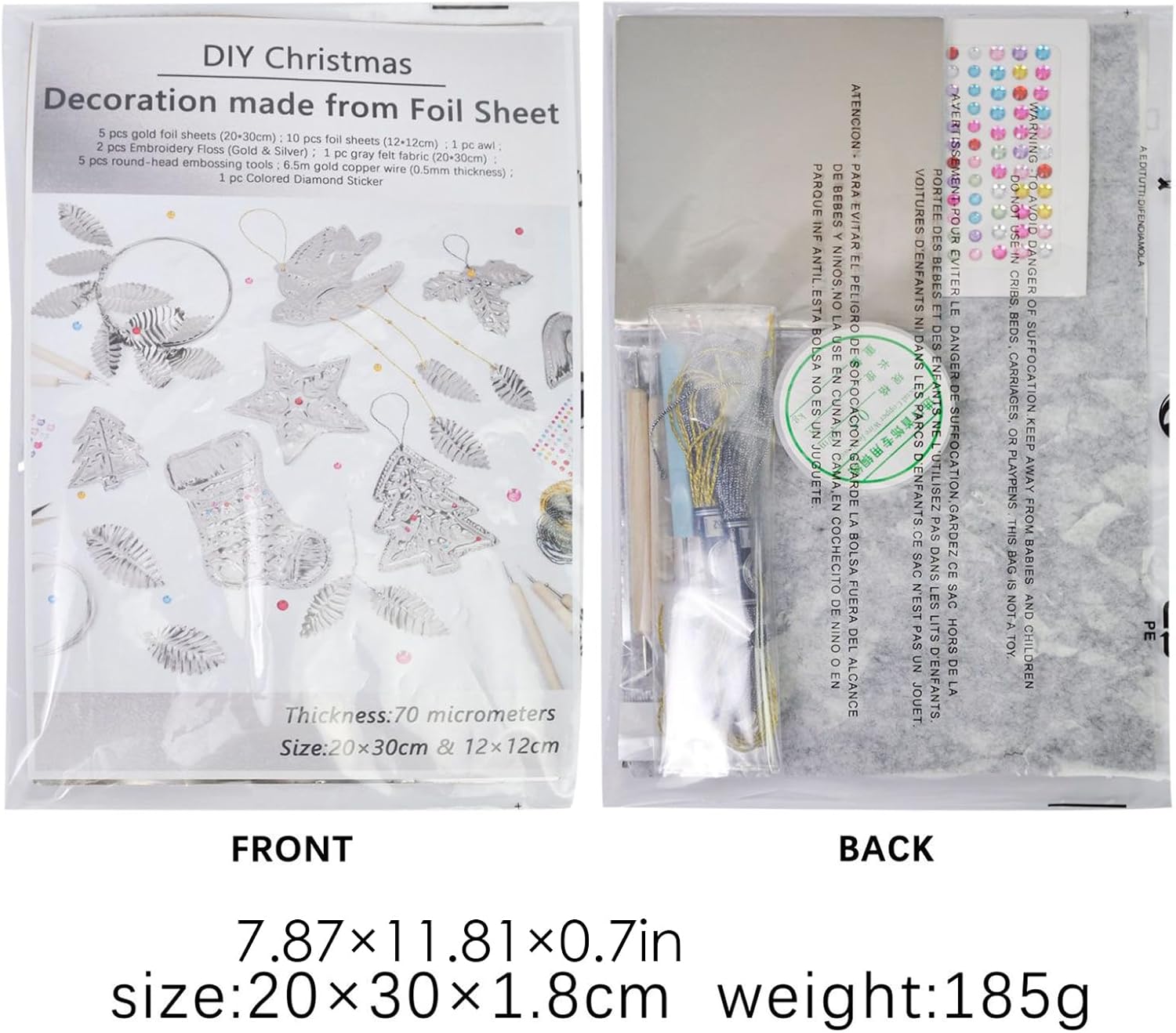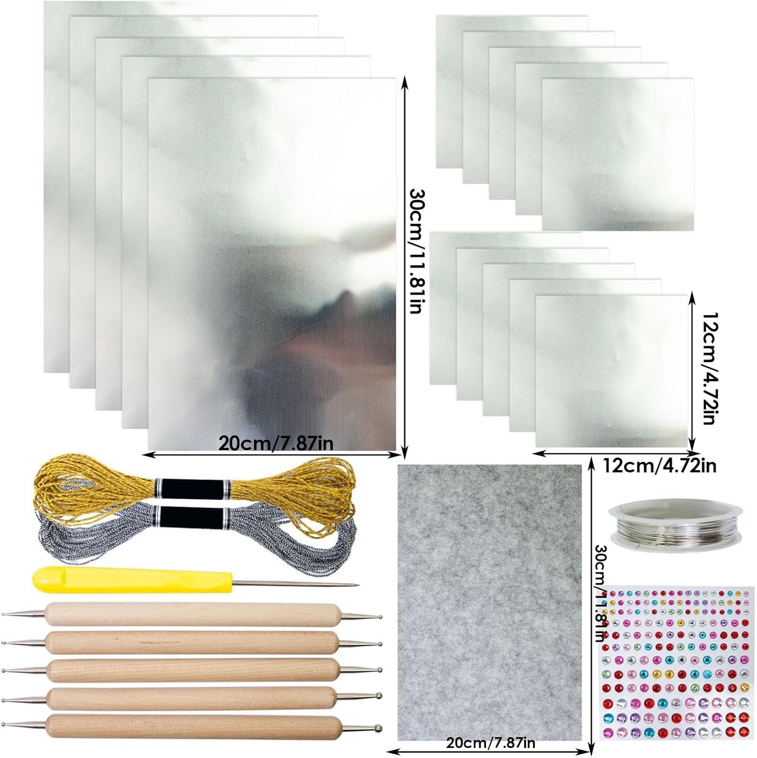 Pacchetto completo di risorse: include 15 pellicole per bricolage in oro o argento, due rulli a filo e speciali strumenti per incisione per creare facilmente e con precisione le pellicole artistiche dettagliate. Pellicola lucida Applicazione: pellicola di alluminio altamente riflettente (circa 0,08 mm) per tutte le tecniche di goffratura e incisione. Motiva a lavori creativi tra le generazioni. Facile lavorazione. Pellicola rinforzata: filo di rame e punti adesivi evidenziano le pellicole artigianali con dettagli accattivanti. Ideale come kit di accessori per progetti con elementi di design personalizzabili. Pratico set di apprendimento: strumenti di goffratura precisi con manico in legno e punteruolo per goffratura, lavori in metallo e progetti di classe. Migliora le esperienze di apprendimento pratico in ambienti creativi. Soluzione creativa: include istruzioni comprensibili per l'uso scolastico e scolastico. Particolarmente adatto per artigianato natalizio e lezioni d'arte. Con base in tessuto non tessuto grigio. Una perfetta scelta regalo per grandi e