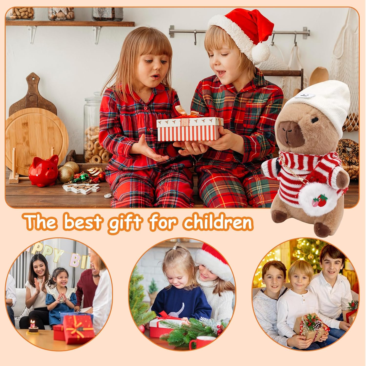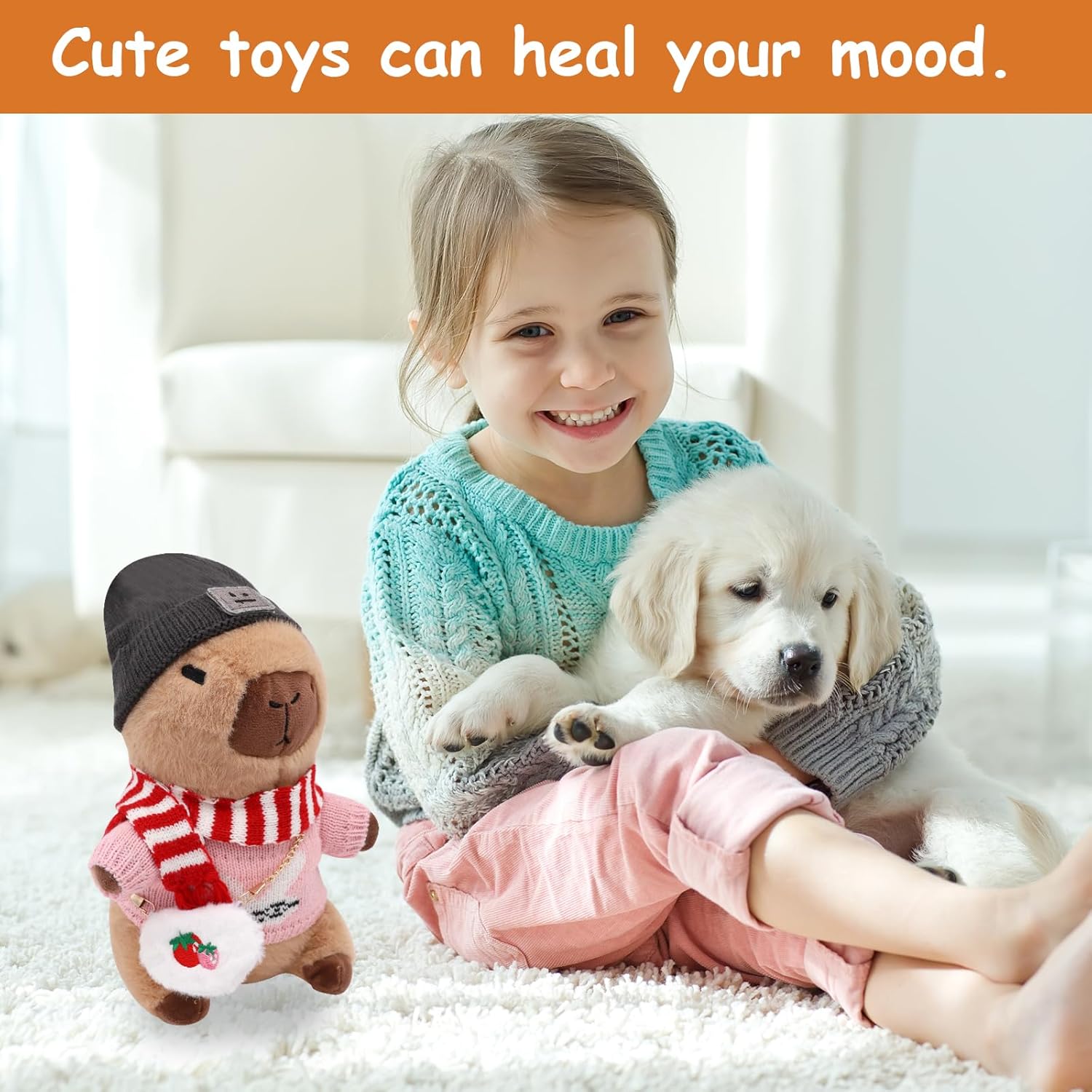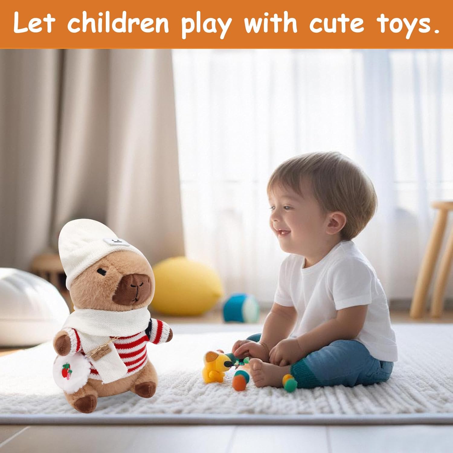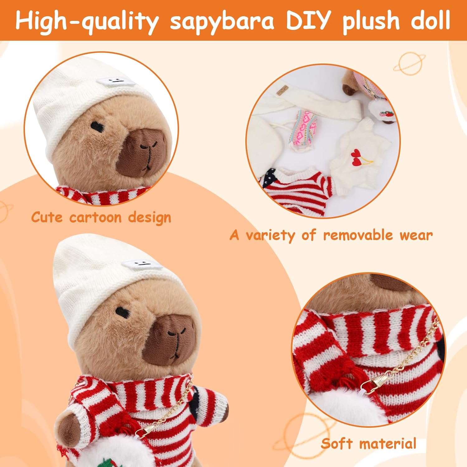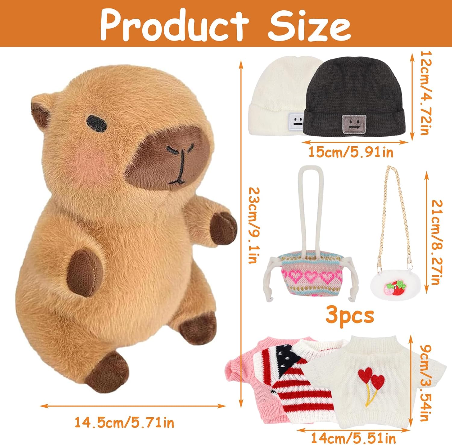 Materiale di alta qualità: peluche Capibara imbottito con piuma sintetica in cotone PP per una vestibilità molto comoda. Meravigliosamente coccoloso e realizzato con materiali sicuri e rispettosi della pelle, questo peluche Capibara è realizzato in tessuto di peluche morbido di alta qualità che è assolutamente fantastico. DESIGN INNOVATIVO Riceverai 12 accessori, 4 indumenti, 4 tasche, 4 cappello. I peluche Capibara sono più piccoli, dimensioni: 23 cm, molto portatili. Questo peluche Capibara ha una forma tridimensionale unica e un'espressione carina che sembra divertente e accattivante, è un ottimo modo per attirare i bambini. Buon compagno Il simpatico peluche Capibara può abbracciare e accompagnare te e i tuoi amici, familiari e bambini, aiutando a rilassare il tuo umore. Con il suo morbido peluche Capibara e la sua forma carina, questo giocattolo conferisce a qualsiasi letto, divano o tavolo un'espressione unica e crea un'atmosfera allegra. MULTIFUNZIONALE Il peluche Capibara piace a tutte le età, dai bambini piccoli agli adulti, ed è perfetto per camere da letto, soggiorni e uffici. Il morbido peluche Capybara non solo dà vita all'arredamento quotidiano della casa, ma funge anche da piccolo compagno in movimento UN REGALO ADORABILE PER TUTTI Il suo aspetto squisitamente progettato è la scelta perfetta per compleanni, Natale e Ringraziamento. Con le sue caratteristiche squisitamente progettate, è un must per un comfort extra e una gioia per la famiglia, gli amici e i bambini.