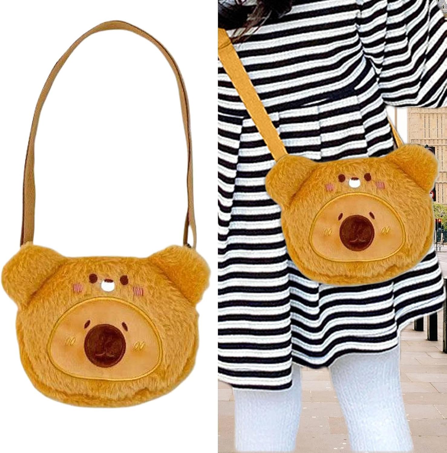Design divertente e adorabile di capibara: questa bambola di peluche ha la forma di un simpatico capibara dei cartoni animati, rendendola un accessorio giocoso e accattivante. Perfetto per gli amanti degli animali, i bambini o chiunque ami la moda eccentrica e unica. Opzioni di archiviazione versatili: la borsa ha un interno compatto e spazioso ed è ideale per riporre piccoli oggetti come angoli, chiavi, carte e monete. È la soluzione perfetta se vuoi organizzare i tuoi oggetti mentre sei in movimento. CINTURINO REGOLABILE PER IL COMFORT: La cerniera presenta una tracolla regolabile che ti consente di indossarla comodamente come borsa a tracolla. Il morbido peluche lo rende leggero così puoi indossarlo durante il giorno senza sforzo. Morbido e resistente: realizzato in tessuto felpato di alta qualità, il Capybara è morbido e protegge i tuoi effetti personali. E' ideale per bambini e adulti che desiderano un accessorio divertente e funzionale. Regalo perfetto per gli amanti degli animali: che si tratti di un compleanno, di una vacanza o di un'occasione speciale, questa borsa in peluche capibara è un regalo eccellente. Il design giocoso e le caratteristiche pratiche delizieranno sicuramente i tuoi animali domestici e adoreranno questi accessori unici.