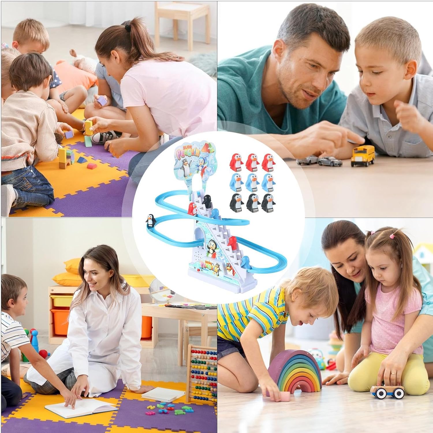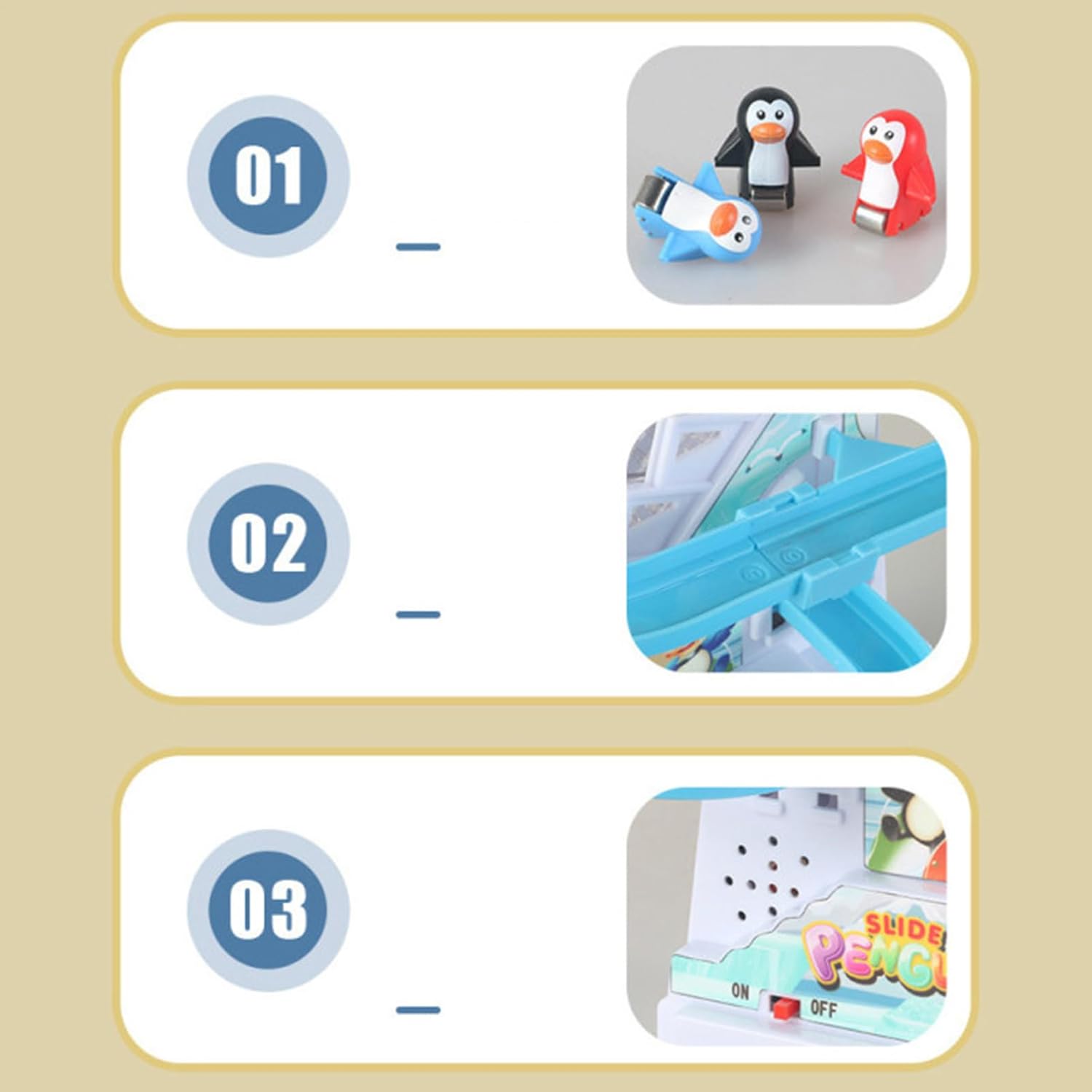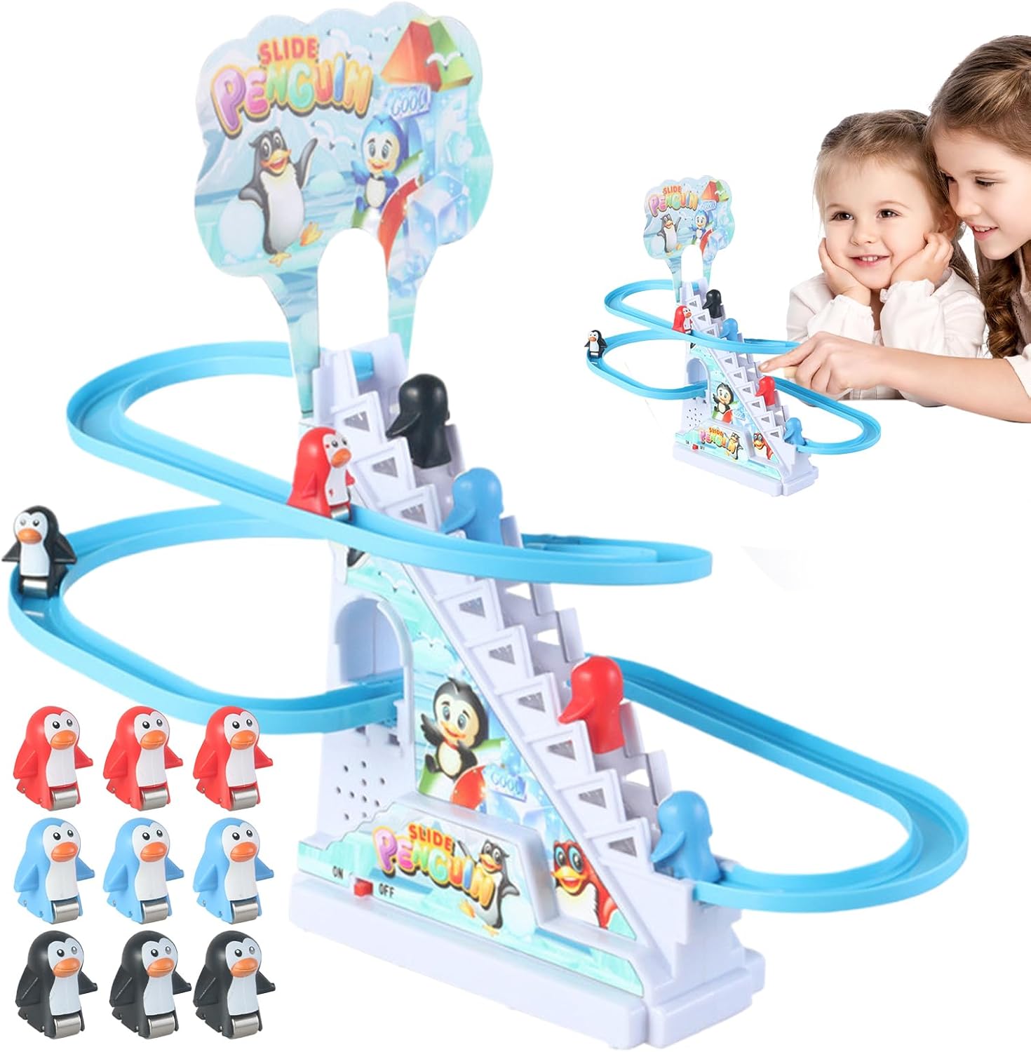 Interactive Penguin Race: Our Penguin Slide Toy sparks creativity as kids watch playful penguins race down the rails of this exciting game. With an interactive, thrilling experience, this toy ensures hours of fun for your child, encouraging laughter and participation Create a Merry Atmosphere: As the penguins slide down, vibrant lights and cheerful sounds feature lively music and flashing LEDs, creating a festive atmosphere and adding excitement to any celebration Entertaining Penguin Playset: Encourage your child's active play with the captivating Penguin Slide Toy that promotes hand-eye coordination and social interaction. Watch as they race, slide, and glide penguins around the track with friends or family, creating an engaging and interactive playset that's fun for all ages Effortless Setup: The Penguin Slide Toy boasts a simple battery-operating design that's easy to install, and batteries can be easily replaced for extended play time. Enjoy easy assembly at home or outdoors, and ensure more fun and excitement that starts immediately Creative Outlet: This penguin slide toy with its colorful race track and engaging interactive features makes a perfect present for the winter season. Delighting kids of all ages, it's a perfect way to add festive cheer and fun to any occasion