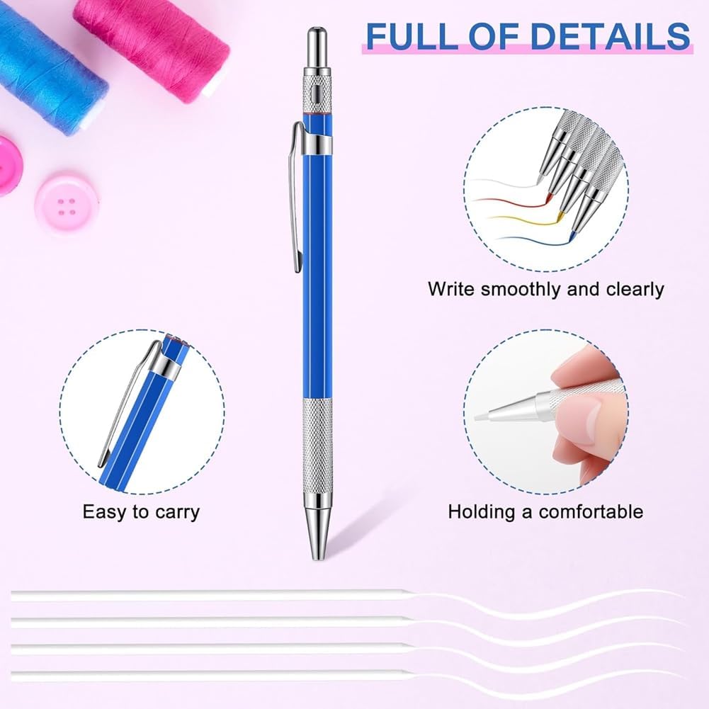Riceverai una penna per gesso da 2 mm e quattro mine per gesso in tessuto nei colori rosso, blu, giallo e . Più pratico del necessario, set ricco, sufficiente per molteplici usi. Questo gesso per tessuti è il tuo compagno perfetto quando cuci e disegna senza sforzo linee chiare e sottili su tessuti e altri materiali. Funziona bene per il buio e i vestiti. È anche molto utile quando si delinea il contorno dello stencil. I nostri gessetti ricaricabili possono essere facilmente rimossi dalla maggior parte dei tessuti strofinandoli delicatamente con un panno umido o lavandoli. Proteggi il tuo tessuto dallo sporco, non lasciare segni sul tessuto durante la marcatura e nessuna macchia sulle mani. Le nostre ricariche in tessuto sono dotate di tappo di sicurezza e scatola in plastica. Il gesso ricaricabile può essere premuto per proteggere bene la punta della penna. Ciò protegge il prodotto quando non viene utilizzato e garantisce una marcatura precisa, movimenti fluidi e un disegno più fluido, chiaro e dritto. I nostri pennarelli per tessuti possono essere utilizzati sulla maggior parte dei capi di abbigliamento. Hanno colori chiari, sono facili da contrassegnare con una leggera pressione e sono adatti per la maggior parte dei tessuti come cotone, pelle, feltro, ecc. Usa i pennarelli a vernice da applicare ai tuoi progetti creativi.