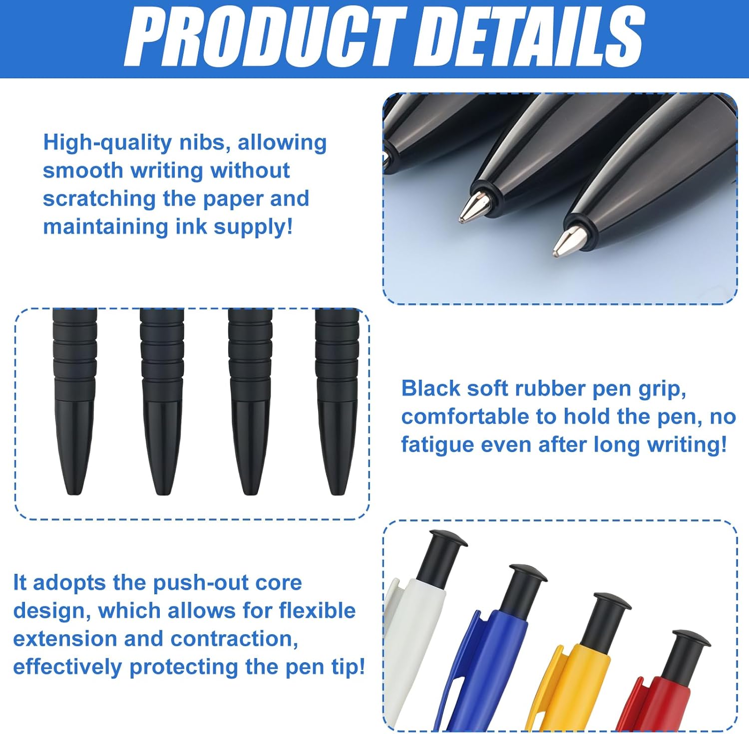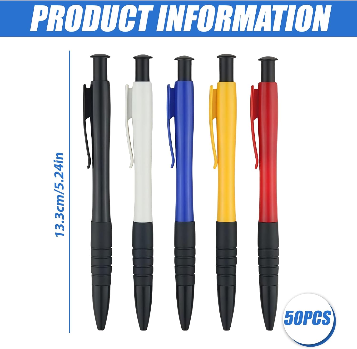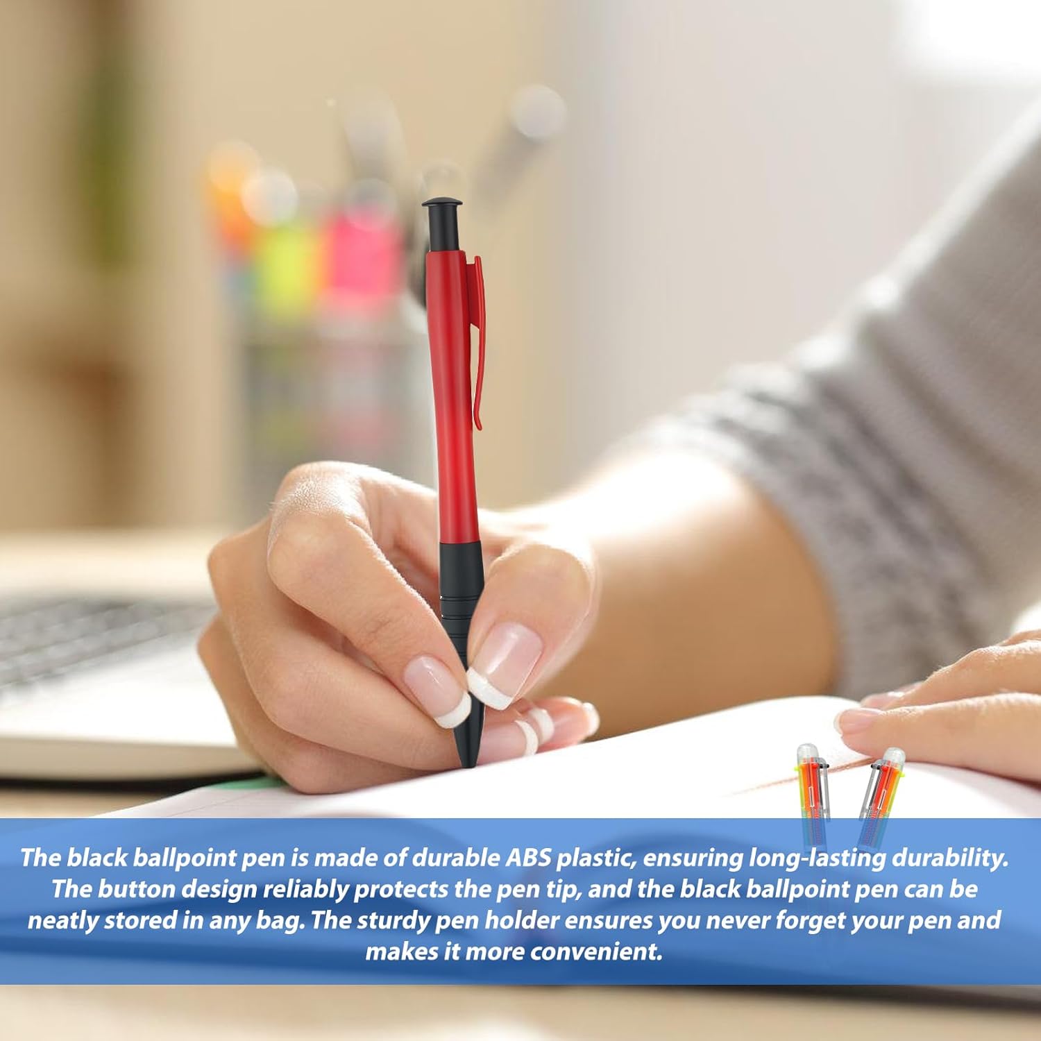 [Esperienza di scrittura precisa e fluida] La penna a sfera nera ha una punta rotonda da 0,7 mm per un flusso di inchiostro uniforme. Questa penna a sfera nera con meccanismo a pressione da 50 pezzi garantisce una piacevole sensazione di scrittura. Il robusto fusto in plastica ABS e la sensazione di scrittura liscia della penna a sfera nera sono ideali per l'uso quotidiano. [Impugnatura ergonomica confortevole] Ogni penna a sfera nera ha un manico nero morbido per una scrittura confortevole anche dopo un uso prolungato. La superficie ergonomica e strutturata è facile da tenere in mano e permette di prendere appunti precisi al lavoro, a scuola o a casa. La penna a sfera nera previene efficacemente l'affaticamento della mano. [Pratica confezione multipla per scrittura multipla] Questo set di 50 penne a sfera nere è perfetto per il lavoro di squadra, appunti di lezione o collezioni domestiche. Oltre alla penna a sfera nera, ci sono diversi colori tra cui scegliere, che consentono una facile selezione e organizzazione dei colori. Questo set meccanismo a pressione penna a sfera nero facilita il lavoro strutturato. [Durevole] La penna a sfera nera è realizzata in robusta plastica ABS ed è durevole. Il design con bottone a pressione protegge la punta in modo affidabile, mentre la penna a sfera nera trova spazio in ogni borsa. La robusta clip assicura che non perderai mai più la penna, rendendola ancora più pratica. Versatile e durevole: sia come penna a sfera nera per esami, appunti quotidiani o come penna a sfera per ufficio, questo set di penne a sfera è perfetto per ogni occasione. È versatile - dalla scuola all'ufficio - e il suo design leggero e compatto lo rende comodo da trasportare.