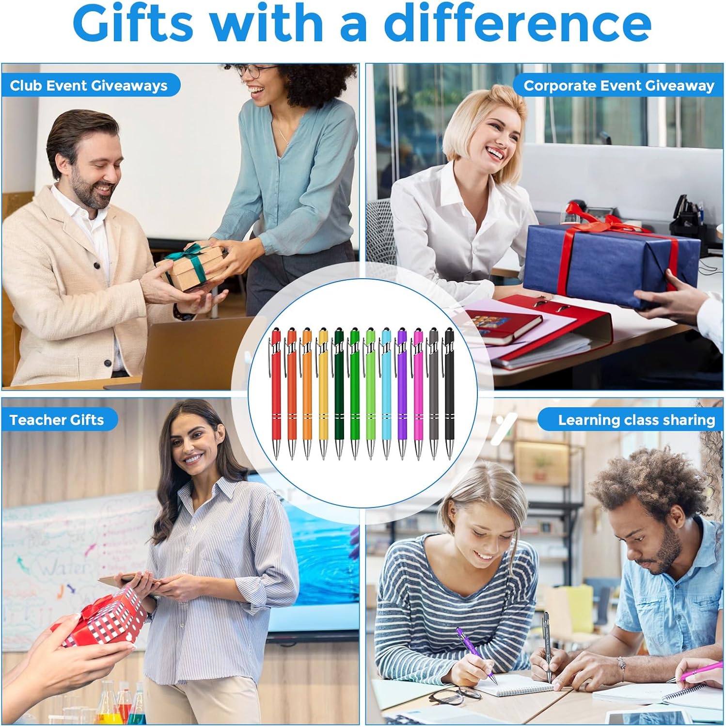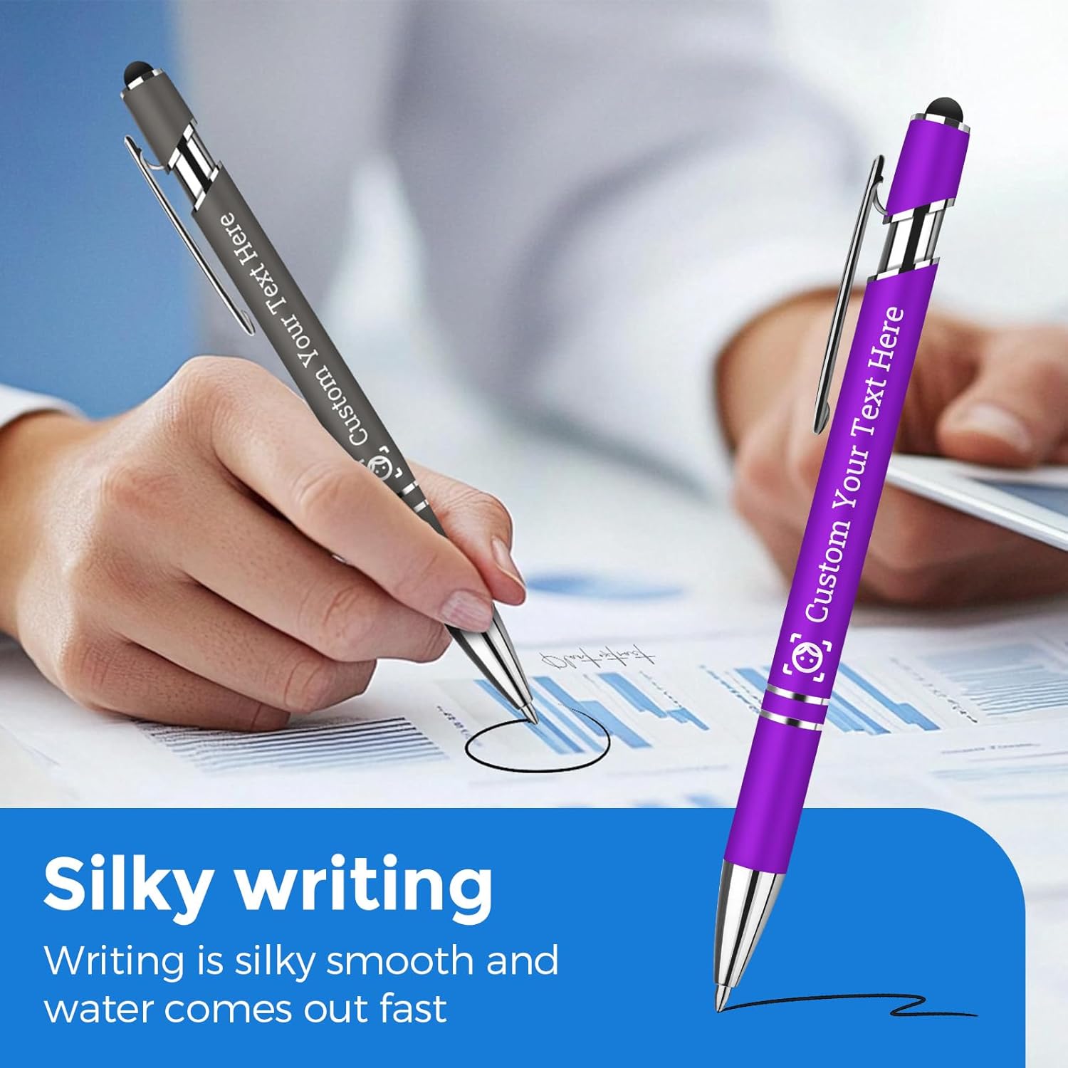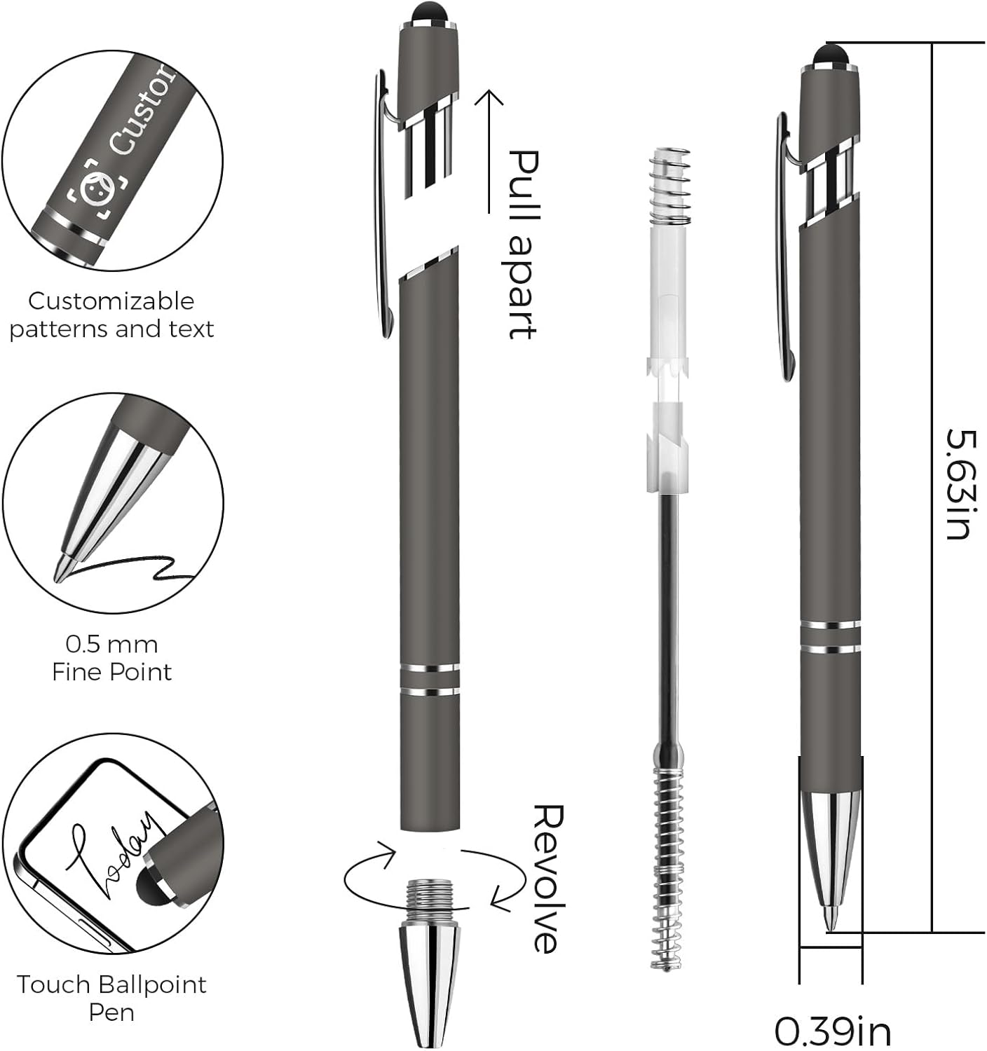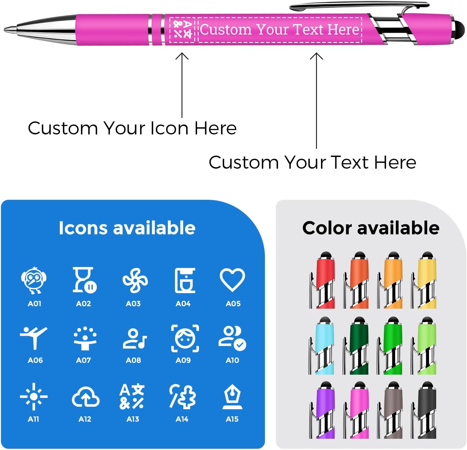 【Corpo personalizzabile: testi e icone su misura】 Inserisci testo su 2 righe (massimo 40 caratteri) + scegli tra icone personalizzabili, Ideale per regali aziendali o souvenir esclusivi. 【Penna a sfera a pressione con punta touch】 Meccanismo a pressione senza cappuccio: una punta per scrivere con precisione e un'estremità touch compatibile con qualsiasi schermo touchscreen (smartphone, tablet, device). Ottima per l'uso quotidiano, in ufficio o durante i viaggi. 【Corpo in metallo robusto con finitura antiscivolo】 Materiale durabile in metallo rivestito in vernice morbida, che garantisce comfort nella mano, resistenza alle usure quotidiane e una scrittura fluida anche dopo un uso prolungato grazie alla finitura antiscivolo. 【12 colori vivaci per esprimere il tuo stile】 Scegli tra una vasta gamma di tonalità, dai colori classici a quelli moderni, per accontentare ogni gusto e esprimere la tua individualità. 【Regalo unico per ogni occasione】 Possibilità di stampare nomi, logo, messaggi o date su richiesta: perfetta per eventi corporate, graduation gifts, o come souvenir personalizzato. Facile da regagliare in qualsiasi contesto.