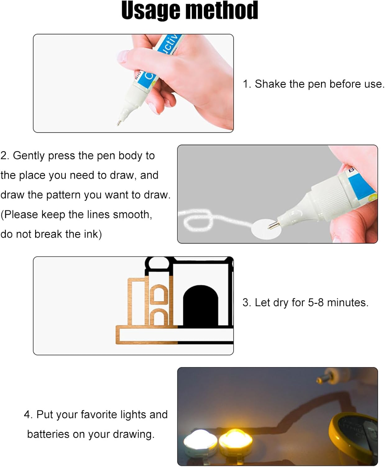Eccellente conduttività. Il componente principale di conduttività adotta polvere metallica conduttiva mista di rame. Può condurre elettricità in due o tre minuti dopo l'asciugatura. Caratteristiche: Forte adesione superiore, facile da usare. Una volta rivestito, il manufatto forma rapidamente, in pochi minuti, una pellicola metallica conduttiva. Quindi puoi collegare le luci LED colorate o le batterie alle piste da pittura. Nota: agitare delicatamente la penna prima dell'uso. E mantienilo stabile e dipingi senza interruzioni. Versatilità, praticità. Ampia gamma di applicazioni: insegnamento della fisica, progettazione di circuiti, circuiti, esperimenti di circuiti, produzione di schede musicali e altro ancora. Materiali di verniciatura disponibili: cartone, vetro, ABS, PVC, PC, HIPS e altre plastiche. Nota, conservazione: asciugatura all'aria: asciugatura all'aria naturale entro 5-10 minuti. Migliore conduttività elettrica quando completamente asciutto. Lo spessore del film di vernice non è inferiore a 20 micron. Tenere lontano dalla luce del sole. Si prega di chiuderlo dopo l'uso. Portatile. Lunghezza: 12,7 cm Leggero e facile da trasportare. Molto stabile. Puoi immaginare le linee dipinte con fili liquidi conduttivi e puoi combinare la tua creatività per disegnare schemi di circuiti.