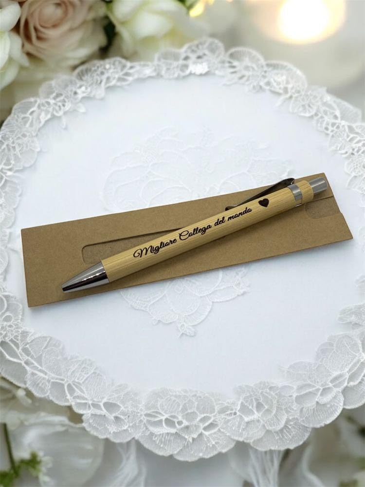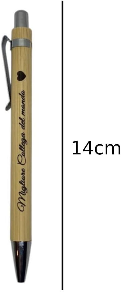 DESIGN ELEGANTE: Penna artigianale realizzata con materiali naturali, con incisione personalizzata 'Migliore Collega del Mondo' REGALO PERFETTO: Ideale come regalo per colleghe di lavoro, adatta per occasioni speciali come anniversari e festività natalizie SCRITTURA FLUIDA: Meccanismo di scrittura scorrevole che garantisce un'esperienza di scrittura confortevole e precisa CONFEZIONE REGALO: Presentata in un'elegante confezione regalo che ne esalta la preziosità e il significato DIMENSIONI PRATICHE: Lunghezza totale di 13,5 cm, peso bilanciato per una presa ottimale durante la scrittura
