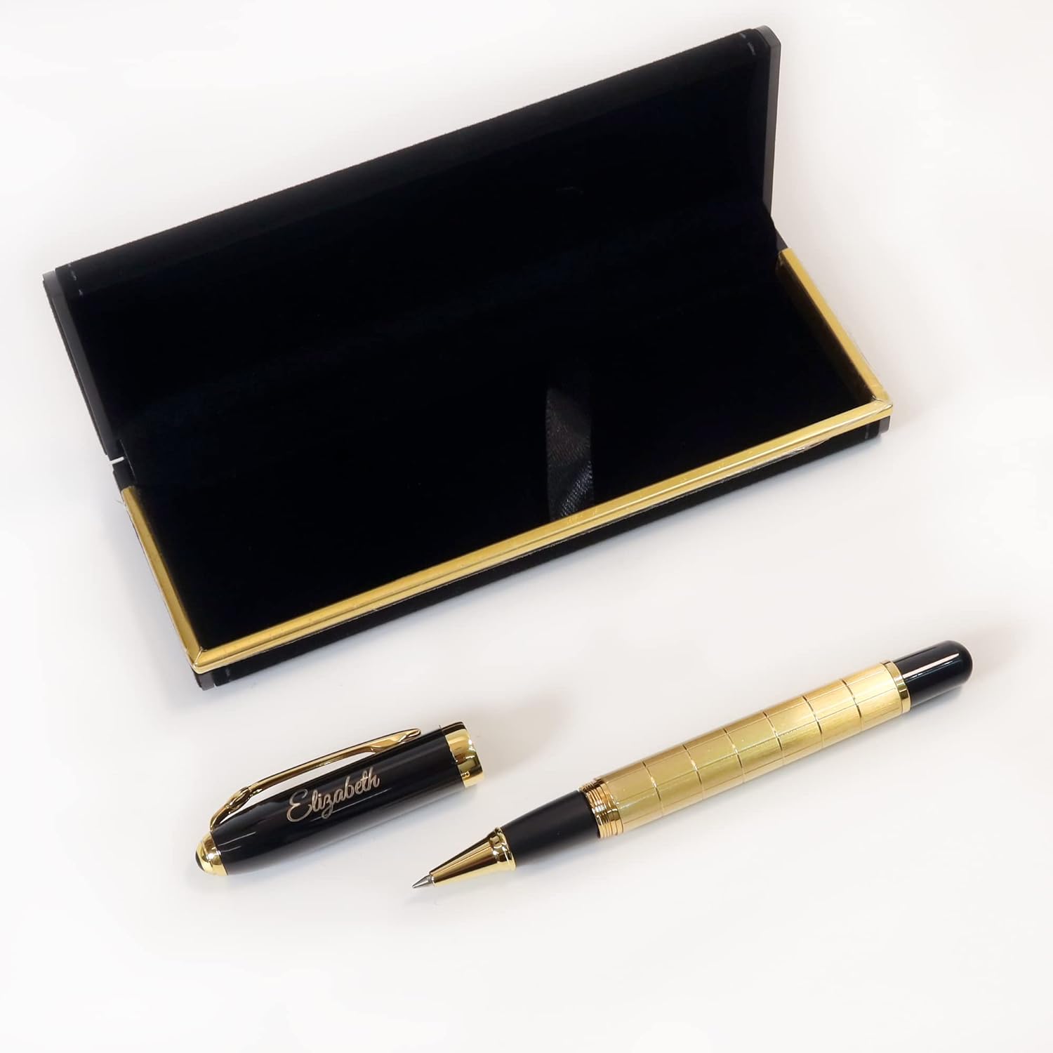 GRANDE IDEA REGALO - Personalizzato con il vostro testo personalizzato, inciso con precisione al laser e confezionato in un'elegante scatola regalo nera. È un regalo perfetto per matrimonio, compleanno, anniversario, laurea, San Valentino, festa della mamma, ecc STYLISH - L'esclusivo design Golden-Black e le finiture di pregio conferiscono un aspetto e una sensazione fantastici. ERGONOMICA - Peso solido e forma ergonomica per una sensazione di scrittura soddisfacente PREPARAZIONE RAPIDA - La maggior parte degli ordini viene incisa e spedita lo stesso giorno lavorativo se ordinata entro le ore 13.00. SPECIFICHE: penna in metallo dal design dorato-nero, confezione regalo nera, inchiostro nero con punta roller (ricarica compatibile con il tipo NEO+); peso: 33 g, lunghezza: 138 mm, diametro: 12,4 mm.