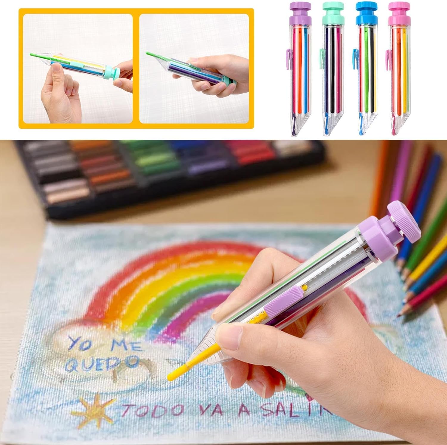 Prestazioni di fascia alta: utilizzando materiali superiori realizzati in PVC ad alta resistenza, i nostri 8 su 1 pastelli garantiscono una qualità e una durata eccezionali. I tuoi figli avranno un divertimento creativo sicuro e di lunga durata. Esperienza di scrittura : questi 8 pastelli su 1 offrono una scrittura liscia e delicata con una facile colorazione. Puoi scegliere tra 8 colori vibranti, tra cui blu, rosso, verde, arancione, rosa, viola, giallo e nero, per creare il tuo capolavoro. Facile utilizzo: con questi 8 pastelli su 1, puoi soddisfare le tue diverse esigenze di pittura in ogni momento e ovunque. Sono facili da usare, facili da trasportare e facili da pulire. Basta premere e ruotare per cambiare colore e asciugare eventuali macchie con un panno umido. Niente più dita o vestiti disordinati. Ampiamente usato: 8 pastelli in 1 sono perfetti per bambini, studenti, ragazzi e ragazze che amano disegnare e colorare. Possono essere ampiamente utilizzati su superfici diverse, come carta, legno, vetro e tessuto. Stimolano la tua creatività e l'immaginazione e aumentano il tuo interesse per l'apprendimento. Mostra il tuo amore: per ragazze e ragazzi, 8 pastelli in 1 sono il regalo per il festival. Ideale per il ritorno a casa, i compleanni e le occasioni speciali, questi pastelli coltivano la creatività e scintillano gioia. Con una varietà di colori disponibili, rendono un regalo premuroso e unico da condividere con i tuoi cari.