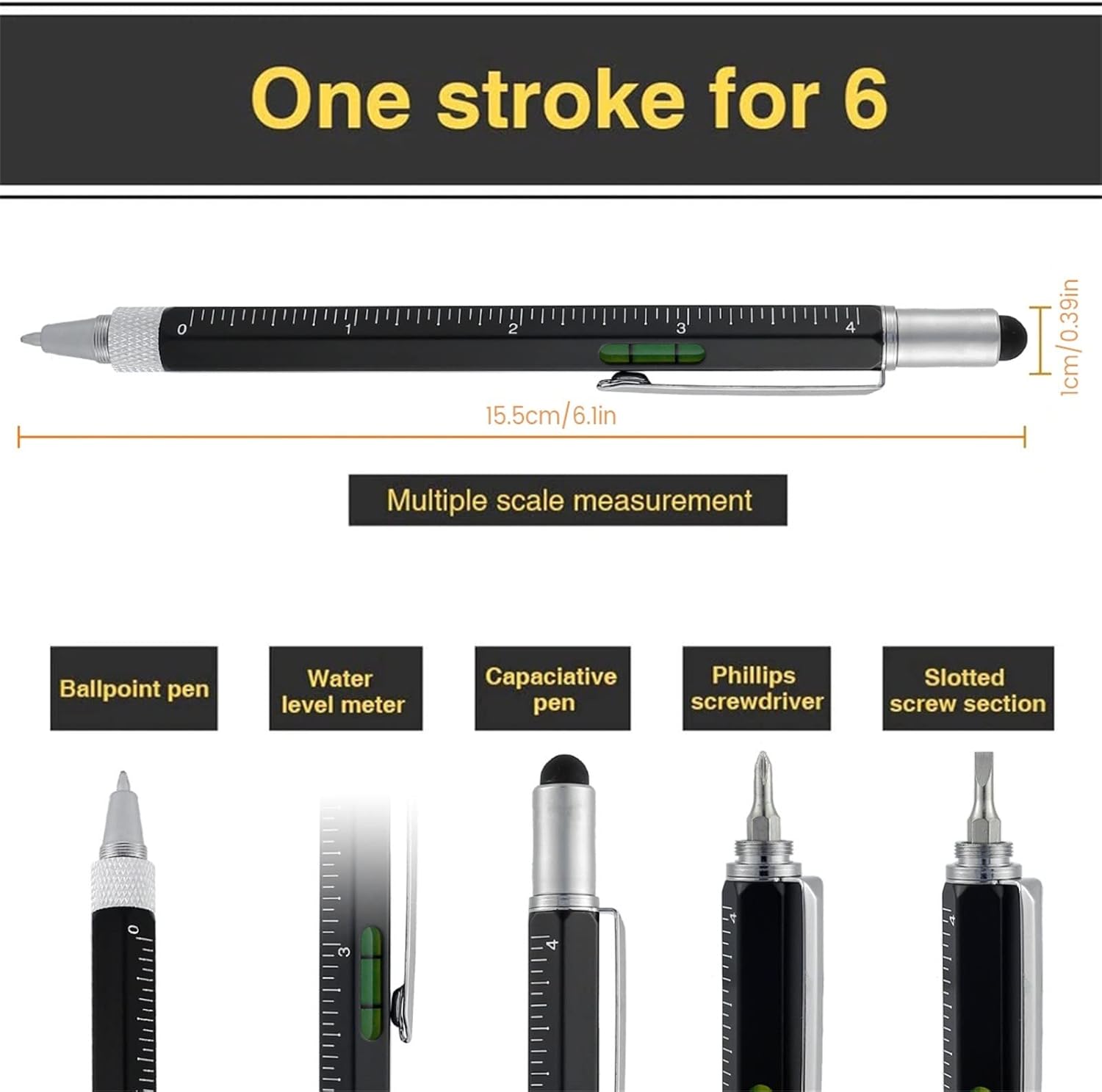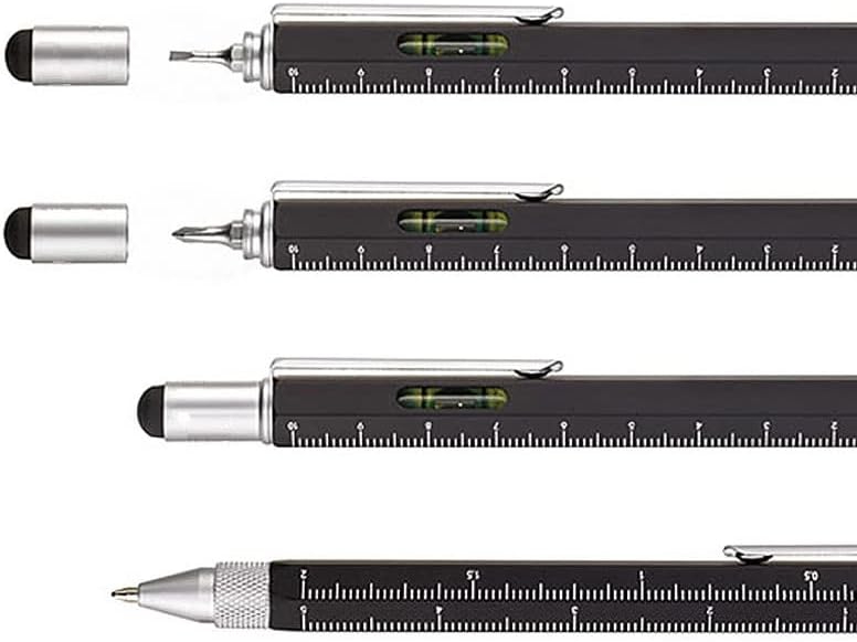 Fantastico regalo: questa penna multiuso è il regalo ideale per qualcuno che ha tutto, la nostra penna arriverà in una scatola regalo nera, pronta per essere regalata subito. La penna multiuso include: penna a sfera nera, pennino touch screen, livella a bolla, clip da tasca, righello e 2 cacciaviti Piccolo e leggero; piccolo e lo strumento perfetto da portare in giro Materiale: la nostra penna multiuso è realizzata in lega di alta qualità, che garantisce qualità e durata Contiene: 1 penna multiuso nera, in un'elegante confezione regalo
