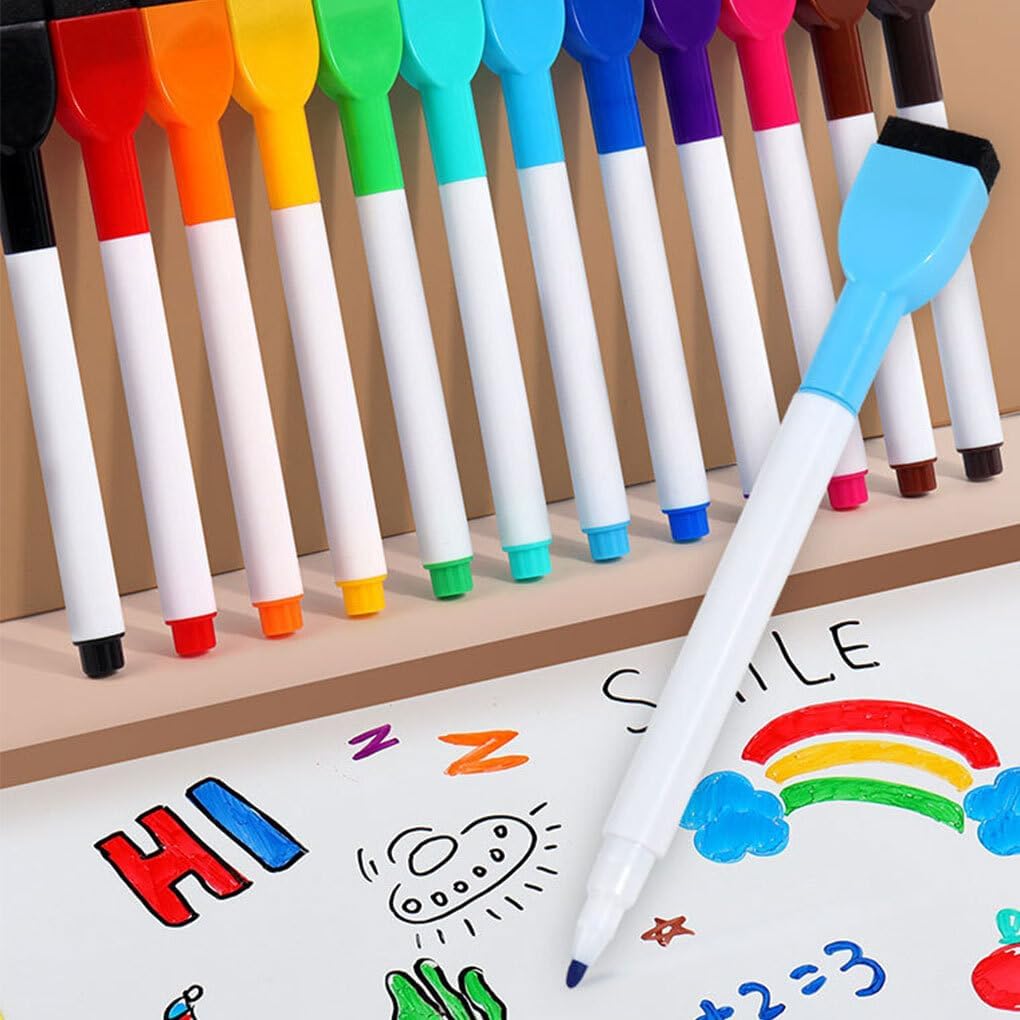 Penna per lavagna colorata: Realizzati con inchiostro ad colorazione, questi pennarelli cancellabili sono disponibili in 12 colori vivaci per i graffiti e i progetti di disegno dei bambini Punta della penna in fibra: la testina in feltro garantisce tratti fluidi fino alla fine, mentre la punta in gomma consente una pulizia facile e senza problemi su lavagne e superfici in vetro Pennello a base d'acqua: con inchiostro a basso odore e ad asciugatura rapida, queste penne per lavagna sono rispettose dell'ambiente e sicure per l'uso da parte dei bambini in classe o a casa Penna Graffiti per bambini: ogni penna è dotata di una punta cancellabile che può pulire rapidamente qualsiasi superficie non porosa, rendendola adatta al gioco creativo e alle attività di apprendimento Pennarello cancellabile: adatte per scrivere su lavagne e superfici lisce, queste penne forniscono una linea chiara e nitida senza la preoccupazione di sbavature o di rimanere senza inchiostro