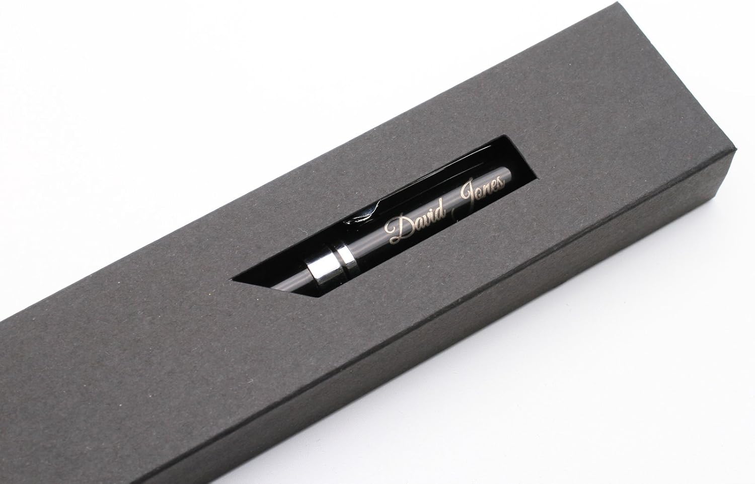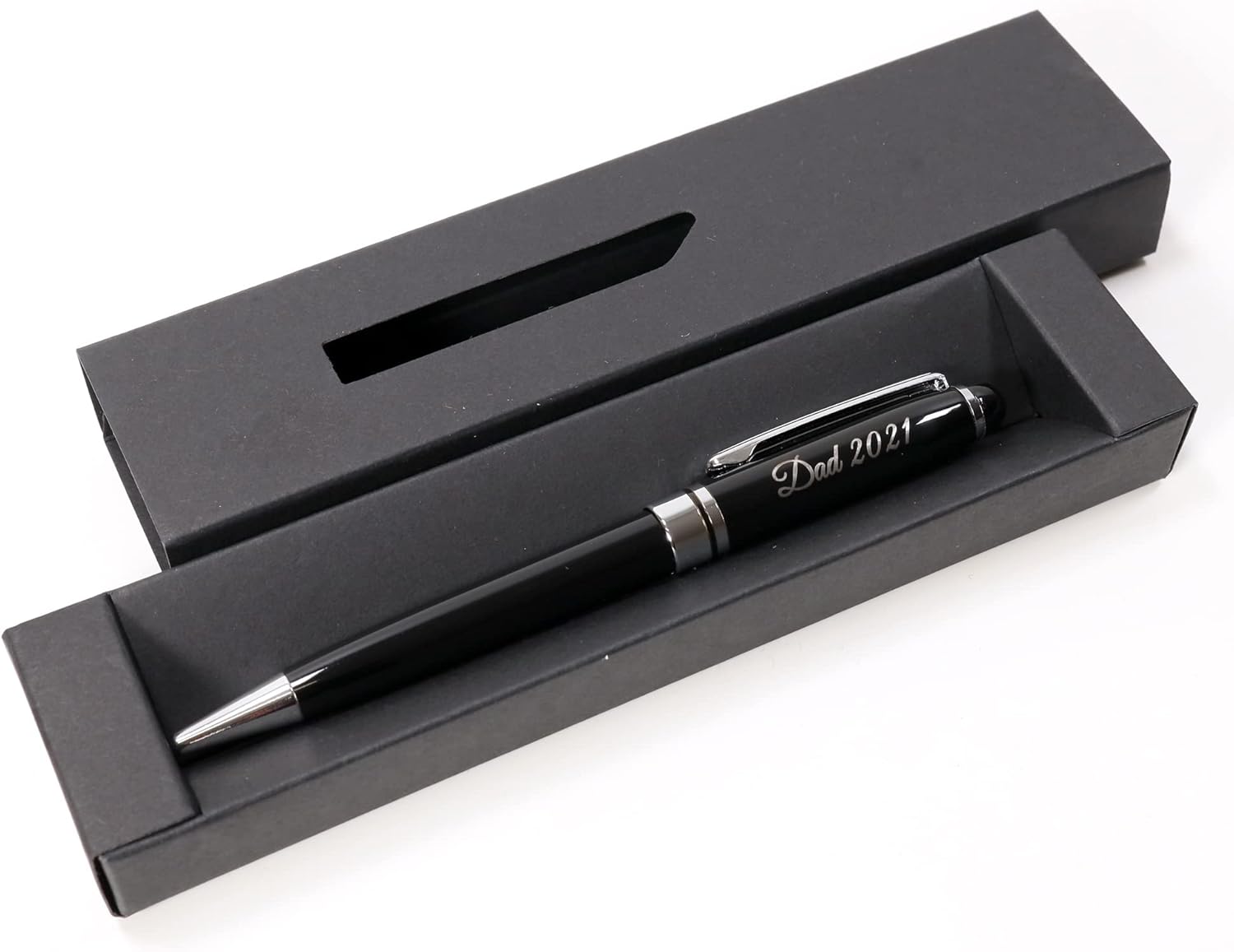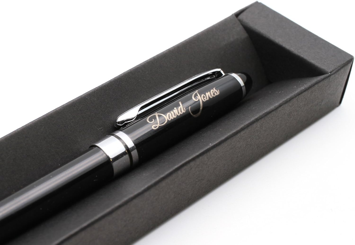 GRANDE IDEA REGALO - Personalizzato con il vostro testo personalizzato, inciso con precisione al laser e confezionato in una scatola regalo nera. È un regalo perfetto per compleanno, anniversario, laurea, San Valentino, festa del papà e della mamma, ecc. ERGONOMICA - Peso solido e forma ergonomica per una sensazione di scrittura soddisfacente PREPARAZIONE RAPIDA - La maggior parte degli ordini viene incisa e spedita lo stesso giorno lavorativo se ordinata entro le ore 13.00. FATTO A MANO - Articolo su misura rifinito a mano, realizzato su ordinazione del Regno Unito. SPECIFICHE: penna a scatto in metallo, colore nero/argento, inchiostro nero con punta a sfera (ricarica tipo #8513); peso: 28 g, lunghezza: 140 mm, diametro: 12 mm.