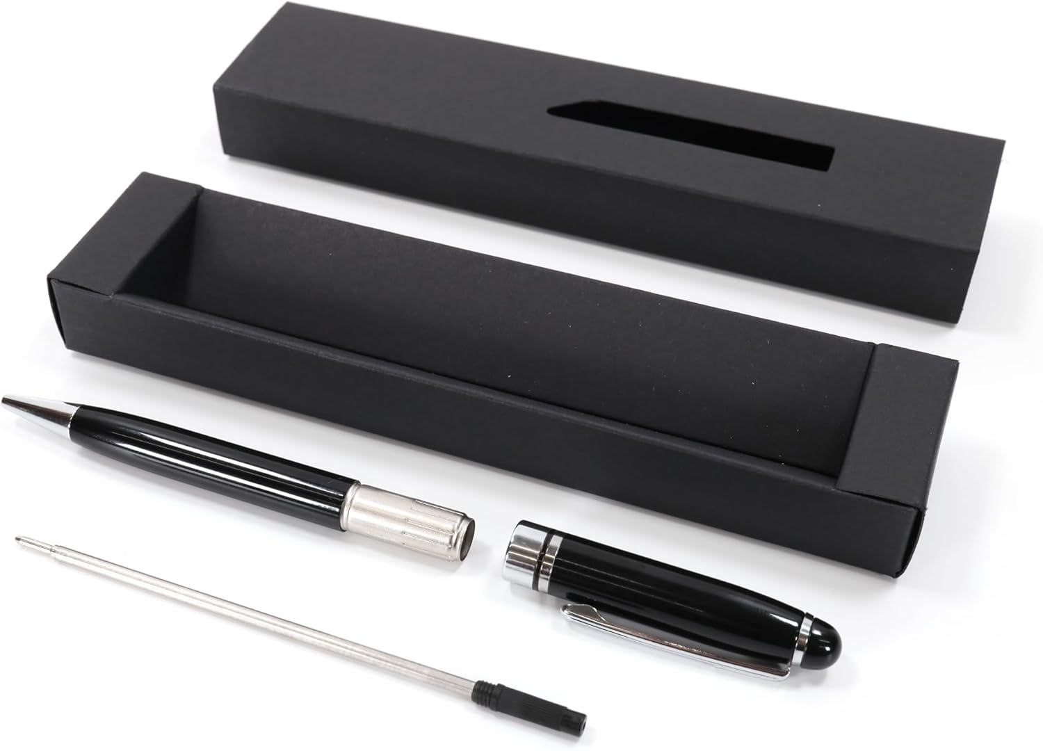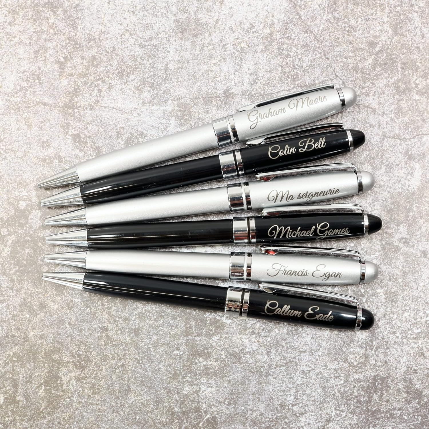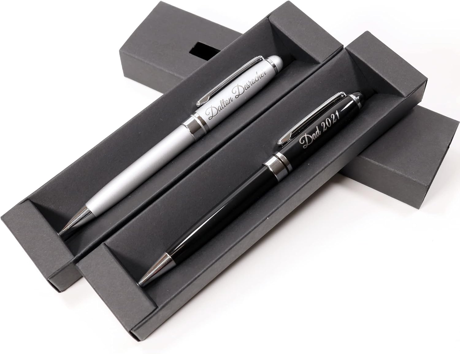 GRANDE IDEA REGALO - Personalizzato con il vostro testo personalizzato, inciso con precisione al laser e confezionato in una scatola regalo nera. È un regalo perfetto per compleanno, anniversario, laurea, San Valentino, festa del papà e della mamma, ecc. ERGONOMICA - Peso solido e forma ergonomica per una sensazione di scrittura soddisfacente PREPARAZIONE RAPIDA - La maggior parte degli ordini viene incisa e spedita lo stesso giorno lavorativo se ordinata entro le ore 13.00. FATTO A MANO - Articolo su misura rifinito a mano, realizzato su ordinazione del Regno Unito. SPECIFICHE: penna a scatto in metallo, colore nero/argento, inchiostro nero con punta a sfera (ricarica tipo #8513); peso: 28 g, lunghezza: 140 mm, diametro: 12 mm.
