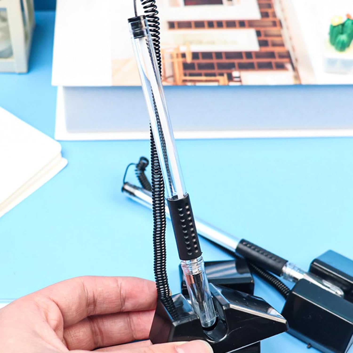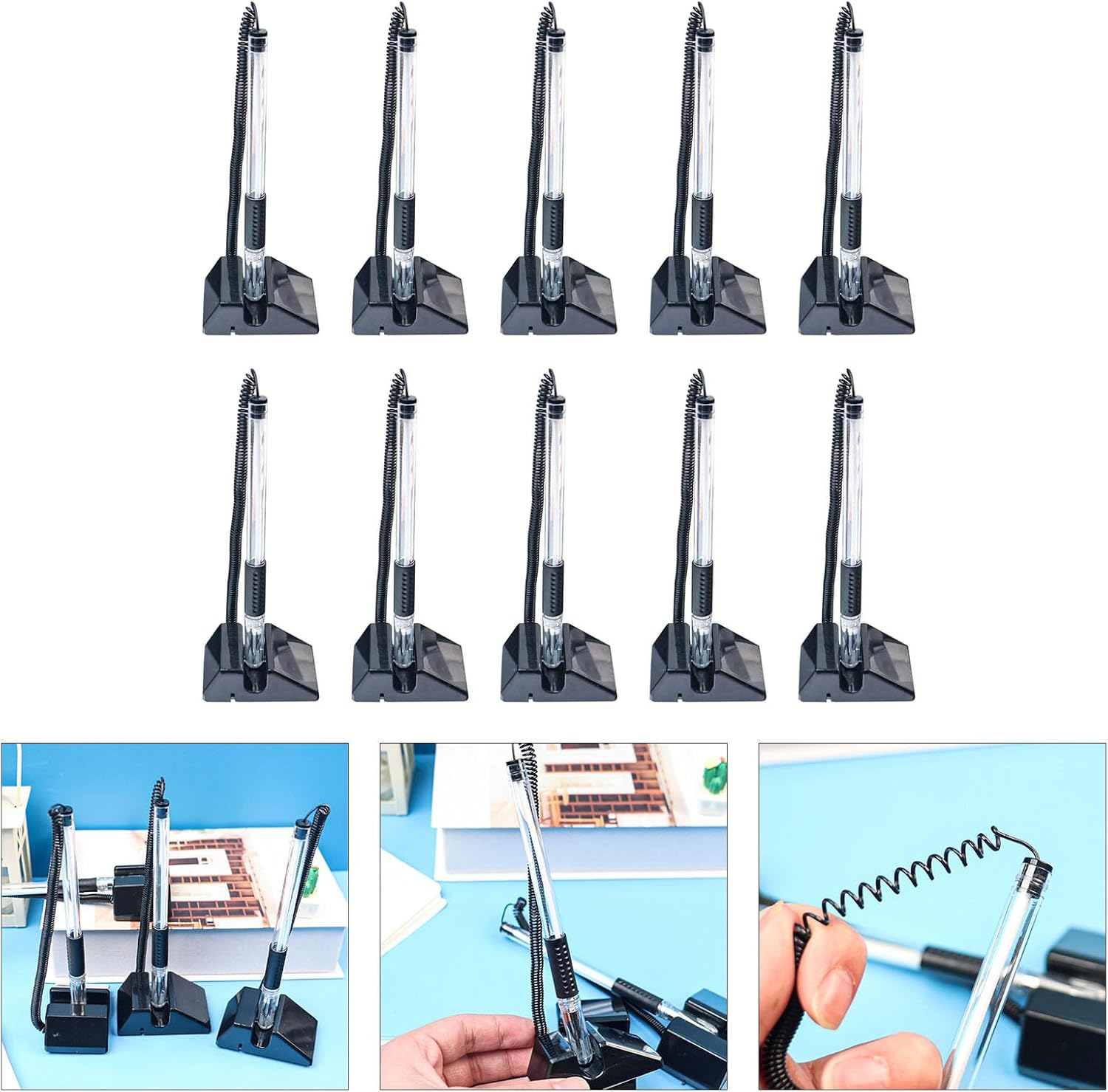 Queste penne offrono inchiostri gel lisci che scivolano facilmente sulla carta senza sbavature, completate da un comodo portapenne rotondo per una facile maneggevolezza. La penna a molla per reception combina funzionalità e praticità, rendendole un must have aggiunta a qualsiasi reception o spazio di lavoro comune. Assicura che la penna sia sempre a portata di mano con la penna da banco sicura, dotata di una catena adesiva e un design a molla per una maggiore sicurezza e praticità. Adatto per vari ambienti tra cui ospedali, banche, scuole e altri spazi pubblici dove strumenti di scrittura sicuri e accessibili sono essenziali. Ideale per professionisti come il personale del bancone, impiegati, insegnanti e studenti scolastici che richiedono strumenti di scrittura sicuri per un uso frequente.