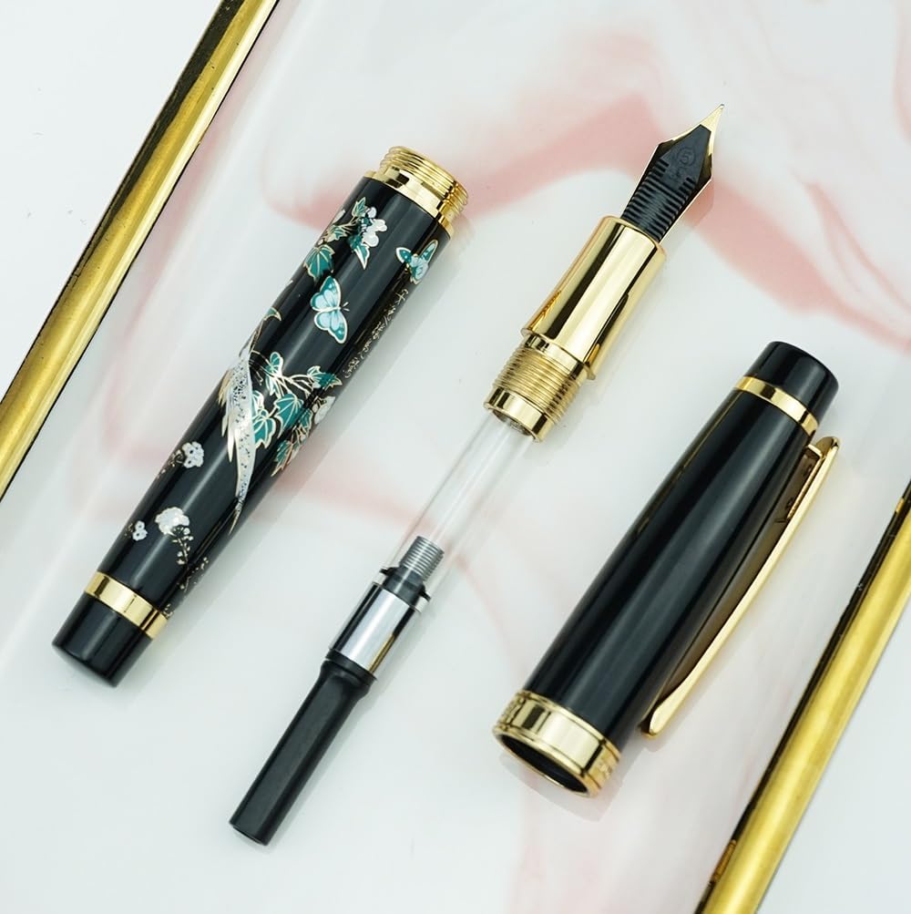 Potenziale regalo: questa penna stilografica è un regalo ideale per uomini d'affari e appassionati di calligrafia, simboleggia attenzione e qualità. Prestazioni di scrittura: l'eccellente qualità garantisce un flusso di inchiostro fluido e uniforme e porta la tua scrittura a un nuovo livello di sofisticazione. Estetica del design: il motivo gazza nera su questa penna stilografica aggiunge un tocco di eleganza e unicità al suo design. Qualità dei materiali: realizzata in metallo di alta qualità, questa penna offre un'esperienza di scrittura leggera e super fluida. Varietà di pennini: con punte versatili EF, F e curve che consentono linee precise da 0,4 mm a 1,2 mm per diversi stili di scrittura.
