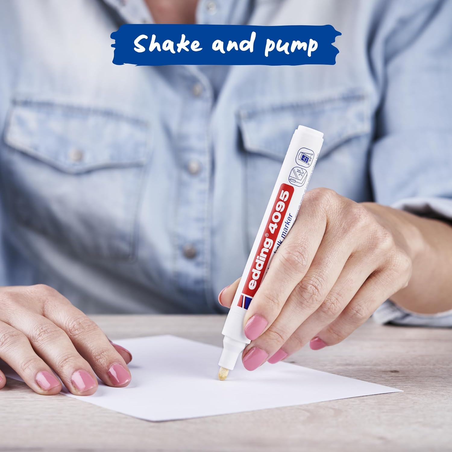 Pennarello a gesso largo per superfici lisce come finestre e lavagne scure; I pennarelli a gesso possono essere lavati via con un panno umido. La confezione contiene 5 pennarelli a gesso: blu, verde, verde chiaro, marrone e arancione neon. Gesso liquido coprente in formato pennarello a base acqua, inodore e resistente alla luce per una verniciatura senza polvere; la punta a scalpello è ideale per scritte larghe. Per dipingere in modo creativo finestre e specchi a casa; design pulito e di alta qualità di vetrine e menu di ristoranti, bar e hotel Il pennarello a gesso edding 4090 è disponibile in 10 colori brillanti; Altre larghezze di tratto disponibili come pennarelli a gesso edding 4095 e edding 4085