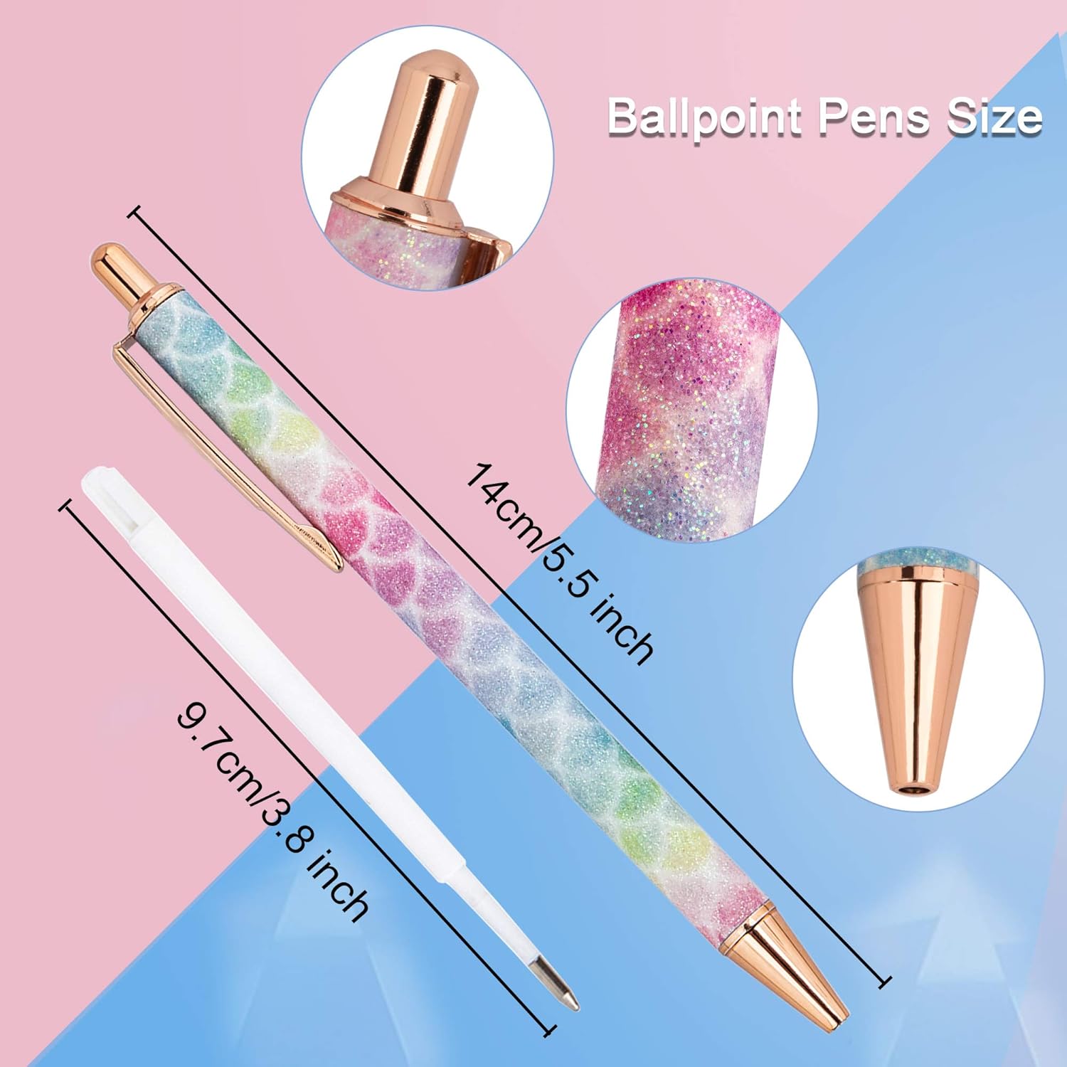 Set di penne a sfera lucide: il pacchetto include 4 penne a sfera in metallo bling, ogni penna con colori belli e sognanti, piuttosto carina ed elegante. Dimensioni: 14 cm / 5,5 pollici di lunghezza. Penne a scatto di alta qualità: è sufficiente fare clic sulla penna a sfera per allungare o ritrarre la punta della penna. Tubo per penna in acciaio inossidabile e supporto in metallo rame; Solido e durevole per un uso prolungato. Scrittura fluida: design della testa arrotondata con punte lisce attraverso le quali l'inchiostro scorre fluentemente verso la punta della sfera, ottimo per fare i compiti, disegnare, scrivere diario. Ottimo per qualsiasi evento e occasione: adatto per festival, matrimoni, compleanni, bomboniere, feste nuziali, San Valentino, Natale, ufficio, affari, uso domestico. Ottimo regalo per donne, ragazze, bambini, compagni di classe, hostess, amici. Cosa ottieni: prodotti di alta qualità e servizio clienti cordiale, non esitare a contattarci se hai domande. Ti risponderemo entro 1 giorno lavorativo.