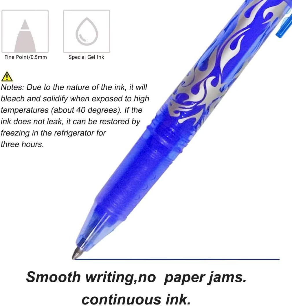 Cancellare Senza Lasciare Segni - Se si commette un errore durante la scrittura, è possibile cancellarlo con la gomma bianca della penne cancellabili. La scrittura può essere facilmente cancellata senza danneggiare la carta e senza lasciare segni, in modo che tutto sembri nuovo e venga riscritto nello stesso punto. Scrittura Fluida E Libera - La penna a sfera cancellabile è dotata di una punta ultra-fine (0,5 mm) e il corpo della penna a sfera colorata in gel ha un design con fori antiscivolo che garantisce una comoda impugnatura. La punta fine scrive in modo pulito e consente di scrivere in modo fluido e libero. Inchiostro Termosensibile Sicuro - L'inchiostro termosensibile di alta qualità e sicurezza, non tossico, non macchia, non sbiadisce o sanguina, non macchia le mani e la carta, aiuta a mantenere il lavoro pulito e organizzato. Adulti e bambini possono usare la penna a sfera in gel con gomma con fiducia. Facile Da Sostituire - La struttura interna della ricariche penna cancellabile è semplice e chiara, la sostituzione del refill è facile, comoda e veloce, e il corpo della penne colorate blu e nera può essere riutilizzato a lungo. Regali Ideali - Gli studenti possono utilizzare la friction penne per prendere appunti o fare i compiti, senza errori o buchi nella carta. Gli adulti possono utilizzare la penne cancellabili per le agende e i verbali delle riunioni. È una penne gel perfetta per la cancelleria scolastica e per l'ufficio.