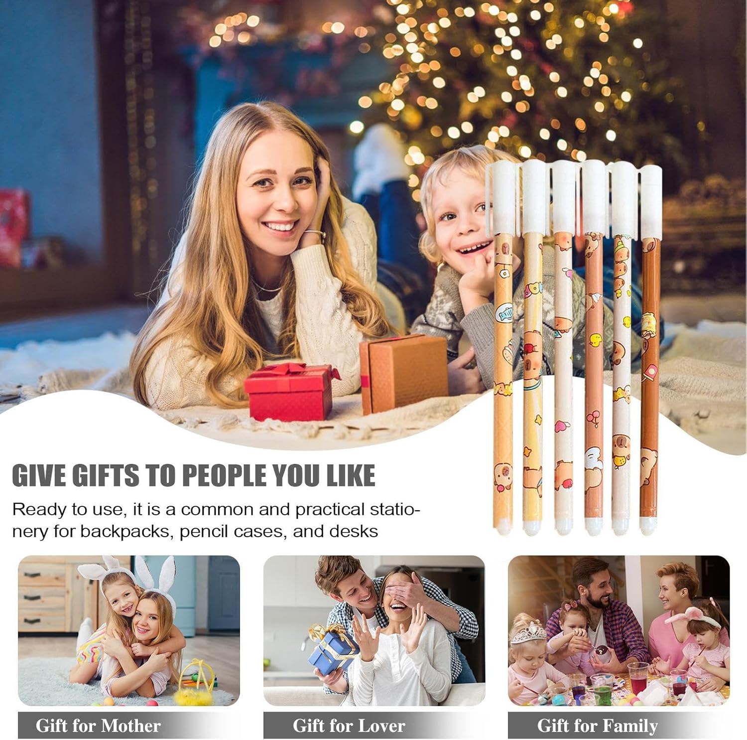 Coinvolgi un compagno di scrittura: ispira ispirazione creativa attraverso una forma interessante e un adorabile design a tema Capybara che rende la scrittura piacevole per grandi e piccini Prestazioni affidabili della penna: questa penna cancellabile è dotata di una bellissima punta da 0,5 mm che fornisce una distribuzione uniforme dell'inchiostro e una scrittura fluida, garantendo risultati leggibili senza sbavature indesiderate Comodo strumento di correzione degli errori: Progettate con una gomma sulla punta, queste penne facilitano il non lasciare segni mentre correggono gli errori, migliorando la produttività fornendo un'esperienza di scrittura fluida ed efficiente Buona durata: progettata con robusto materiale PP, questa penna garantisce una sensazione leggera e resistente agli urti, rendendola ideale per una gestione sicura e prolungata. Regali per le vacanze: ideale per la presentazione, la confezione da 6 penne cancellabili combina l'uso pratico con il divertimento, perfetta per studenti, amici o famiglia per esprimere la loro calda cura in modo efficace