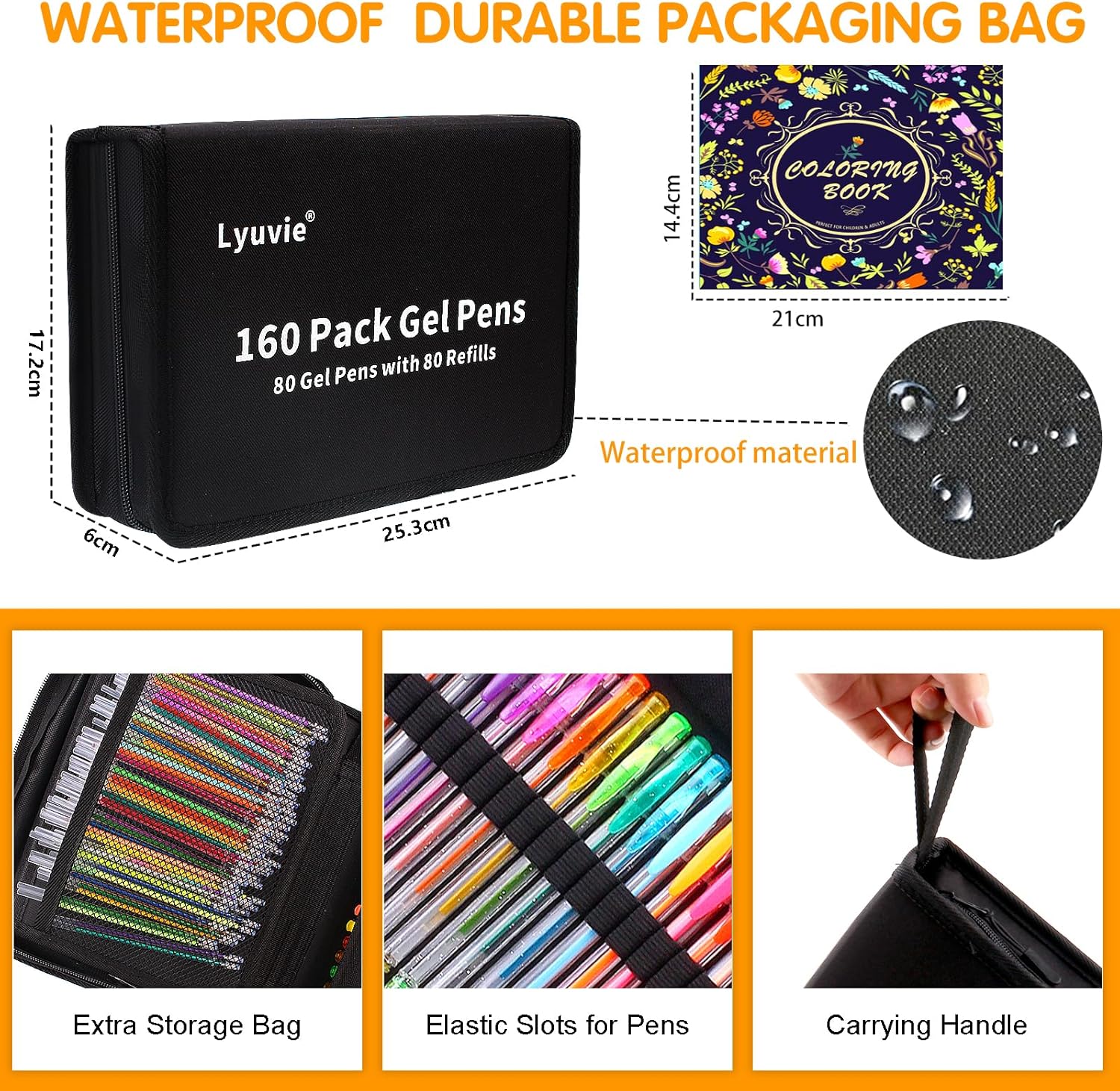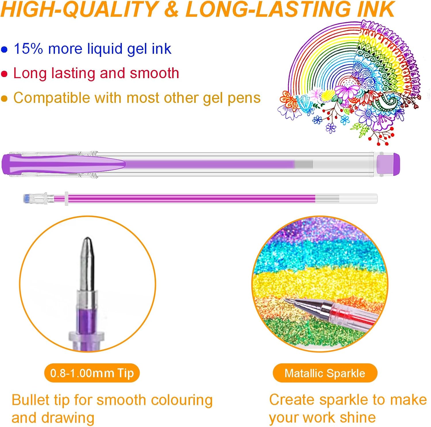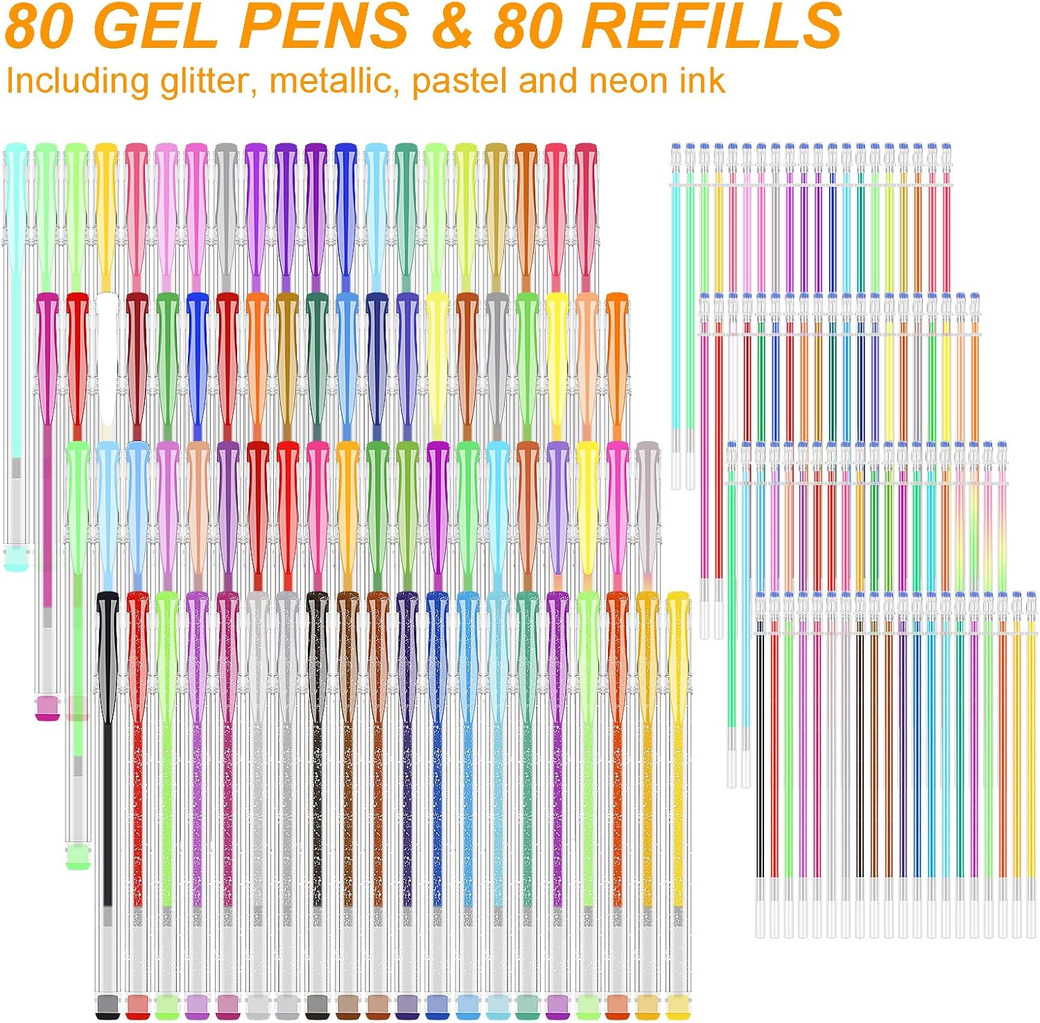 ✿160 Set Penne Colorate: Il nostro penne gel colorate comprende 80 gel pen e 80 ricariche, tra cui inchiostro glitterato, metallizzato, pastello e neon, offrendo una gamma completa per designer, artisti, sognatori e amanti del fai da te. Le penne colorate gel sono dotate anche di un libro da colorare per un uso prolungato e divertente. ✿Scrittura Fluida & Precisa: Con punte a sfera da 0,8 mm a 1,0 mm, le penne colorate glitter offrono un'esperienza di scrittura fluida e accurata senza sbavature, colature o macchie. Le penne colorate gel gel faranno risaltare il tuo diario, disegni e libri da colorare. ✿Inchiostro di Alta Qualità & Lunga Durata: Le penne gel contengono il 15% di inchiostro in più rispetto alla maggior parte delle penne gel colorate, garantendo sessioni creative durature.Set penne colorate sono conformi alla norma ASTM-D4236 e l'inchiostro è atossico, privo di acidi e ad asciugatura rapida, rendendolo perfetto per bambini, adulti e vari progetti di artigianato. ✿Applicazioni Versatili: Le penne colorate gel possono essere utilizzate su varie superfici come carta, cartoncino e persino tessuti. Le penne glitterate colorate sono perfette per diverse applicazioni artistiche, tra cui bullet journaling, schizzi, disegni, libri da colorare, scrapbooking, progetti scolastici, decorazioni fai-da-te e altro ancora. ✿Impugnatura Confortevole & Confezionamento Premium: Ogni penne gel colorate è dotata di un'impugnatura confortevole per un uso senza sforzo durante lunghe sessioni creative.Set penne colorate viene fornito in una custodia nera impermeabile, rendendolo un ottimo regalo per artisti, studenti e appassionati di artigianato, e adatto per l'uso a casa, a scuola o in viaggio.