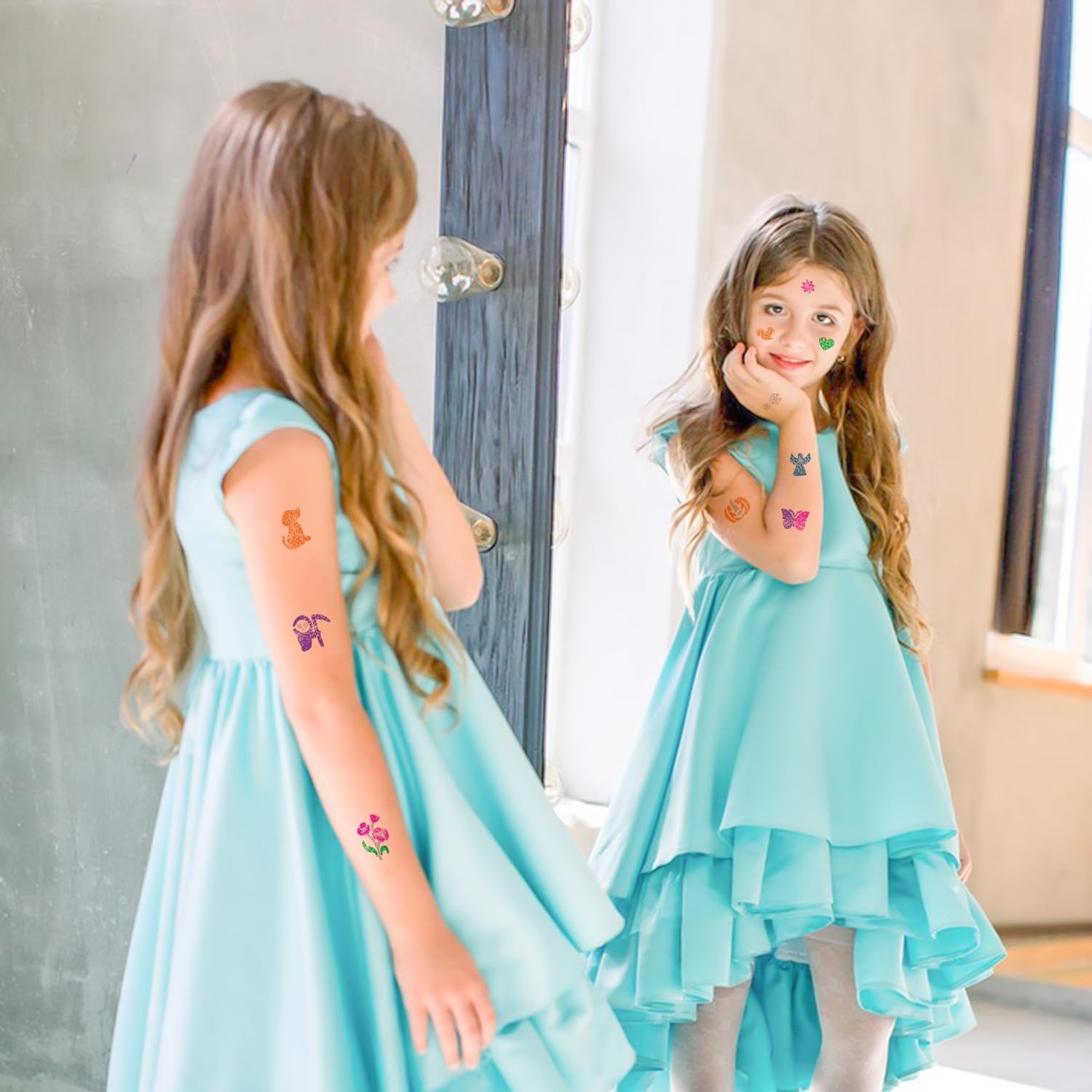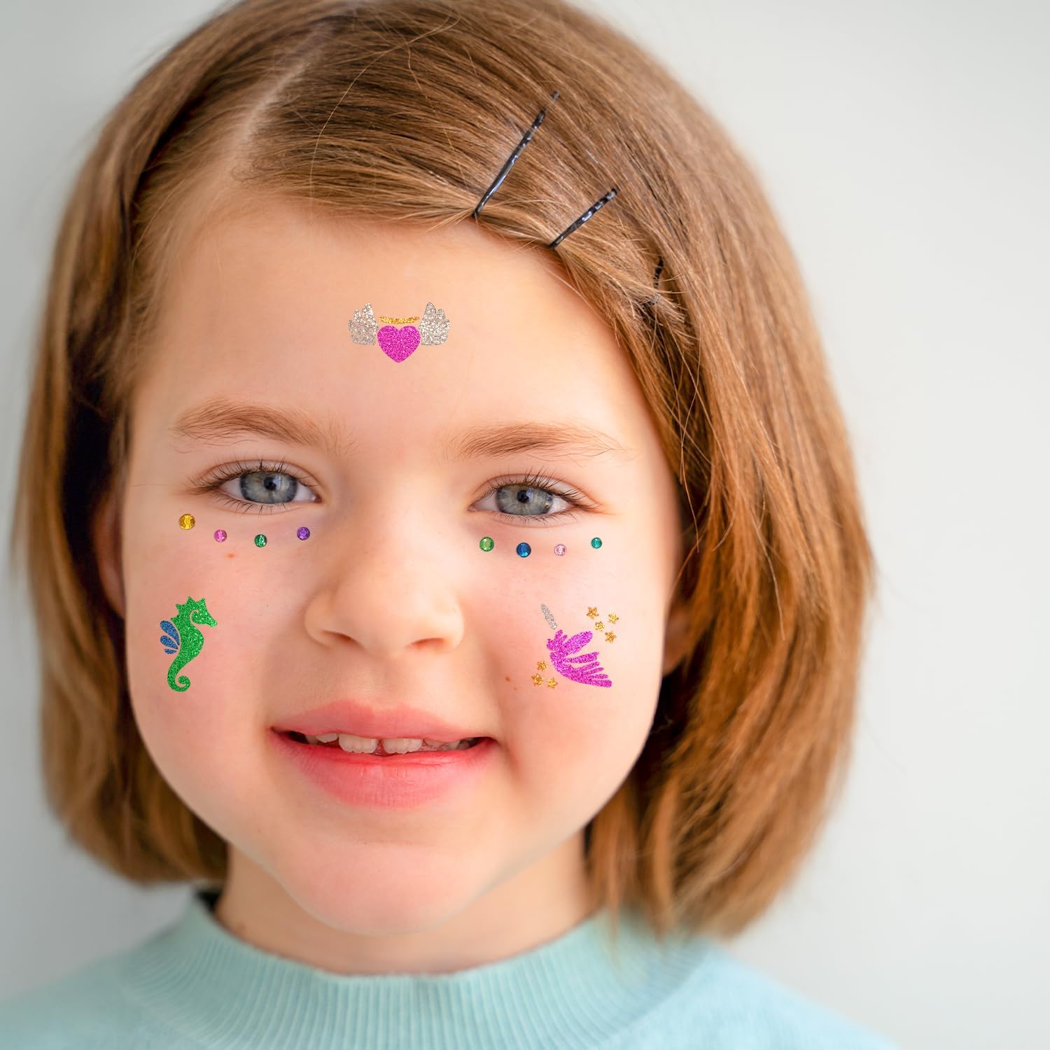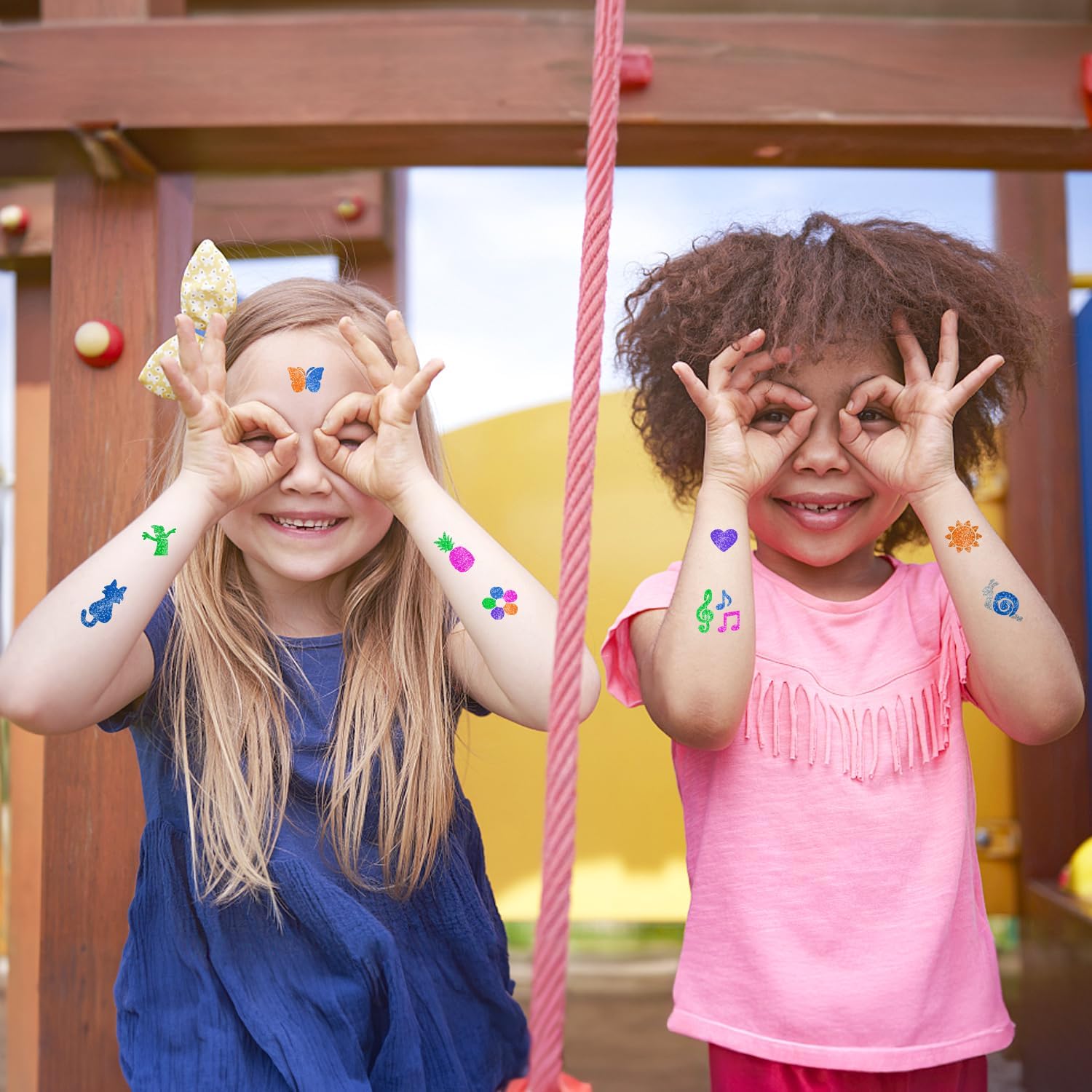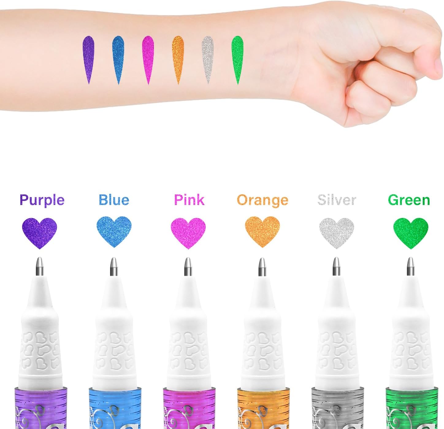 Kit Tatuaggi Bambini: Belli penna tatuaggi glitter per Bambini con 6 colorate penna per tatuaggi, 9 stencil (86 motivi), 2 pezzi di Strass (330 pcs). Ottimo per feste o eventi fai da te per bambini Buona Qualità: penne per tatuaggi sono realizzate con pigmenti vegetali. Sicuro per la pelle, non tossico e inodore. Dura circa 2-3 giorni. Impermeabile. Forte adesione delle strass colorate e buona brillantezza. Conforme agli standard UE Facile da Usare: Kit per tatuaggi viene fornito con una serie di bellissimi disegni a stencil che possono essere facilmente colorati e creati con una penna per tatuaggi. Si rimuove facilmente lavando con acqua e sapone senza lasciare alcun residuo Felice Condivisione: Creatività senza limiti! Bambini sono liberi di essere creativi e di disegnare vari disegni sulle viso braccio gamba ecc. Penna per tatuaggi stimolano il potenziale artistico dei bambini e favoriscono la creatività e l'immaginazione Regali Bambina: È un regalo divertente che ogni bambina aspetta con ansia. Penna tatuaggi per gadget compleanno bambini, feste attività, halloween carnevale natale pasqua trucca ecc. Regalo bambina 3 4 5 6 7 8 9 anni