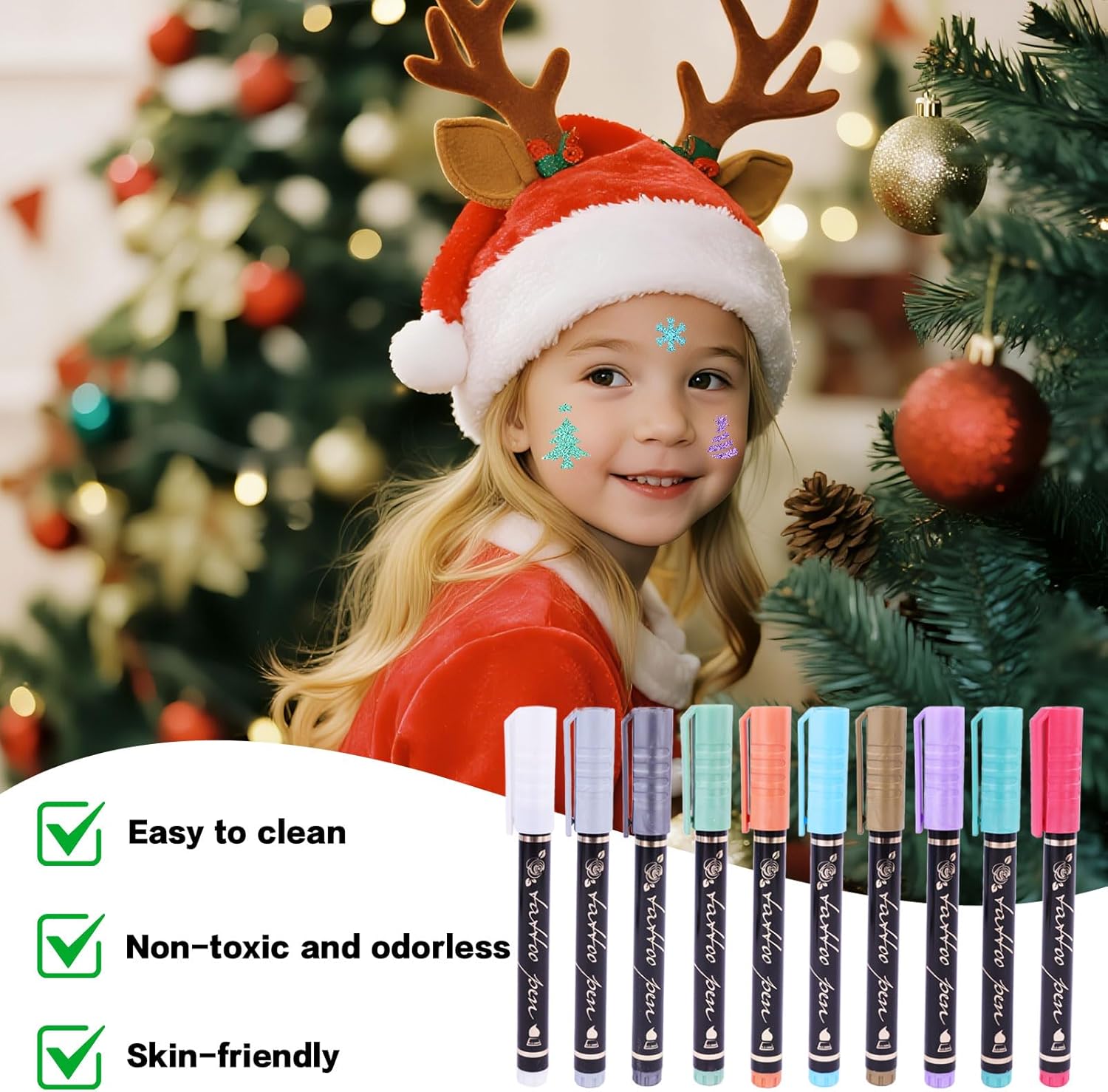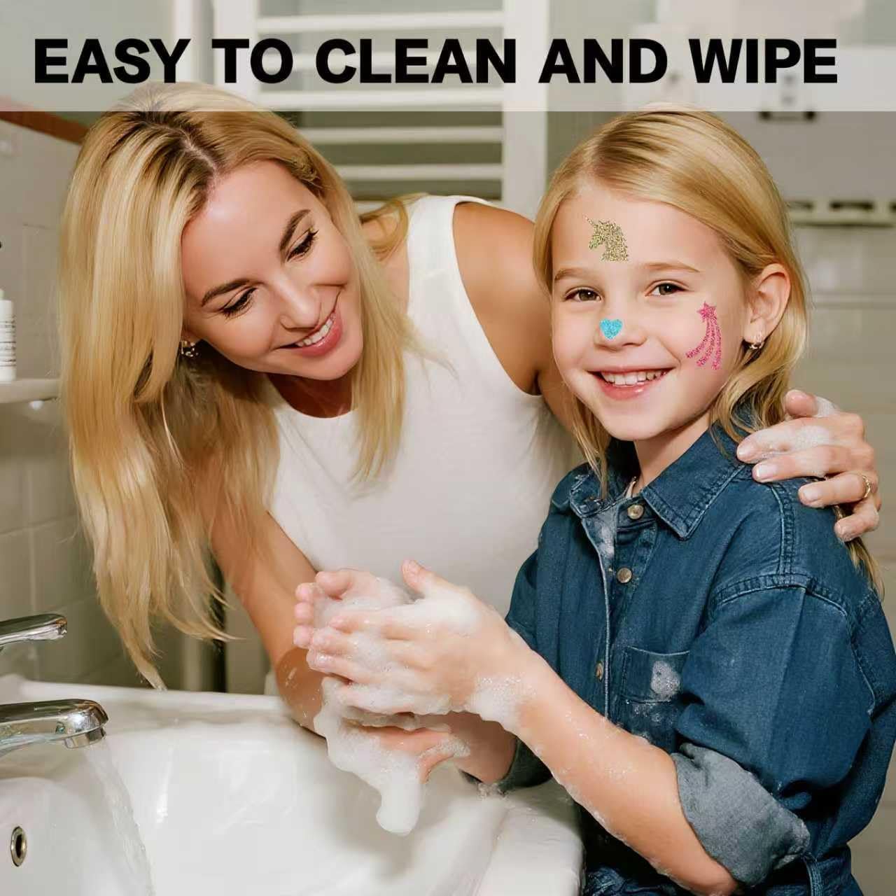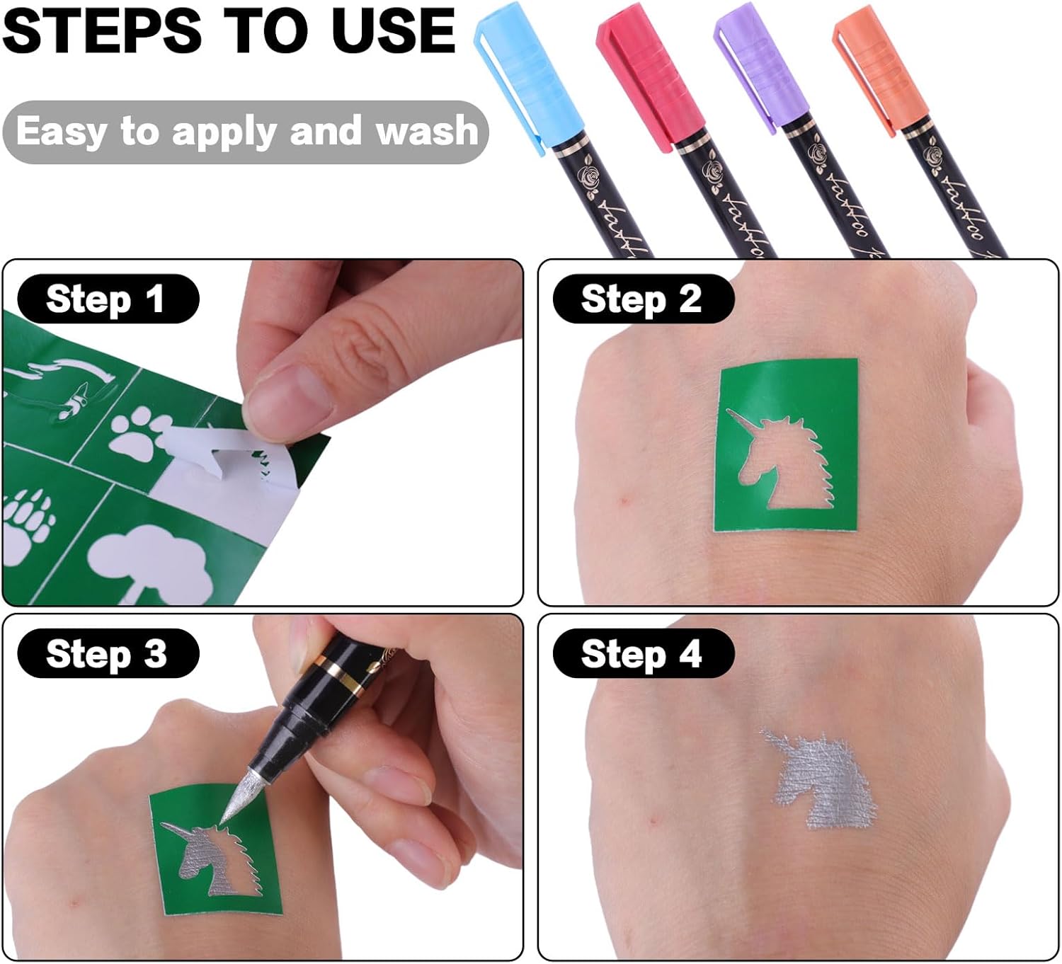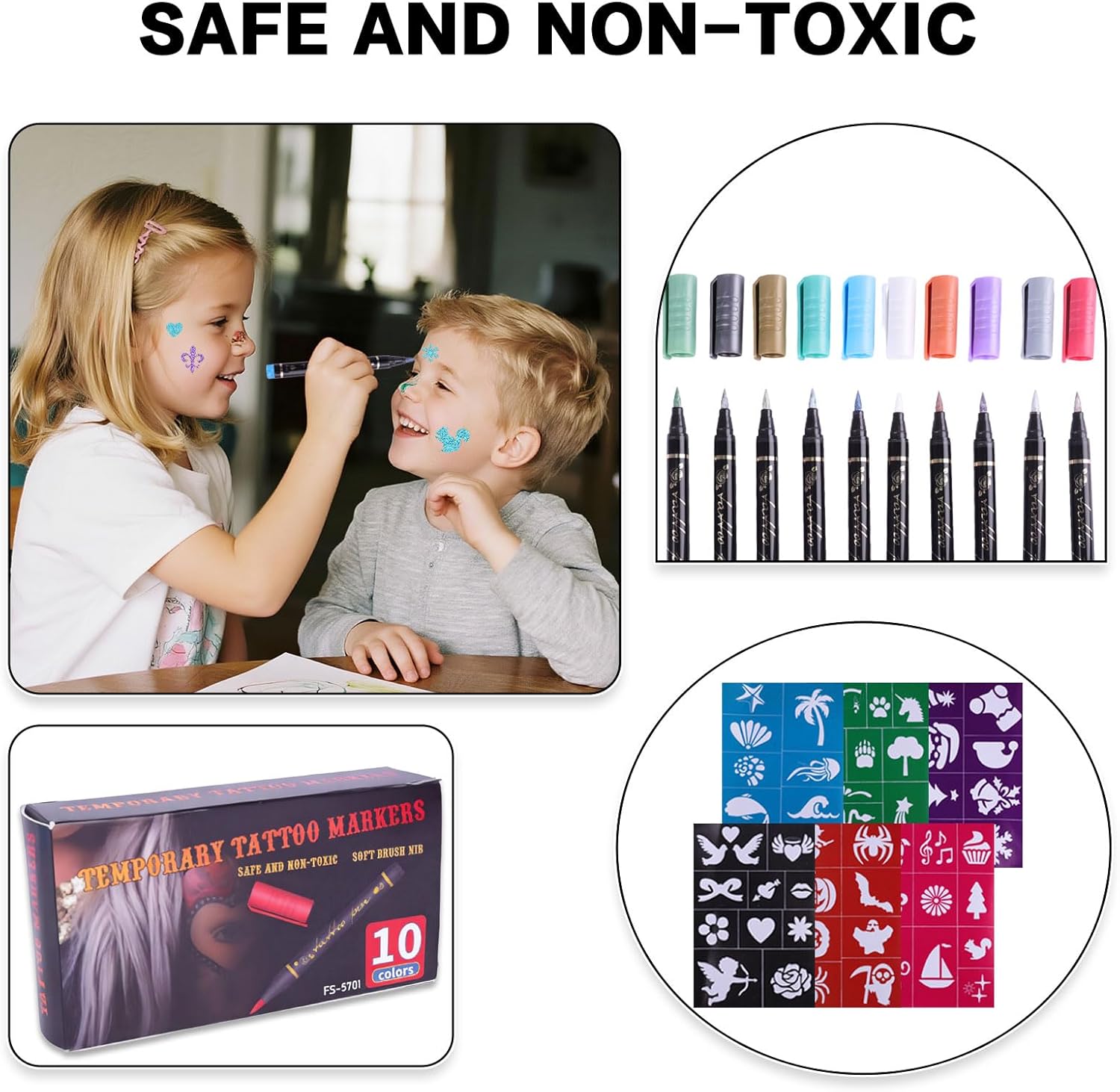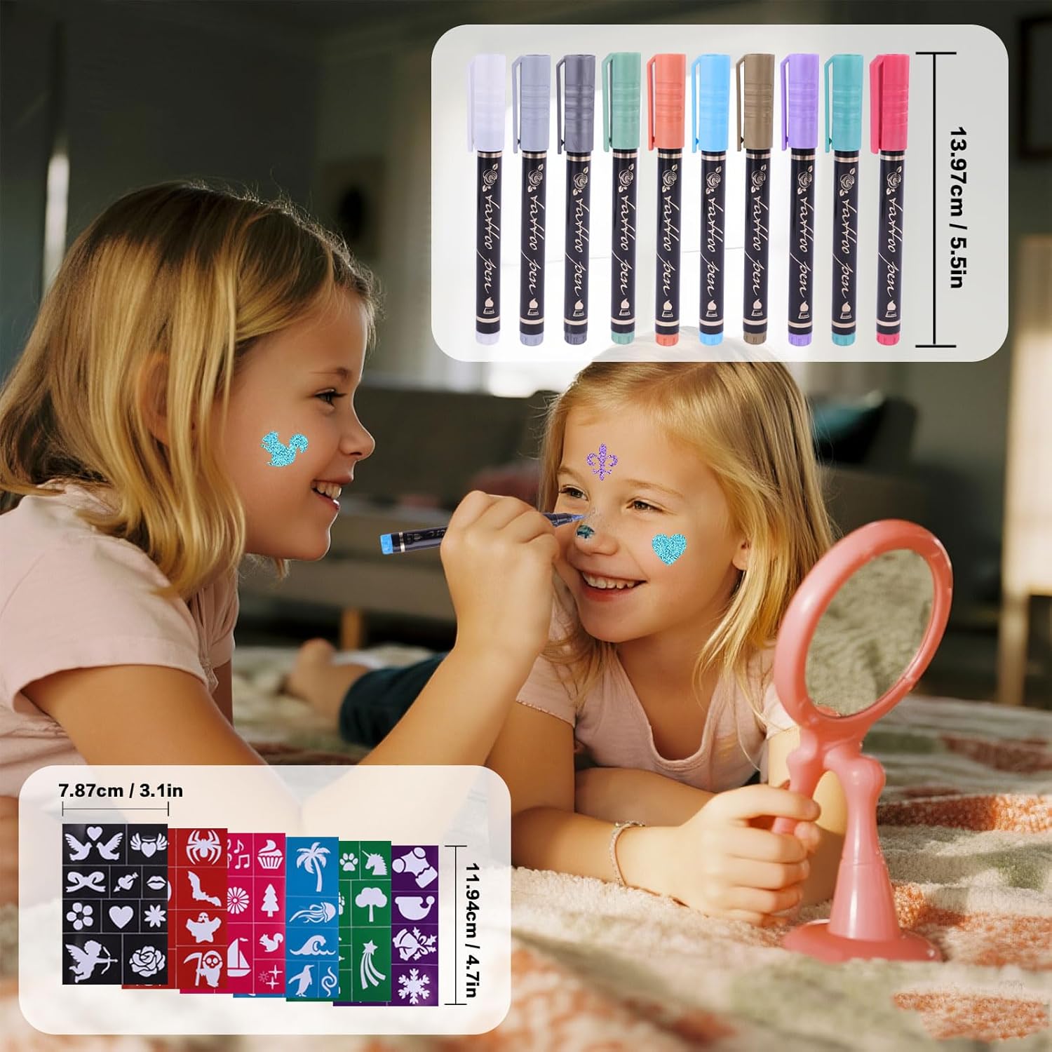 Kit Per Tatuaggi Per Bambini: Il raffinato set di penne glitterate che riceverai contiene 10 pennarelli glitterati e 6 graziosi modelli (con 56 disegni diversi). I colori vivaci e i motivi sono pensati per stimolare la creatività dei bambini, rendendolo ideale per feste per bambini o attività fai da te. Buona Qualità/Sicuro e Innocuo :Le penne per tatuaggi per bambini sono realizzate con pigmenti vegetali sicuri e atossici, privi al 100% di sostanze nocive. Delicate sulla pelle, sono adatte per l'uso sul viso, sul corpo, sulle braccia, sulle mani e sulle unghie dei bambini, nonché per applicazioni di trucco decorativo. Crea Liberamente, Condividi La Gioia: I kit di tatuaggi glitterati per bambini consentono ai più piccoli di dare libero sfogo alla loro creatività disegnando ogni tipo di motivo su viso, braccia, gambe e altro ancora. Condividere la gioia della creazione con gli amici stimola il potenziale artistico dei bambini, alimentando la loro creatività e immaginazione. Facile da usare: I pennarelli per tatuaggi temporanei per bambini sono adatti non solo per il viso, ma anche per braccia, gambe e altre zone. Inoltre, il kit per tatuaggi include una serie di raffinati modelli, che consentono di colorare e creare facilmente con il pennarello per tatuaggi. Per rimuovere il disegno, è sufficiente lavarlo con acqua e sapone, senza lasciare alcuna traccia. Il Regalo Perfetto: Se sei ancora indeciso su quale regalo fare a tua figlia per il suo compleanno, questa penna per tatuaggi è la scelta migliore. Nessuna bambina dai 6 ai 9 anni rifiuterebbe un regalo così delizioso. È adatta sia per feste di compleanno, eventi festivi, Halloween, carnevale, Natale, decorazione delle uova di Pasqua e occasioni simili.