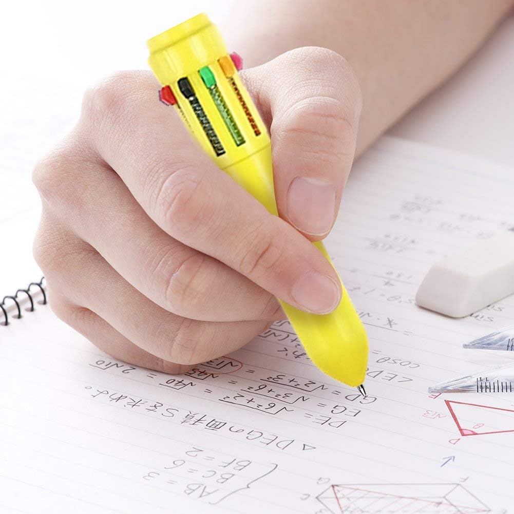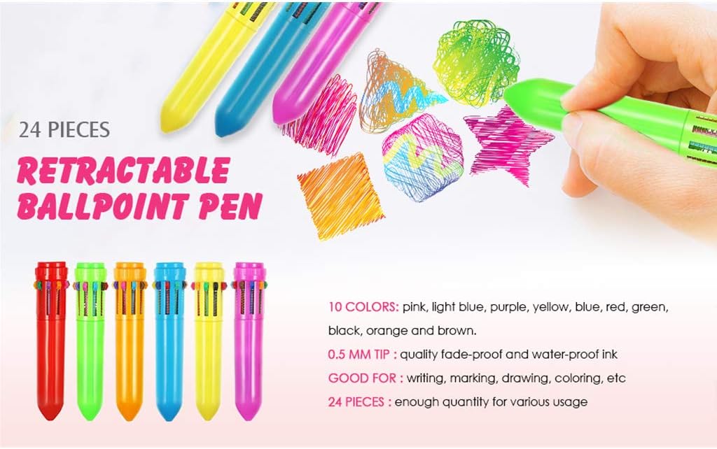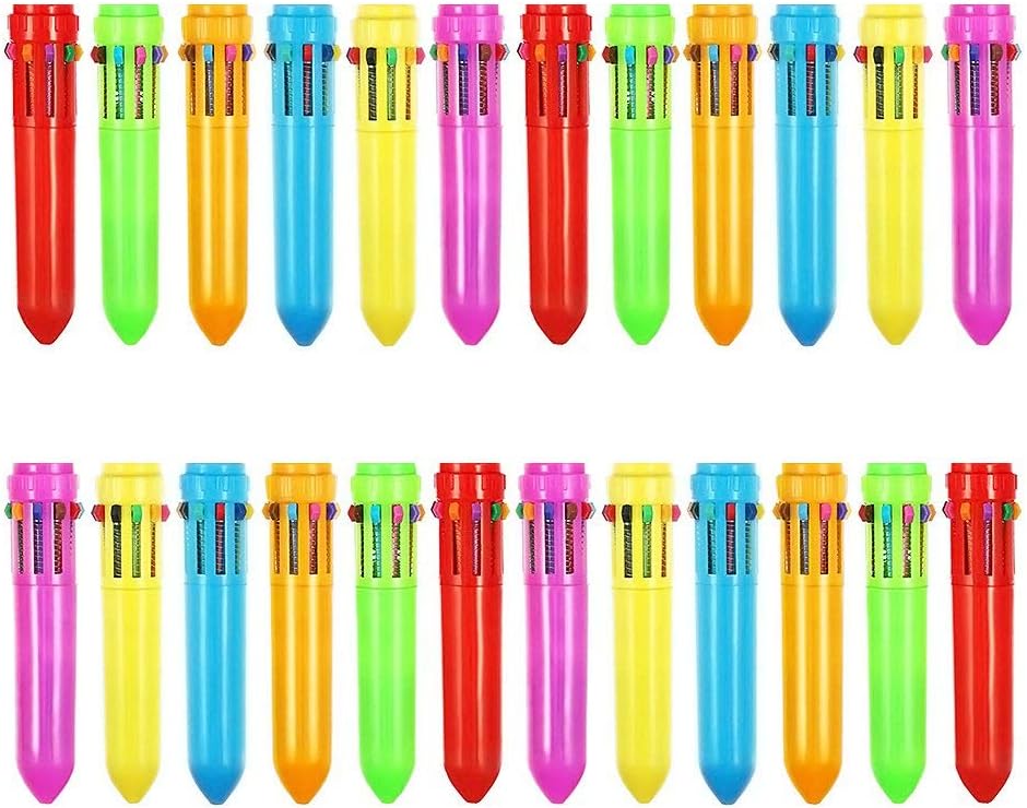 FACILE DA USARE: passa facilmente tra i 10 colori, basta premere il pulsante in alto della penna per resettare che può passare da un colore all'altro CONVENIENTE: design retrattile, comodo da usare e trasportare senza doversi preoccupare di perdere i tappi. SUA BENVENUTO: ideale per uso ufficio, scuola o casa. REGALO IDEALE: grandi bomboniere per la festa dei tuoi cari, colorati e mini perfetti per i bambini e anche per alcuni adulti, bomboniere e regali eccellenti Penna a sfera multicolore 10-in-1: ogni penna ha 10 diversi colori vivaci di inchiostri come rosa, azzurro, viola, giallo, blu, rosso, verde, nero, arancione e marrone