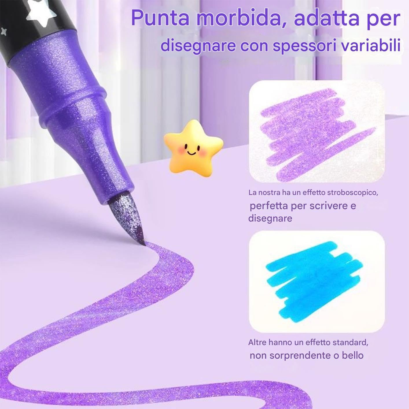 Applicazioni Multiple e Varie: Le penne glitter assicurano una copertura eccellente e un effetto scintillante, perfette per l'educazione artistica, l'incarto regali e oltre, permettendo ai creativi di aggiungere dettagli accattivanti a biglietti handmade, progetti scolastici o decorazioni stagionali. L'applicazione è e i risultati sono costanti, con colori vibranti che esaltano ogni lavoro in modo uniforme e duraturo. Queste penne glitter sono adatte per uso domestico, scolastico e Formula a Asciugatura Rapida: Le penne glitter sono dotate di una formula a rapida asciugatura che elimina completamente le sbavature e la trasparenza della carta, garantendo una scrittura e per l'uso quotidiano in scuola, lavoro o attività artistiche. L'inchiostro si asciuga all'istante, offrendo risultati impeccabili in ogni situazione, dalle note agli schizzi creativi, senza il rischio di macchie o alla superficie. Queste penne sono ideali per studenti, professionisti e a Versatilità a Due Punte: Con il design a due punte scintillante, queste penne glitter abilitano transizioni senza soluzione di continuità tra riempimenti ampi e motivi intricati, offrendo agli utenti gli strumenti per progettare carte e layout di scrapbook con effetti scintillanti brillanti, per creazioni uniche e personalizzate che sfruttano la doppia punta per massima espressività. Scintillio Vivace Non Sbiadito: La combinazione di inchiostro acrilico ad alta purezza e particelle incorporate in queste penne glitter gel produce scintillio intenso e vivace che resiste sbiadimento, mantenendo la brillantezza nel , rendendole ideali per arricchire progetti creativi come agende, planner o lavoretti fai da te, con una finitura uniforme che esalta design personali e decorazioni senza perdere vivacità. Materiali Artistici Robusti: Queste penne glitter per artigianato sono progettate con un barilotto in PP e punte di precisione che garantiscono durabilità resistendo a cadute e vibrazioni, consentendo di creare disegni intricati su biglietti di auguri o agende mantenendo un flusso d'inchiostro costante e uniforme per progetti creativi dettagliati senza interruzioni, ideali per uso frequente in attività artistiche e decorative con risultati affidabili e duraturi su varie superfici.