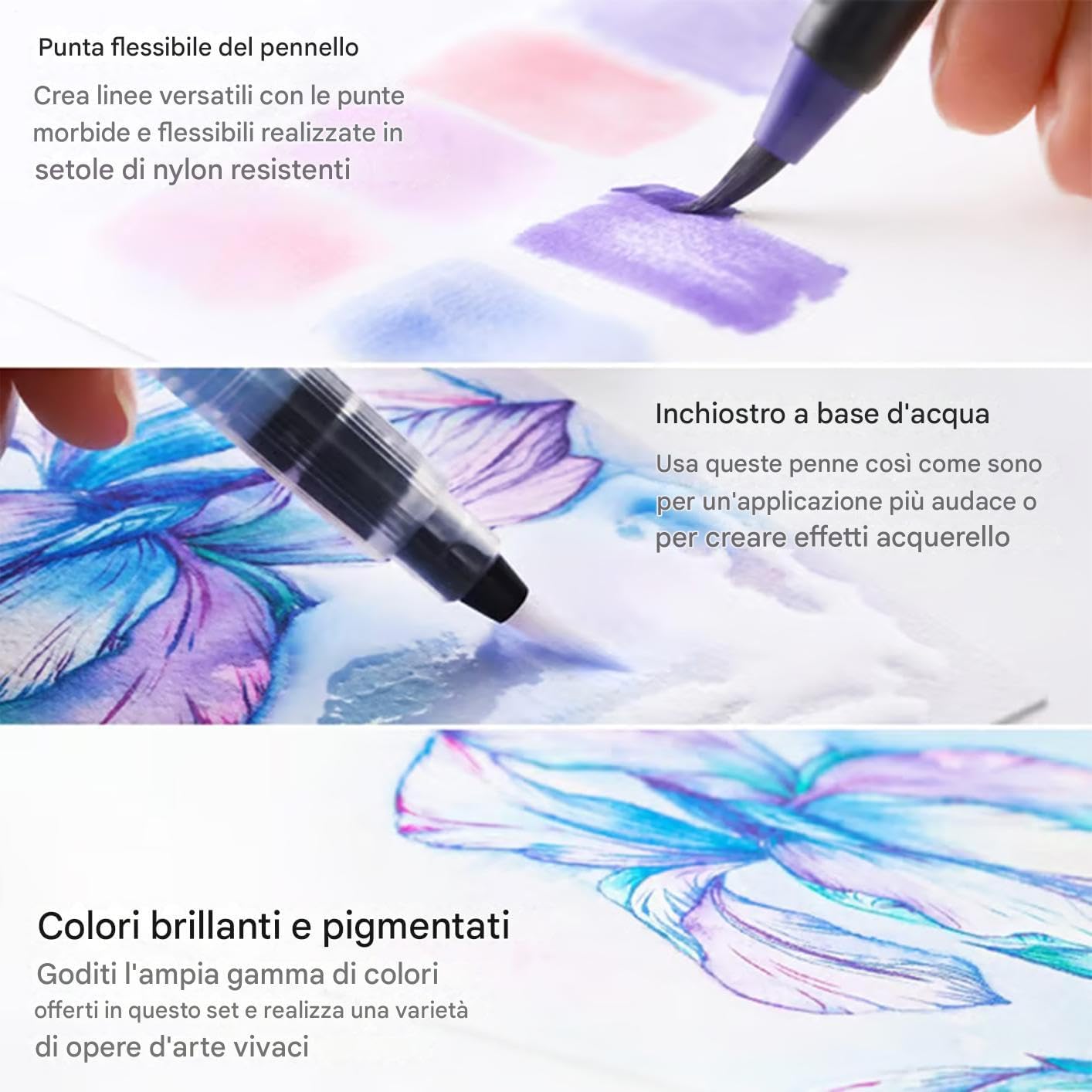 Sicurezza e Praticità: Progettati per la massima sicurezza, questi pennelli ad acqua presentano superfici opache antiscivolo, una composizione adatta ai bambini e materiali innocui per animali, offrendo un'esperienza piacevole senza odori durante ogni sessione artistica. Scelta Regalo Artistica: Set completo di pennelli per artisti e principianti. Con dimensioni multiple che lo rendono un componente ideale per arricchire qualsiasi collezione creativa in modo pratico. Risparmio nella pulizia:Design funzionale che permette di lavare i pennelli solo con acqua, mantenendo intatta la forma e setole per tratti precisi ogni volta. Effetti a Strati: Arricchisci progetti con strati sovrapponibili di colori vividi, perfetti per motivi floreali o composizioni astratte potenziati da proprietà di fusione naturale. Precisione Flessibile: Progettati per l'arte ', garantiscono funzionalità e gestione cromatica accurata con punte flessibili in ogni tecnica