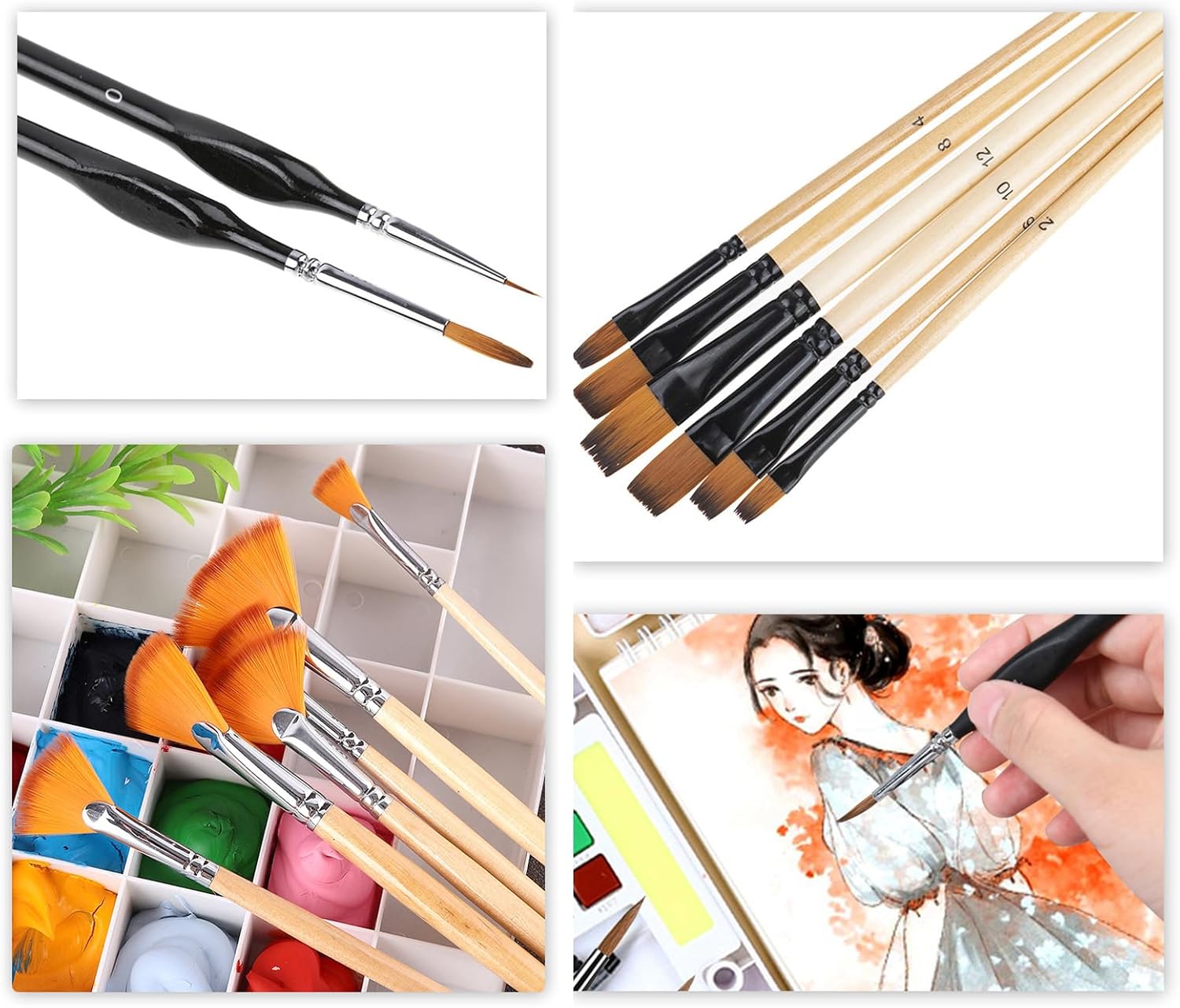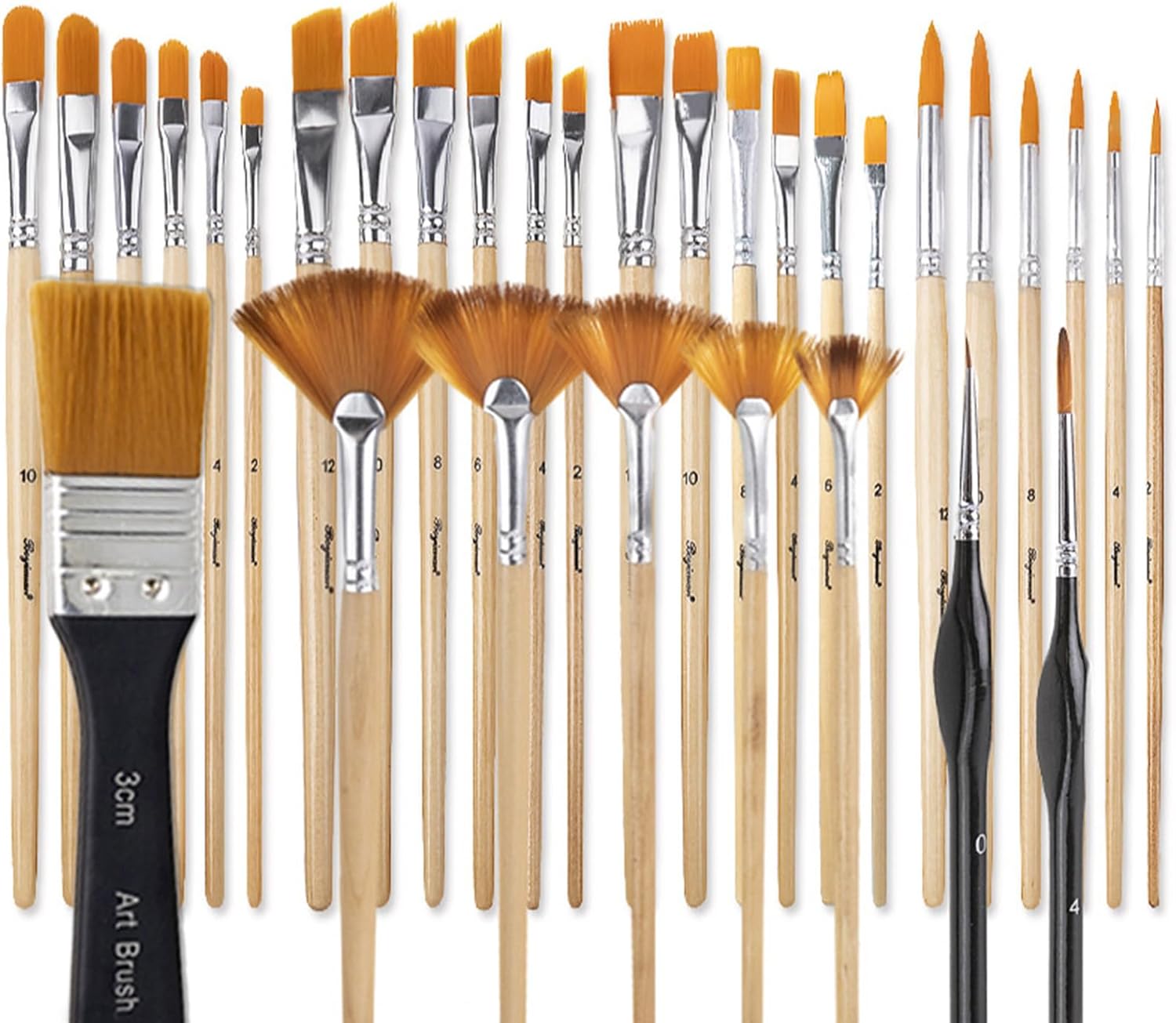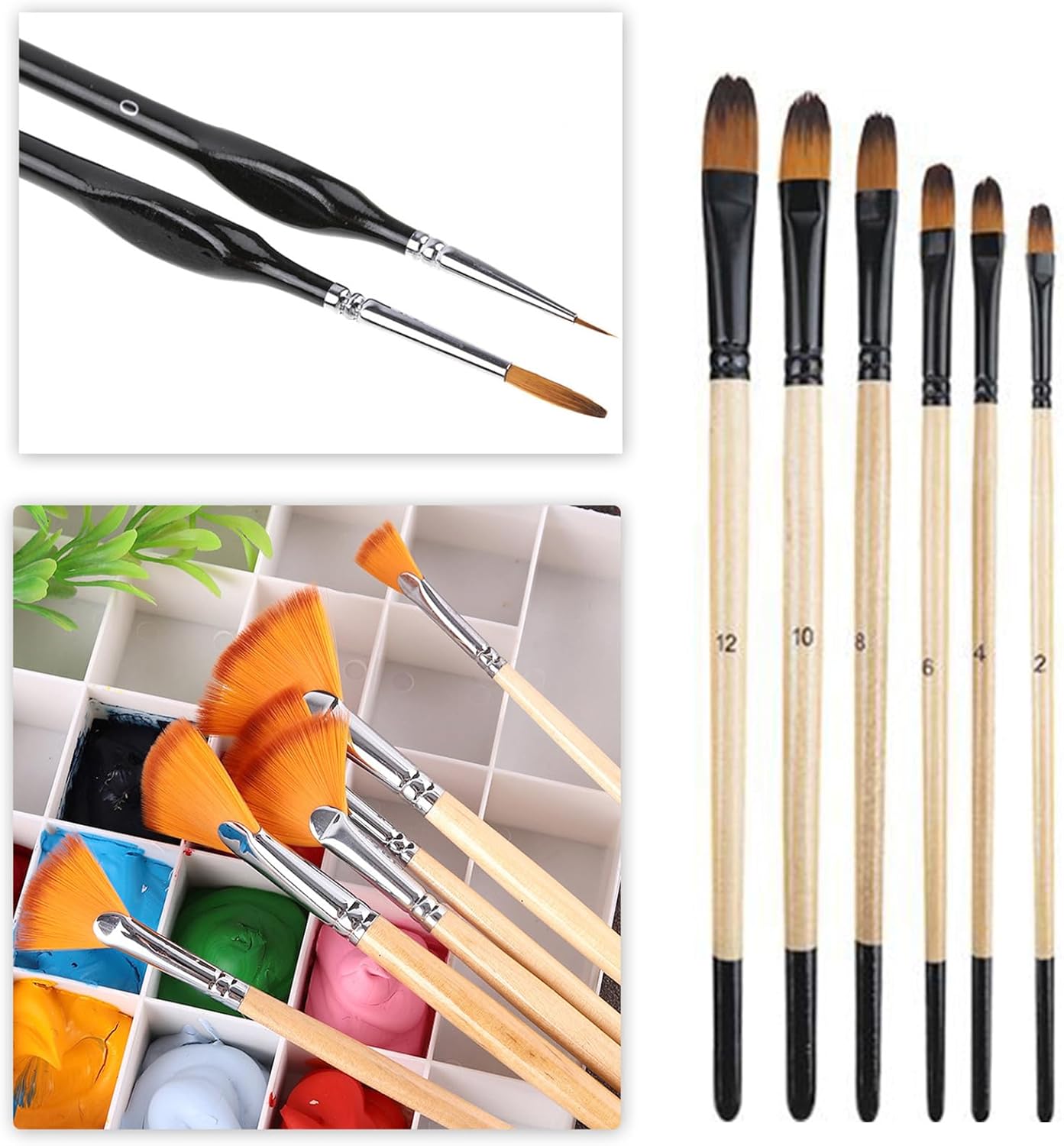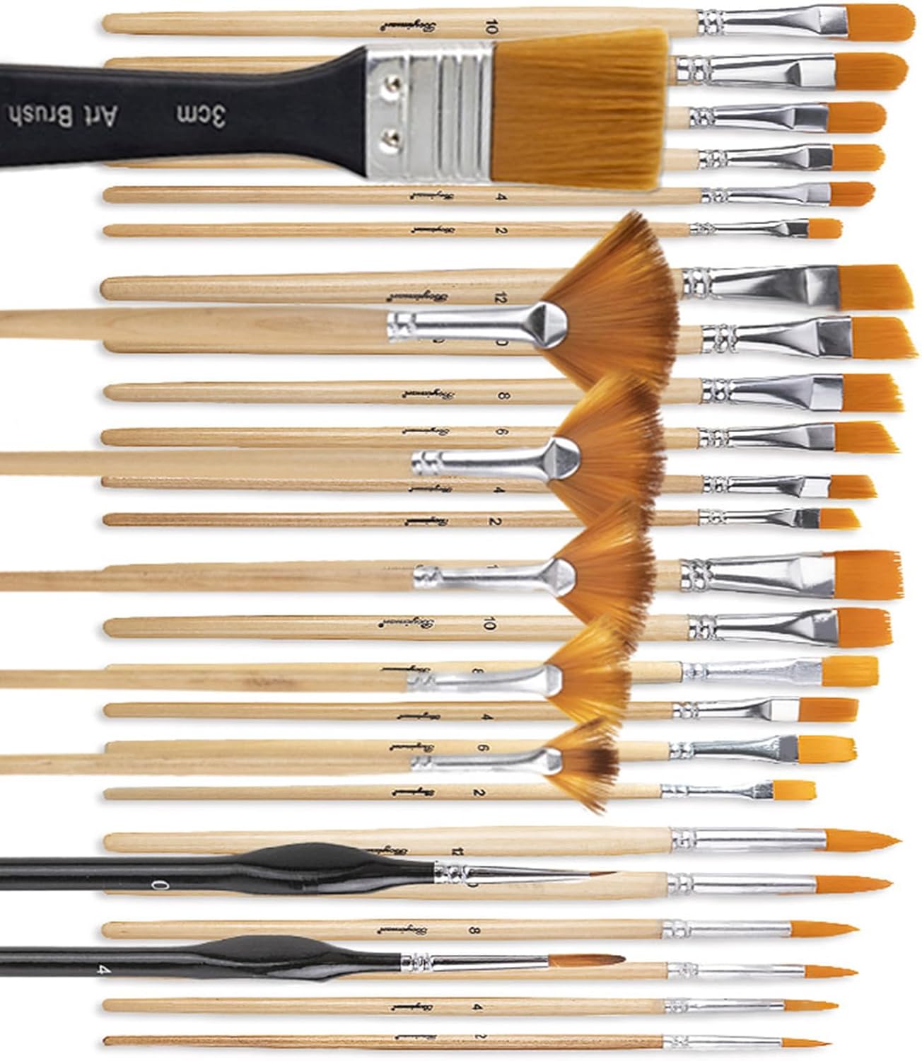 Ideale per la maggior parte dei tipi di pittura come pittura per viso e corpo, arte murale, olio, acquerello, disegno acrilico a guazzo, pittura con stencil, pittura su modelli, artigianato, pittura su roccia e pietra Pennelli professionali: punta piatta, punta inclinata, punta rotonda, punta a ventaglio e punta appuntita. Adatto a studenti, bambini e hobbisti. Ogni dimensione del pennello è contrassegnata sul manico, facile da distinguere e utilizzare 28 o 32 diversi tipi di pennelli per acquerello per diverse esigenze di pittura e dettaglio, come pennelli fineliner, pennelli grandi per stencil, pennelli con punta a ventaglio. Soddisfa facilmente le diverse esigenze di dettagli, illustrazioni, rivestimenti, miscelazione di setole in legno e nylon, buon assorbimento d'acqua, facile applicazione. I manicotti dei tubi metallici sono sigillati in modo estremamente stretto in modo che non fuoriescano o si allentino facilmente. Regalo di festa per studenti, hobbisti e artisti professionisti. Facile da lavare con acqua e acqua tiepida. Nota: immergere in acqua a bassa temperatura per alcuni minuti prima dell'uso