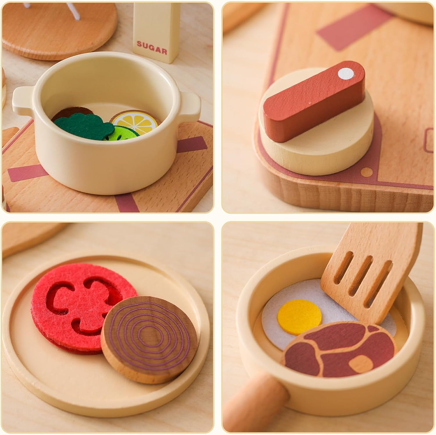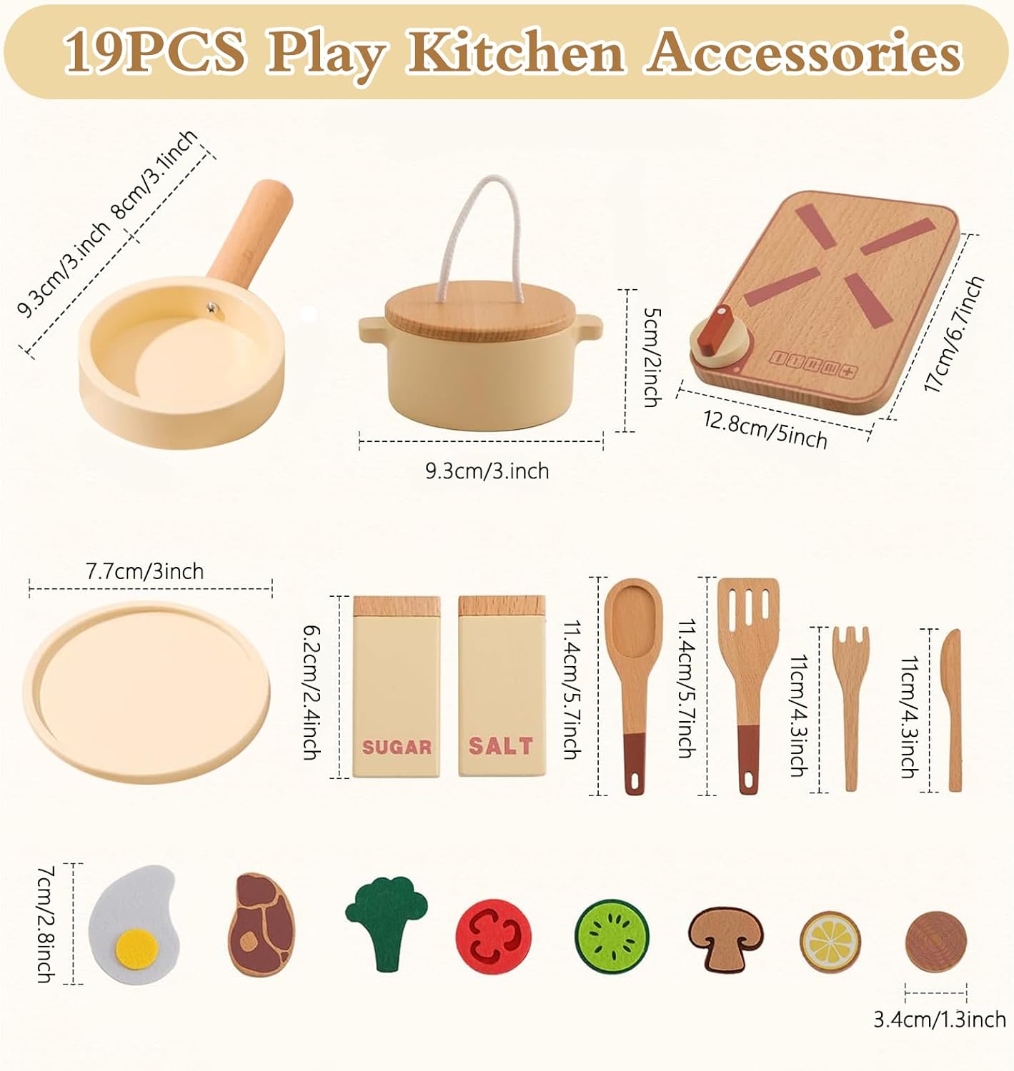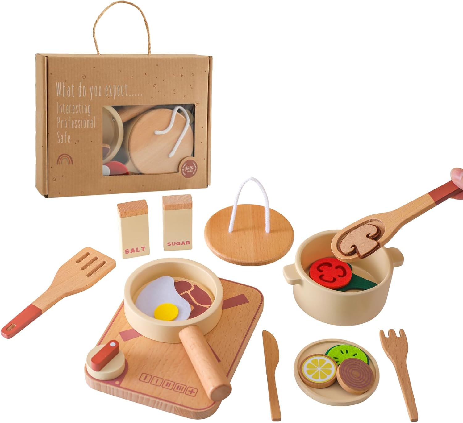 Set da cucina da 18 pezzi: questo set da cucina contiene tutto ciò che serve ai bambini per cucinare e poi servire un pasto delizioso. Contenuto: un fornello, una pentola con coperchio, una padella, un cucchiaio di legno, una spatola, un piatto, un coltello, una forchetta e una saliera, otto fette per alimenti. Alcuni alimenti sono realizzati in feltro. Aggiunta alla cucina dei bambini: questo set da cucina e da portata in legno di Smartwo è un'ottima aggiunta a qualsiasi cucina da gioco o cucina delle bambole. Con le sue forme realistiche, questo set da gioco regala un allegro divertimento ai più piccoli. I bambini possono imparare giocando a conoscere gli utensili e le posate da cucina e sviluppare il loro interesse per la cucina. Gioco di ruolo per i più piccoli: questo set di pentole e stoviglie offre diverse opzioni di gioco e arricchisce il gioco di ruolo. Sia che cucinino come uno chef o che ordinino come un cliente, le abilità motorie fini, l'immaginazione e le abilità sociali dei bambini vengono incoraggiate attraverso il gioco interattivo con amici e familiari. Design adatto ai bambini: realizzato in legno robusto di alta qualità e vernice a base d'acqua. (I dischi per il cibo sono in feltro). Lucidato e rifinito in modo pulito, senza spigoli vivi e senza rischio di lesioni per i bambini piccoli. Dimensioni perfette per le piccole mani del bambino. Grandi idee regalo: confezionato in una scatola bella ed ecologica, regalo perfetto per i bambini che amano la cucina e i giochi di ruolo, per compleanni, Pasqua, Natale, Capodanno, ecc. Età consigliata: a partire da 3 anni. Contattateci in qualsiasi momento se avete ulteriori domande.