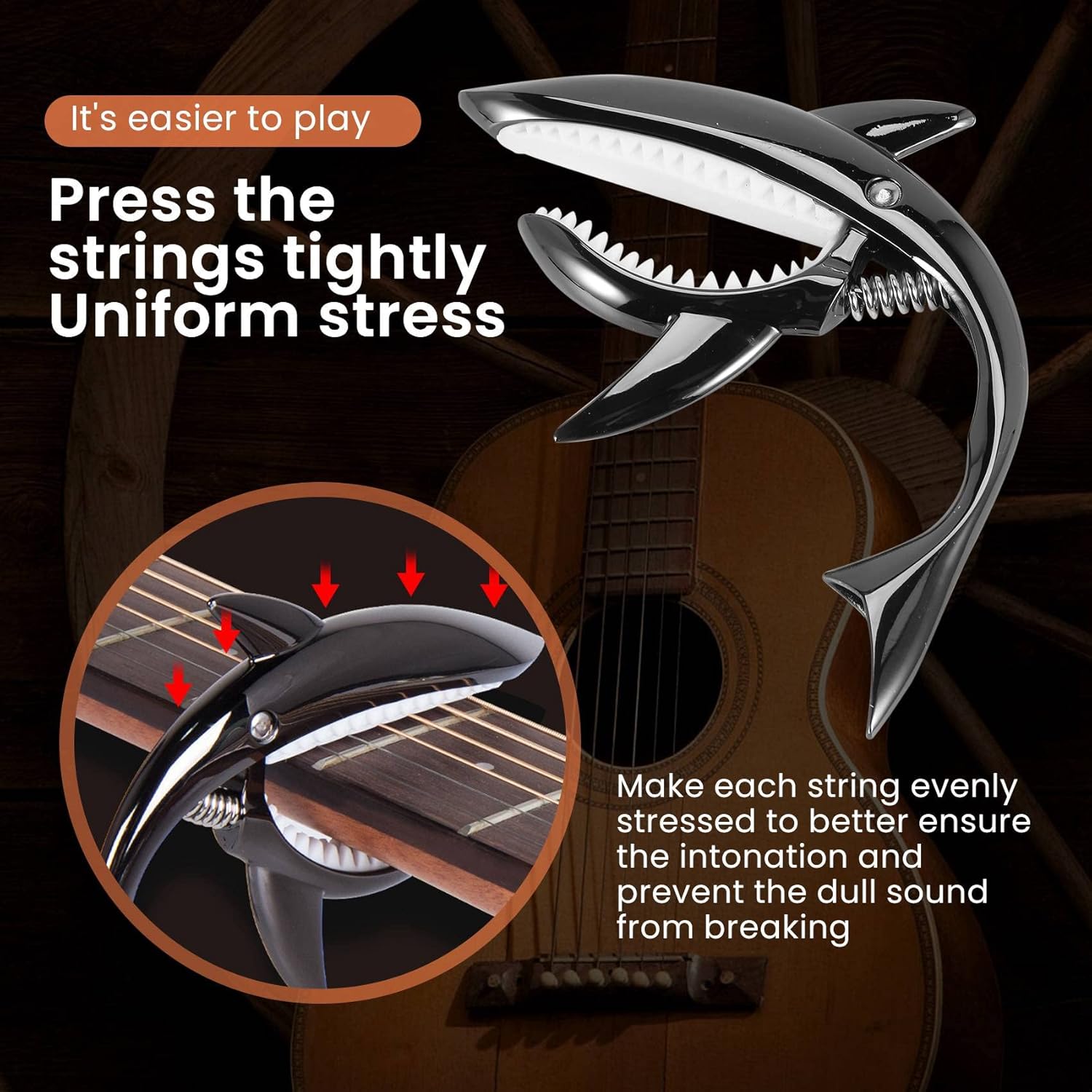 Capo - Adatto per una varietà di chitarre, Acustiche elettriche Ukulele Mandolino Banjo Chitarre classiche Basso Semplice da usare: usa il principio ' e della leva, facile da impugnare e risparmiare fatica Bello e alla moda: una varietà di opzioni di colore per soddisfare le esigenze di persone diverse e aggiungere colore alla tua musica Alta qualità: utilizzo di materiali in lega di durevoli, lunga durata, per accompagnare la tua creazione Buon regalo: questo capo di squalo è il regalo più speciale per gli amanti della musica