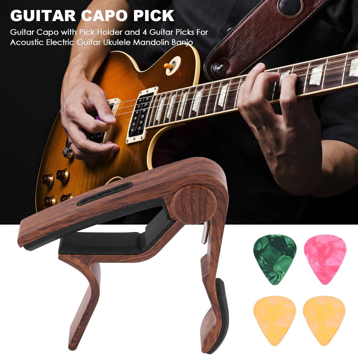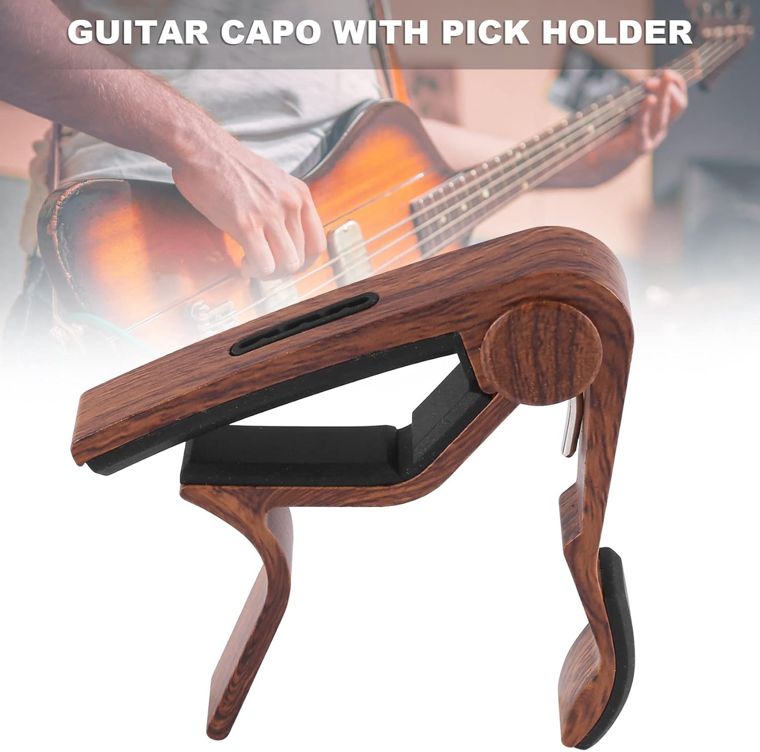 NESSUN RUMORE RONZIOSO - Il della chitarra è in di bloccare perfettamente le corde per produrre un suono perfetto e non creare alcun ronzio, permettendoti di suonarlo in qualsiasi posizione sul manico della chitarra. MULTIFUNZIONALE - Il capo della chitarra aggiornato diversi che suonano e che tengono i plettri. Con un supporto per plettri aggiunto progettato per suonare in modo più facile e conveniente, che ti consente di personalizzare la tua musica. RILASCIO RAPIDO - Design leggero, portatile, ergonomico e facile da usare, che consente ai chitarristi di suonare a proprio agio in diverse chiavi. Il design a molla del della chitarra consente ai chitarristi di rilasciare e riposizionare facilmente a una velocità molto rapida. Perfetto per spettacoli sul palco e pratica. ADATTO PER CHITARRE DI 6 CORDE - Il per chitarra in metallo, compatibile con chitarre con stile u, stile v o stile c, è progettato per cambiare chitarra elettrica, chitarra acustica, basso, mandolino, ukulele e banjo intervalli rapidamente. Il colore del legno scuro risalta su qualsiasi chitarra. CAPO PER CHITARRA PROFESSIONALE - Il per chitarra è realizzato in lega di alluminio, che garantisce la sua durata e protezione per il manico della chitarra, proteggendo la chitarra e le corde dai graffi e garantendo l'accuratezza del cambio di tono.
