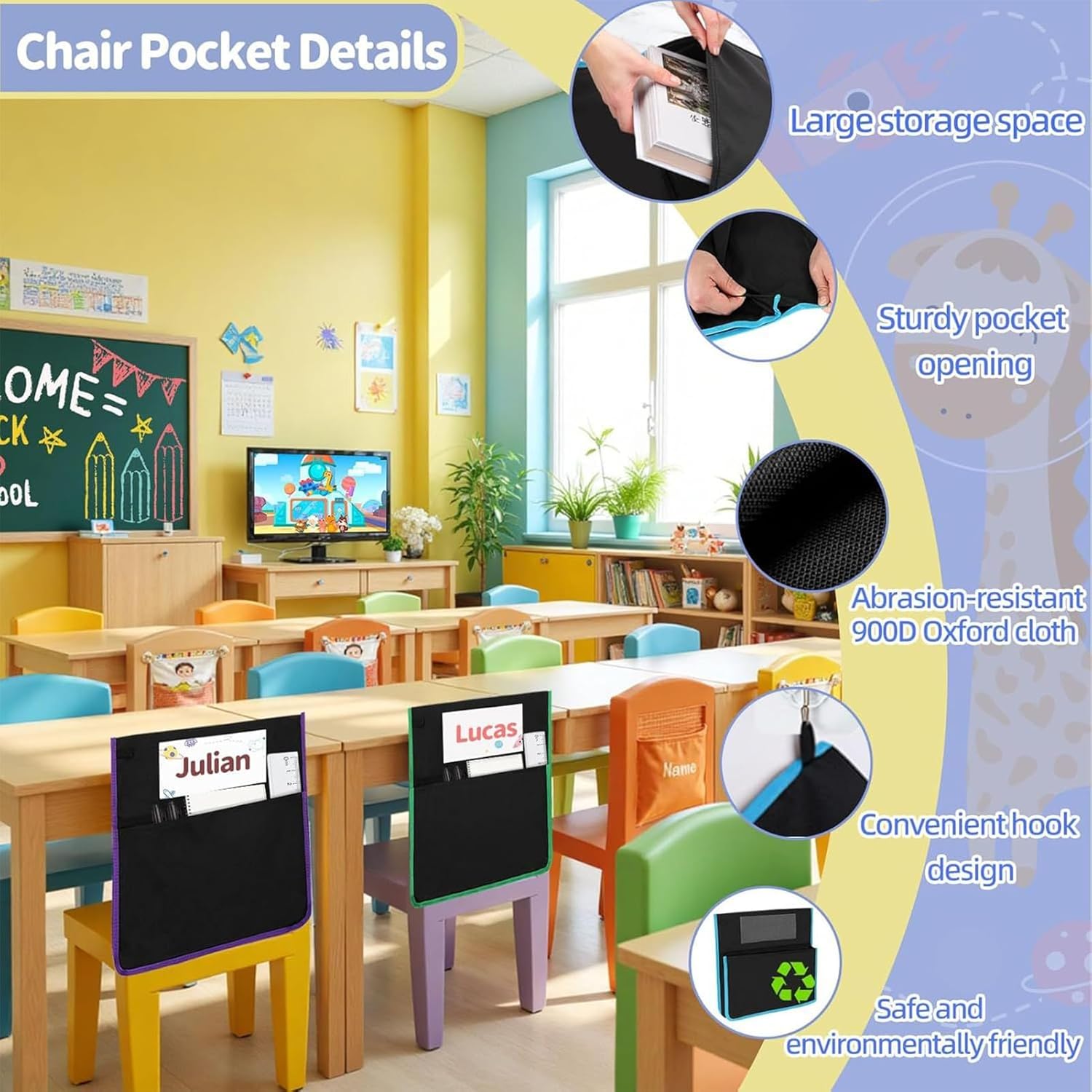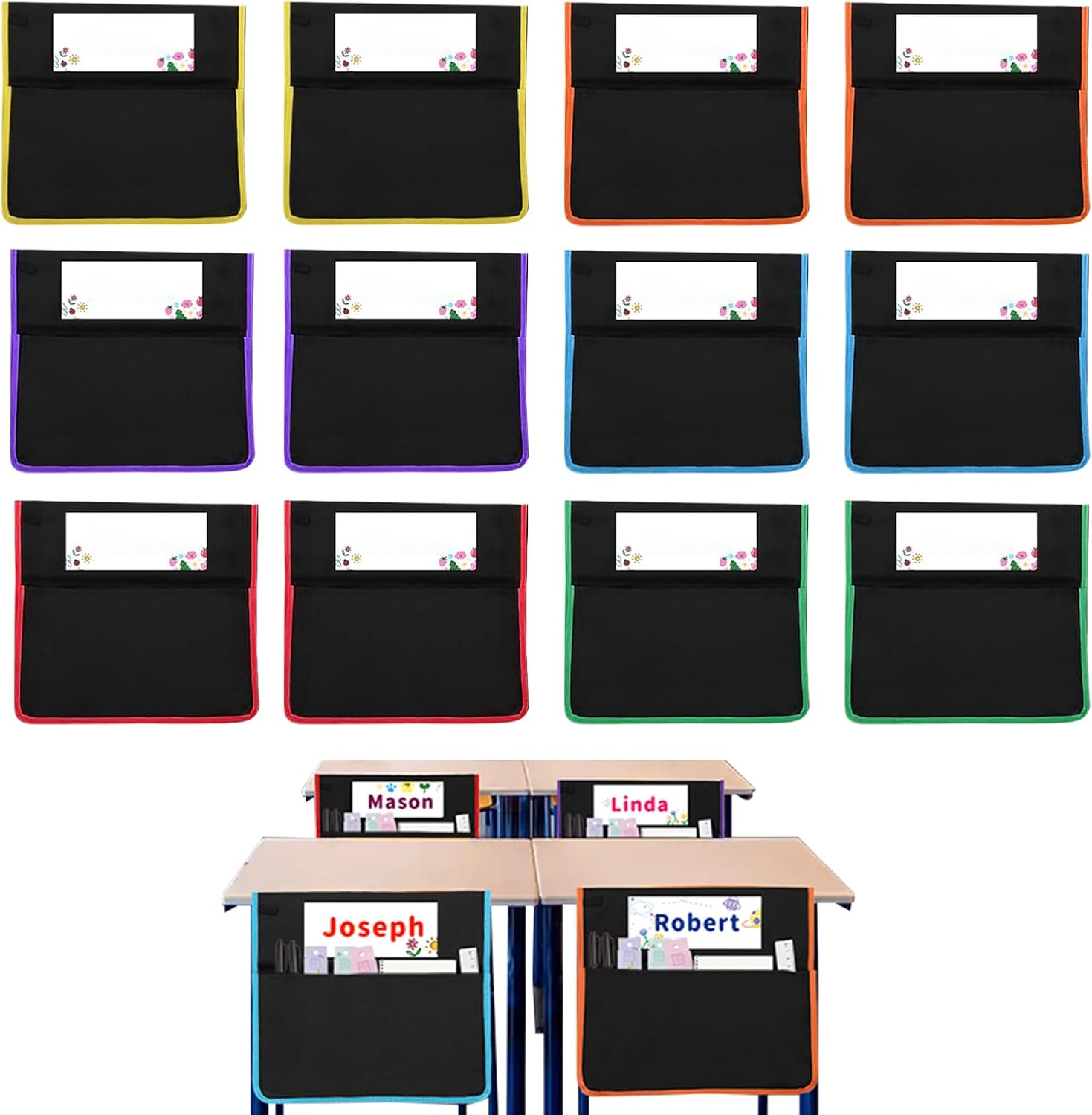 Prevenzione oggetti smarriti: semplifica l'organizzazione delle forniture scolastiche con una pratica soluzione di archiviazione in classe, progettata per favorire lo sviluppo delle abitudini di ordine e ridurre i rischi di oggetti persi Soluzione di fissaggio modernizzata: il sistema di chiusura posteriore sicuro combinato con l'installazione slip-on garantisce un posizionamento affidabile delle tasche delle sedie, supportando la funzionalità della classe attraverso un design attento e pratico incentrato sull'utente Maggiore durata del tessuto: con tessuto Oxford 900D, queste tasche per sedie combinano protezione dall'umidità, resistenti all'usura e lavabili in lavatrice per una maggiore durata Soluzione efficiente per la configurazione della classe: dispone di un set di dodici tasche per sedie con ventiquattro schede bianche incluse, progettate per un rapido riconoscimento e una perfetta integrazione nelle configurazioni scolastiche con compatibilità con larghezza di quindici pollici Soluzione di archiviazione adattabile: perfettamente adatto per aule, studi artistici creativi, ambienti scientifici e stanze dei bambini, garantendo una praticità elegante nell'organizzazione efficace dei must-have quotidiani