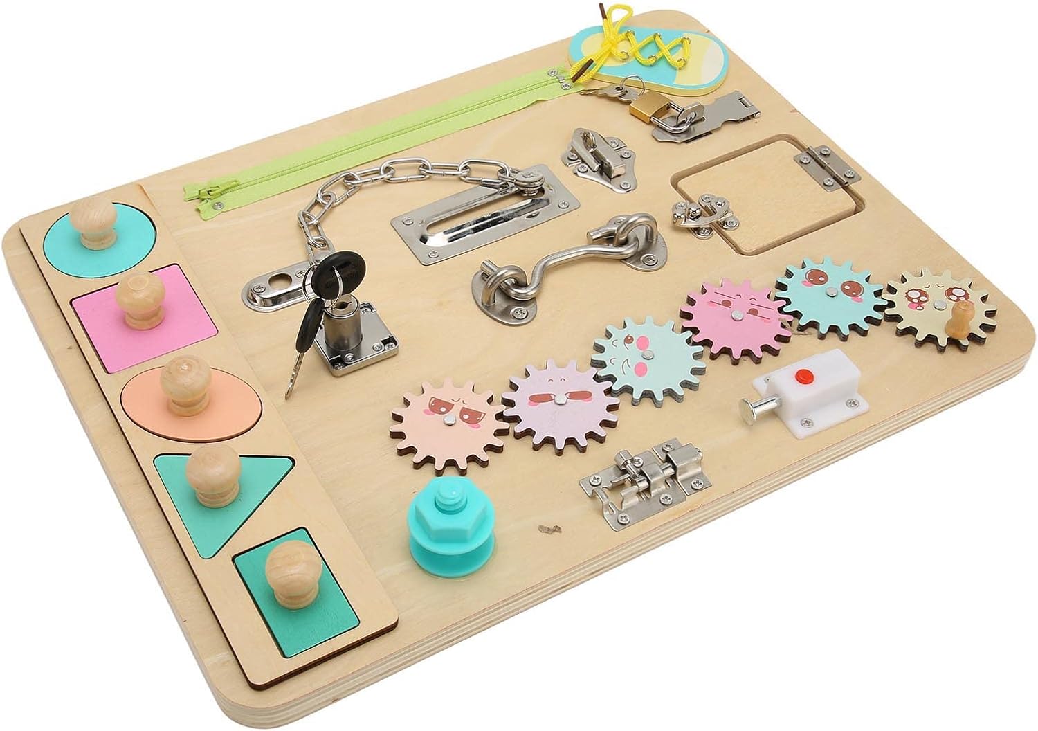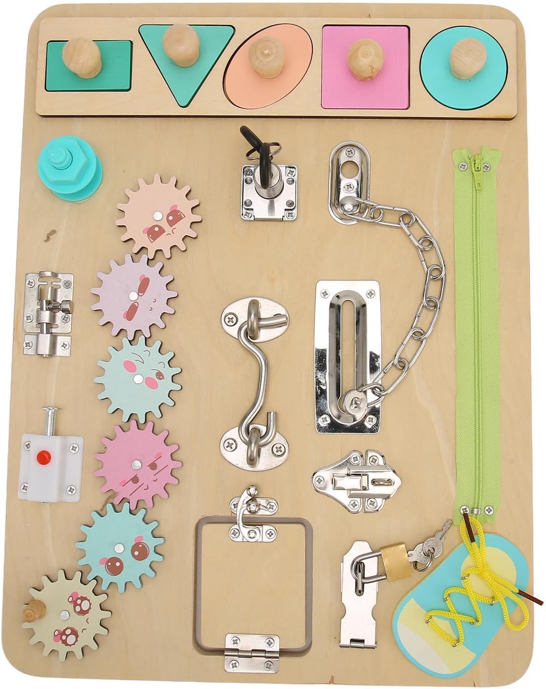 Per serrature e ingranaggi: questo per la tavola di abilità per bambini è dotato di blocchi e ingranaggi. Funzione: aiuta a esercitare il pensiero e il problema indipendenti del bambino: risolvere le capacità mentre osservano e tentano di aprire le serrature e azionare gli ingranaggi. Per la scheda sensoriale: materiale: la scheda sensoriale utilizza una scheda di legno selettivamente ispessita e levigata. È robusto e durevole, meno probabilità di deformarsi o rompersi. Per i giocattoli per lo sviluppo: questa scheda di competenza blocca è progettata per contribuire allo sviluppo di logica, abilità motorie, memoria e indipendenza. Per la coordinazione degli occhi manuali: questa scheda di attività blocca stimola la curiosità, la perseveranza, la creatività, il riconoscimento e le preferenze, migliorando la coordinazione oculare delle mani. : per la tavola delle abilità del bambino, questo è un ideale per i bambini. Facilita il legame familiare e aiuta i bambini nello sviluppo di capacità sociali e comunicative.