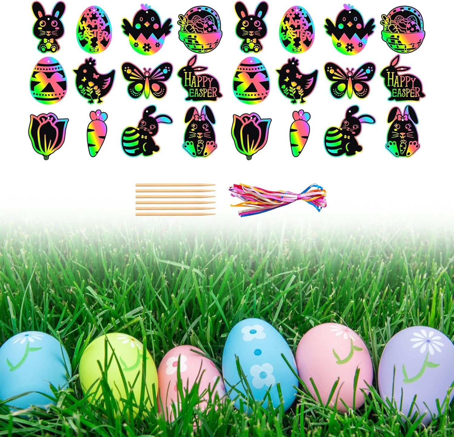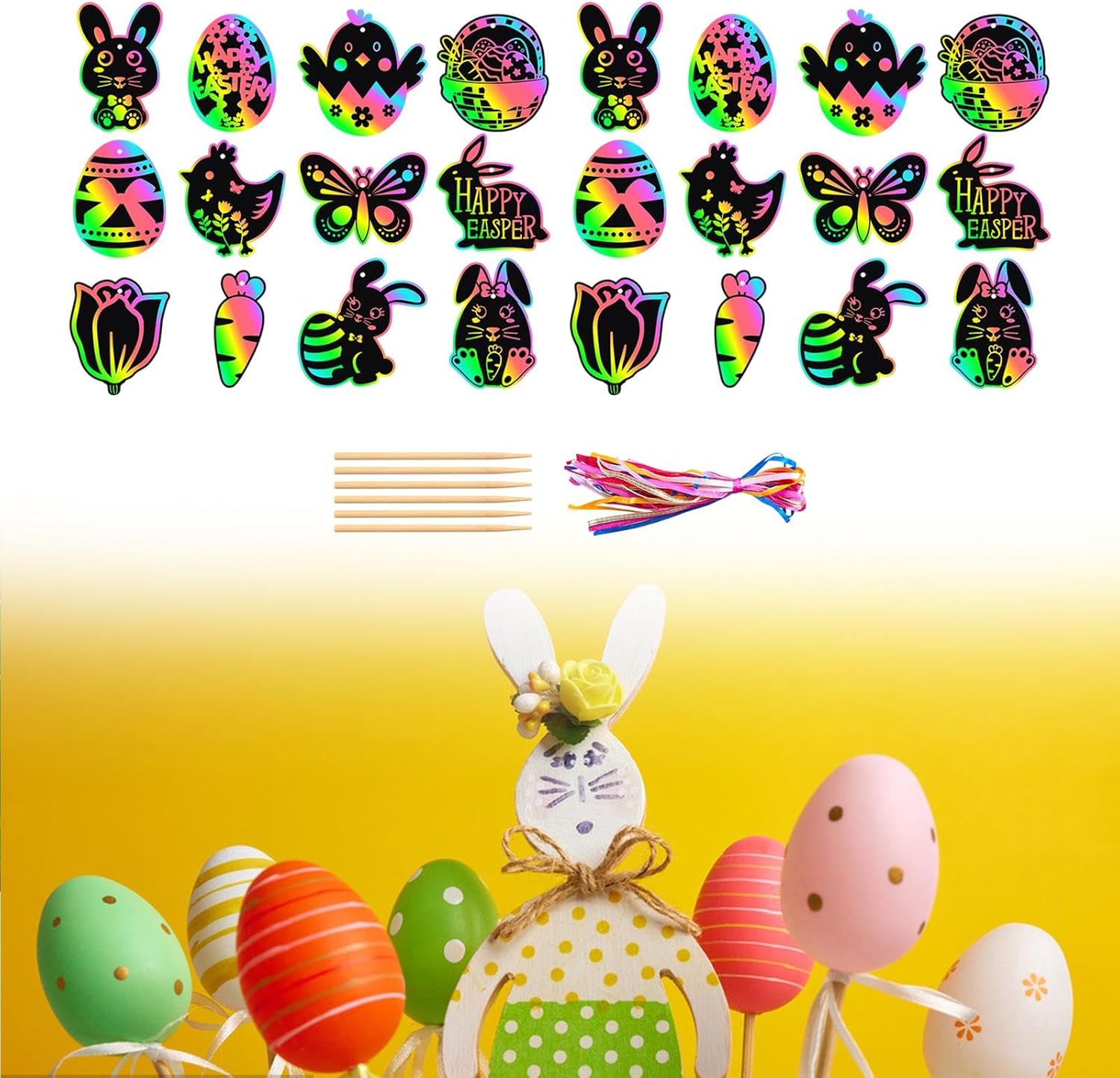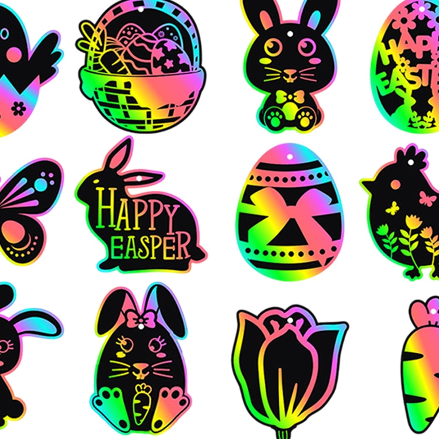 【Celebrate Kit fai -da -te Pasqua】: il set di carta graffio di Pasqua può usare la levetta di legno per disegnare sulla superficie liscia per raschiare i motivi per i tuoi ornamenti e può appenderli 【Kids Art and Craft】: Questo kit di fornitura di party di Pasqua fai -da -te è un modo divertente e creativo per i bambini, è un ottimo modo per far divertire i tuoi bambini e godersi l'atmosfera festosa di Pasqua 【Pacchetto include】: riceverai 24x passi di graffi, bastoncino di legno 6x, nastro 6x 【Materiale】: il set di carta graffiante di Pasqua è realizzato in materiale di carta, è bella e raffinata di lavorazione ed è un grande ornamento di Pasqua 【Regalo di Pasqua】: il nostro kit fai -da -te di Pasqua è un regalo per i bambini. Offre una grande opportunità per la famiglia e i bambini di interazione