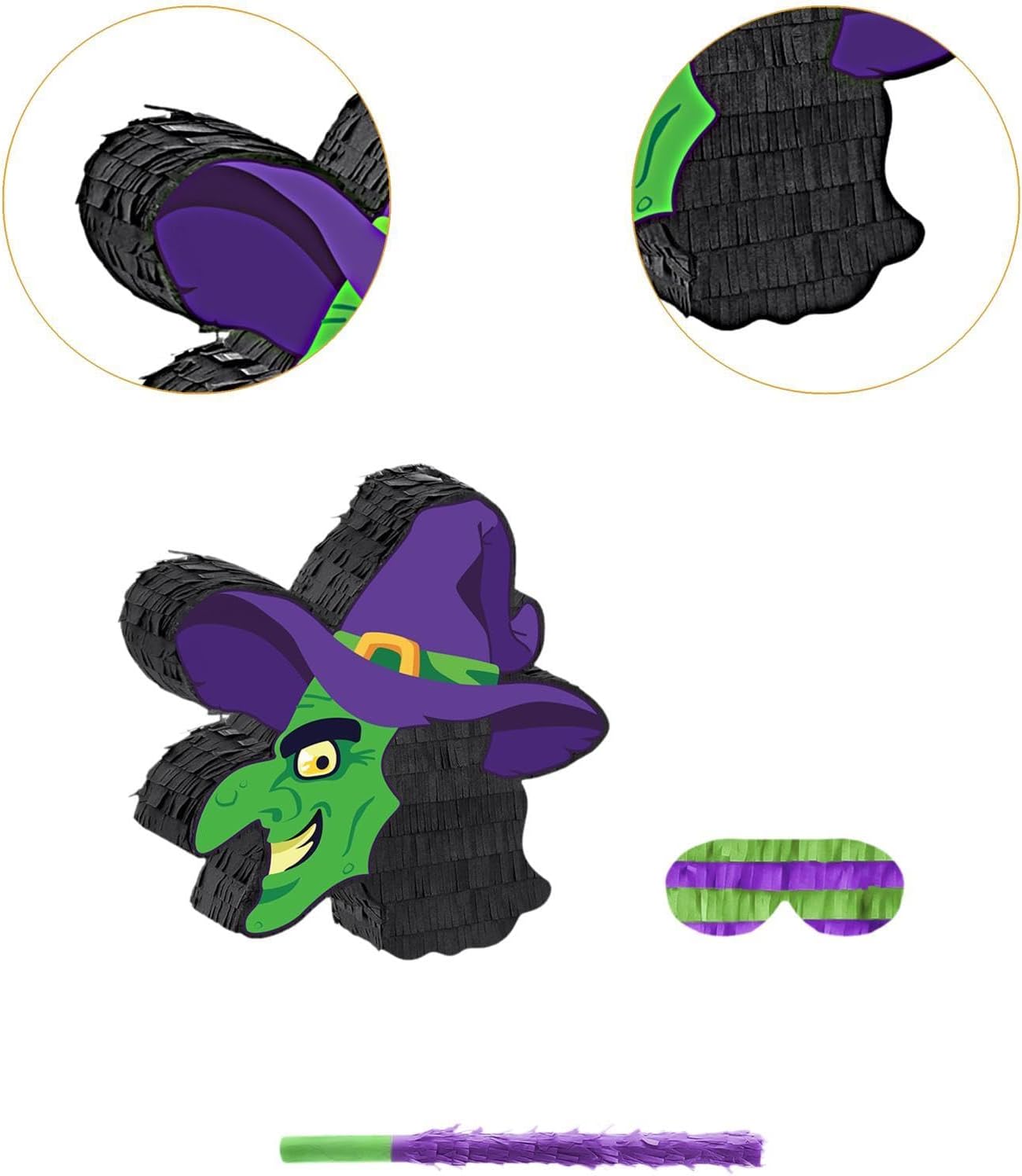 【Design】: il set Witch Piñata ha un design semplice ed elegante e può essere riempito con caramelle, carta colorata, biglietti regalo, ecc., aggiungendo divertimento a qualsiasi festa 【Ampia applicazione】: l'organizzatore vuoto per oggetti di scena fotografici è adatto per Halloween, feste a tema, compleanni, celebrazioni, carnevali o qualsiasi altra occasione speciale in cui desideri aggiungere divertimento 【Giochi per bambini】: le forniture per giochi di società sono facili da trasportare e riporre, progettate per essere ricaricabili e possono contenere snack, caramelle, giocattoli e altri oggetti, rendendoli comodi da appendere e giocare durante eventi 【Facile da usare】: la decorazione per feste di Halloween è semplice e comoda da usare. Puoi colpirla con l'asta in dotazione, un divertente gioco per feste di Halloween. 【Materiale】: la della strega di Halloween è realizzata in carta e PVC, con colori vivaci, che possono aggiungere colori vivaci a qualsiasi festa