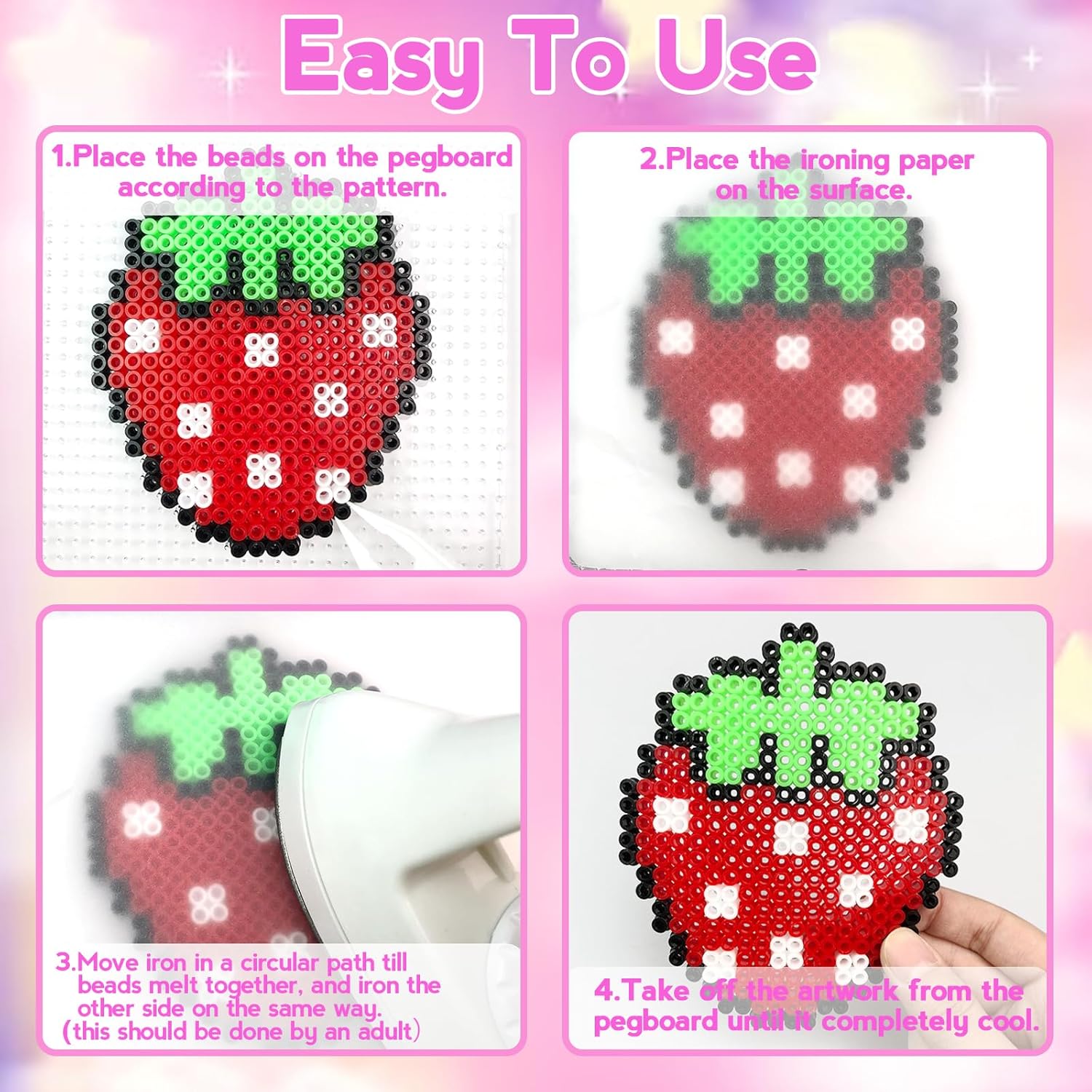 Kit completo di perline da stirare: Questo kit contiene 2 scatole di perline fusibili, perline in 48 colori, 1 piastre per perline ( quadrato), 4 carte da stiro, 2 pinzette, 5 portachiavi, 5 ganci di plastica, 5 cordoncini di metallo, 10 anelli di metallo, 1 opuscolo con 31 modelli Alta qualità: Il nostro set di perline da stirare artigianali è realizzato con materiali di alta qualità, non facili da rompere. Perline di fusione da 5 mm, più grandi di quelle comuni e più facili da raccogliere. Si prega di assicurarsi che un adulto gestisca o guidi la fase di stiratura Regalo ideale per il kit di artigianato: Il nostro kit di perline da stirare artigianali è il regalo perfetto per le ragazze e i ragazzi che amano fare i propri mestieri. Questo kit di perline viene fornito con una squisita confezione regalo, perfetta per compleanni, Natale o qualsiasi altro regalo di Natale per bambini di età superiore ai 5 anni. Regali di artigianato ideali per bambini di età compresa tra 6 e 12 anni, e state certi che lo adoreranno Creatività illimitata: Queste kit di perline da stirare possono distogliere l'attenzione del bambino dall'elettronica e concentrarsi sull'attività artigianale, e si può completare un mestiere fatto a mano con i bambini in un'attività familiare. Si tratta di un'eccellente attività artigianale che stimola la creatività e l'immaginazione del bambino, oltre a fornire a voi e al vostro bambino un ottimo ricordo Istruzioni e guida: C'è un'istruzione per l'uso in ciascuno dei nostri set di perline da stirare, compresi vari modelli artistici per il vostro riferimento, è possibile seguire sopra per fare un'opera d'arte o progettare il proprio