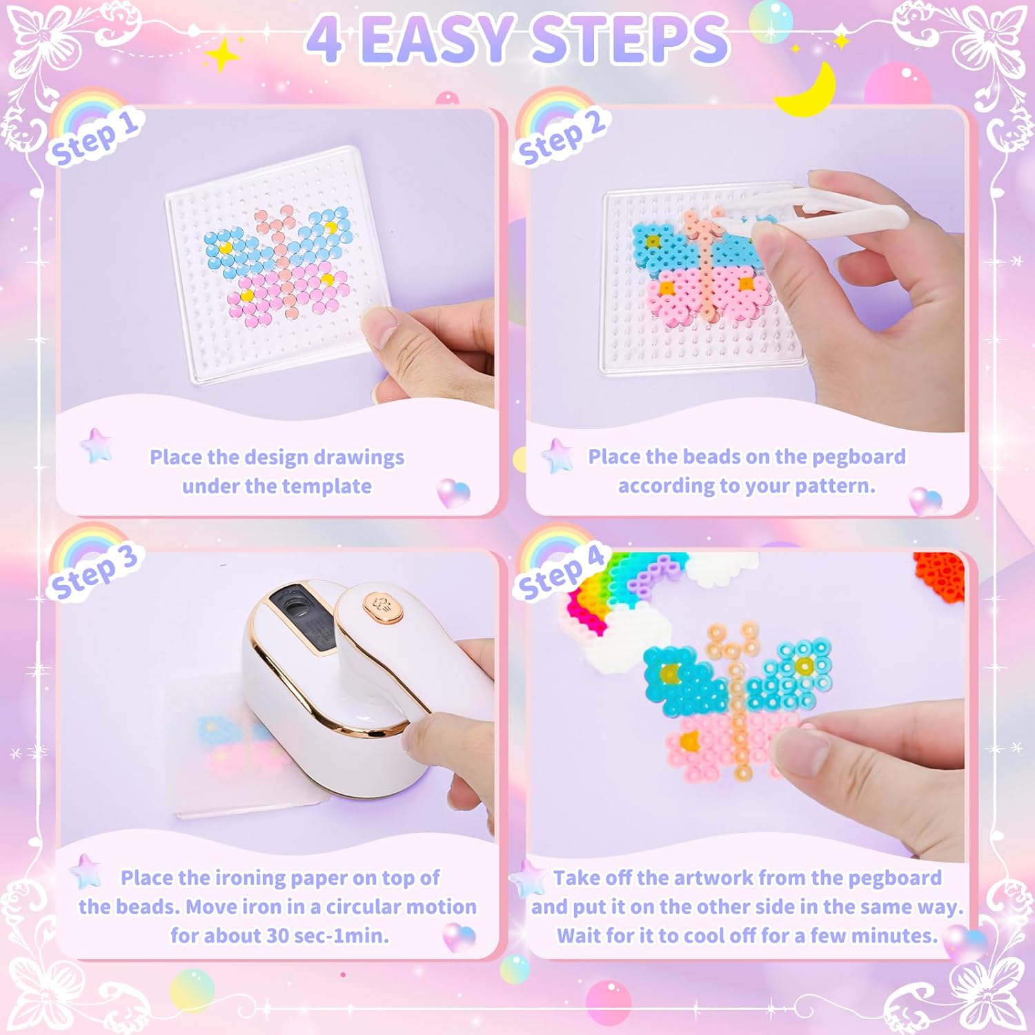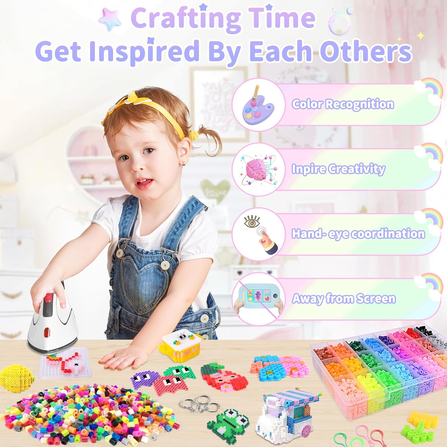 【Set Perline per Gioielli Fai Da Te】Il nostro kit di perline a fusione offre tutto ciò di cui hai bisogno per attività creative e divertenti: 8.500 perline in 24 colori, 2 pinzette di precisione, 12 fogli modello per l'ispirazione, 4 ganci in plastica colorati, 5 cordini per telefono, 3 piastre per perline e 3 fogli da stiro. Perfetto per bambini e adulti, non mancherai mai di idee per l'arte pixel e i fai-da-te per bambini. 【Idea Regalo di Natale】Se il tuo bambino ama le attività manuali, questo sarà un ottimo regalo per ragazzi e ragazze che adorano i lavoretti creativi. Questo set è ideale per compleanni, Natale, Capodanno e occasioni speciali, portando gioia e creatività ai destinatari di tutte le età. Condividiamo insieme questa felicità! 【Momenti di Gioia】Adatto ad attività di gruppo per bambini e giornate in famiglia. Allontana l'attenzione del tuo bambino dagli schermi elettronici e sviluppa la sua concentrazione. È un ottimo modo per vedere la creatività del tuo bambino fiorire e la sua immaginazione crescere. Adatto per far giocare insieme più bambini, sperimentando la gioia di condividere e scambiare idee. Divertitevi con i loro design preferiti e godetevi i risultati. 【Creatività Illimitata】Usa il nostro kit di perline per creare varie combinazioni e design. Creare modelli in 2D o 3D sviluppa la percezione spaziale dei bambini. Con creatività illimitata: accessori per borse, portachiavi carini, pendenti, regali per feste o decorazioni per la casa. Migliora anche la motricità fine e la coordinazione occhio-mano dei bambini. 【Usi Multipli】La nostra piastra per perline può essere utilizzata per una varietà di lavori manuali, incluse le perline a fusione e le perline piccole. Questo kit versatile può intrattenere i bambini per ore ed è perfetto per riunioni di famiglia, varie feste, giorni di pioggia e momenti in famiglia.