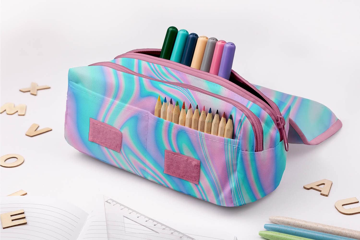 Astuccio con 2 scomparti con 2 chiusure lampo. Materiale e stampa di grande qualità. Ampia possibilita' di utilizzo: astuccio, custodia per cellulare, bustina per gioielli, ochhiali da sole ed altri accessori Dimensioni: 21 cm x 10 cm x 8 cm Ha un lembo su cui scrivere il tuo nome - decidi tu! Se si sceglie la versione con un nome, il nome desiderato viene stampato su un foglio con una pressa o stampato sulla patta. Sul davanti sono presenti due piccole tasche in cui è possibile inserire una gomma o un temperino. Sulla patta è presente un elastico per contenere stivali e matite.