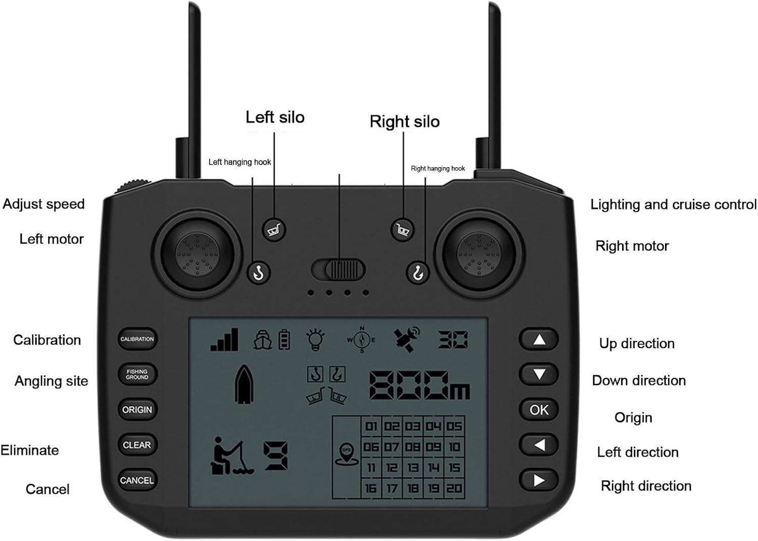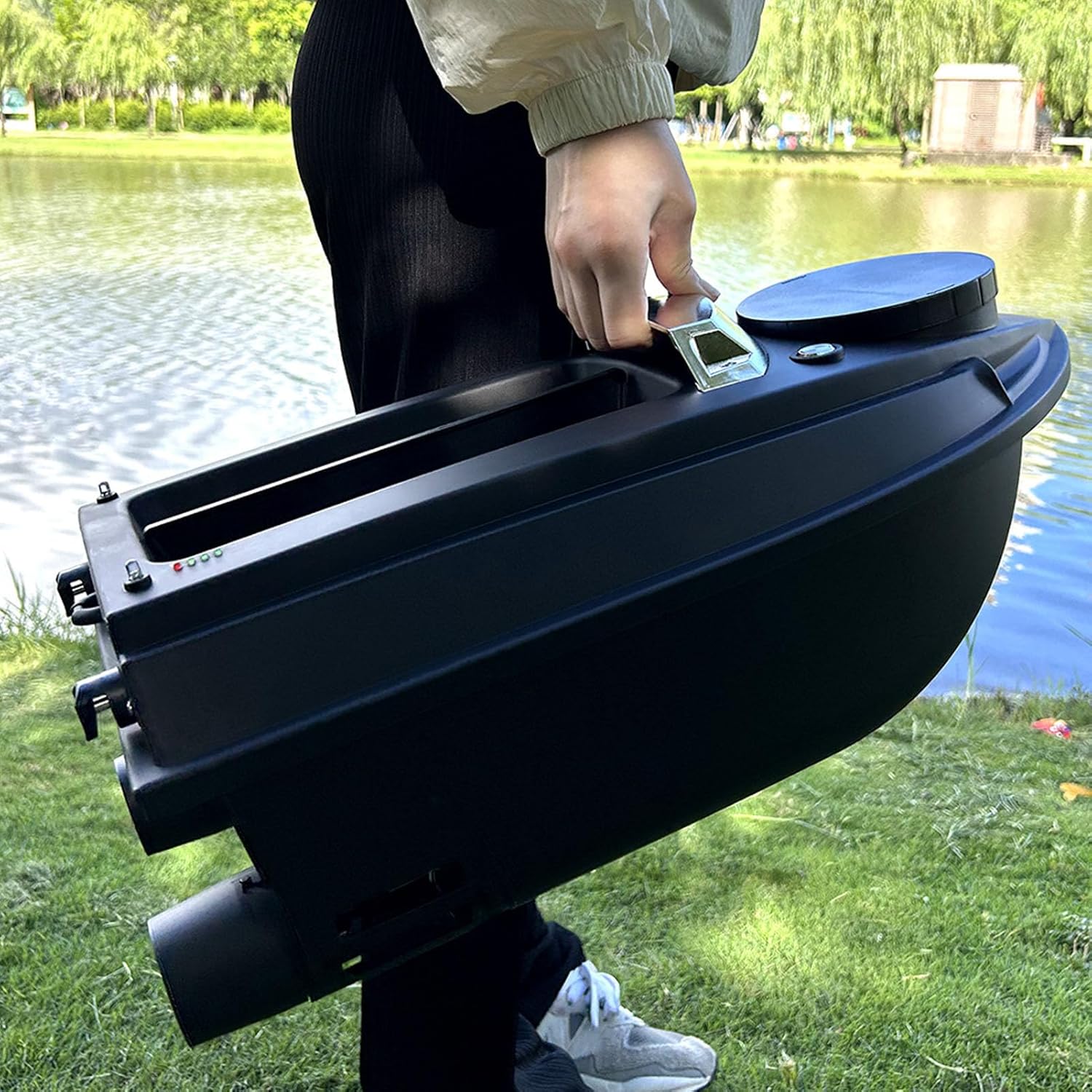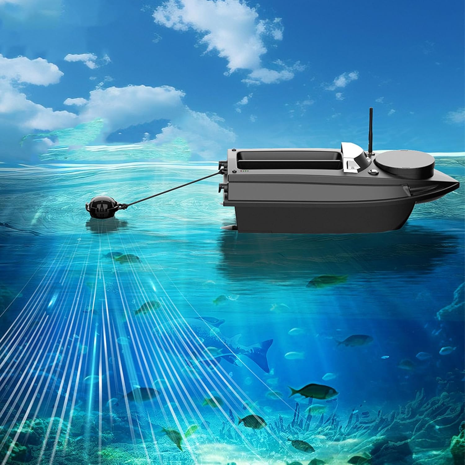 Materiale ABS: il corpo principale 'imbarcazione è stampato a iniezione con materiali tecnici ABS, che forniscono una forte resistenza agli urti, all'usura e un'eccellente resistenza ai graffi. Non è facile da indossare e mantiene il suo aspetto attraente. Calibrazione automatica: la barca è dotata di un giroscopio ad alta efficienza che calibra automaticamente la direzione di navigazione durante il viaggio, consentendo alla barca di virare automaticamente senza regolazione manuale. Doppi ganci elettrici: la barca è dotata di due ganci elettrici pesca efficiente, che consente di attaccare facilmente le reti e migliorare l'efficacia della pesca. Doppio motore con copertura: il potente design a doppio motore con copertura resistente all'acqua previene efficacemente le interferenze dovute all'erba acquatica e ad altri detriti sull'. La velocità del motore è regolabile per migliorare il controllo dello sterzo. Avviso di batteria scarica: lo schermo LCD del telecomando visualizza i livelli della batteria 'imbarcazione e del controller. Quando la batteria 'imbarcazione è scarica, le luci lampeggiano e il controller emette segnali acustici intermittenti per sollecitare la sostituzione della batteria ed evitare la perdita di controllo.