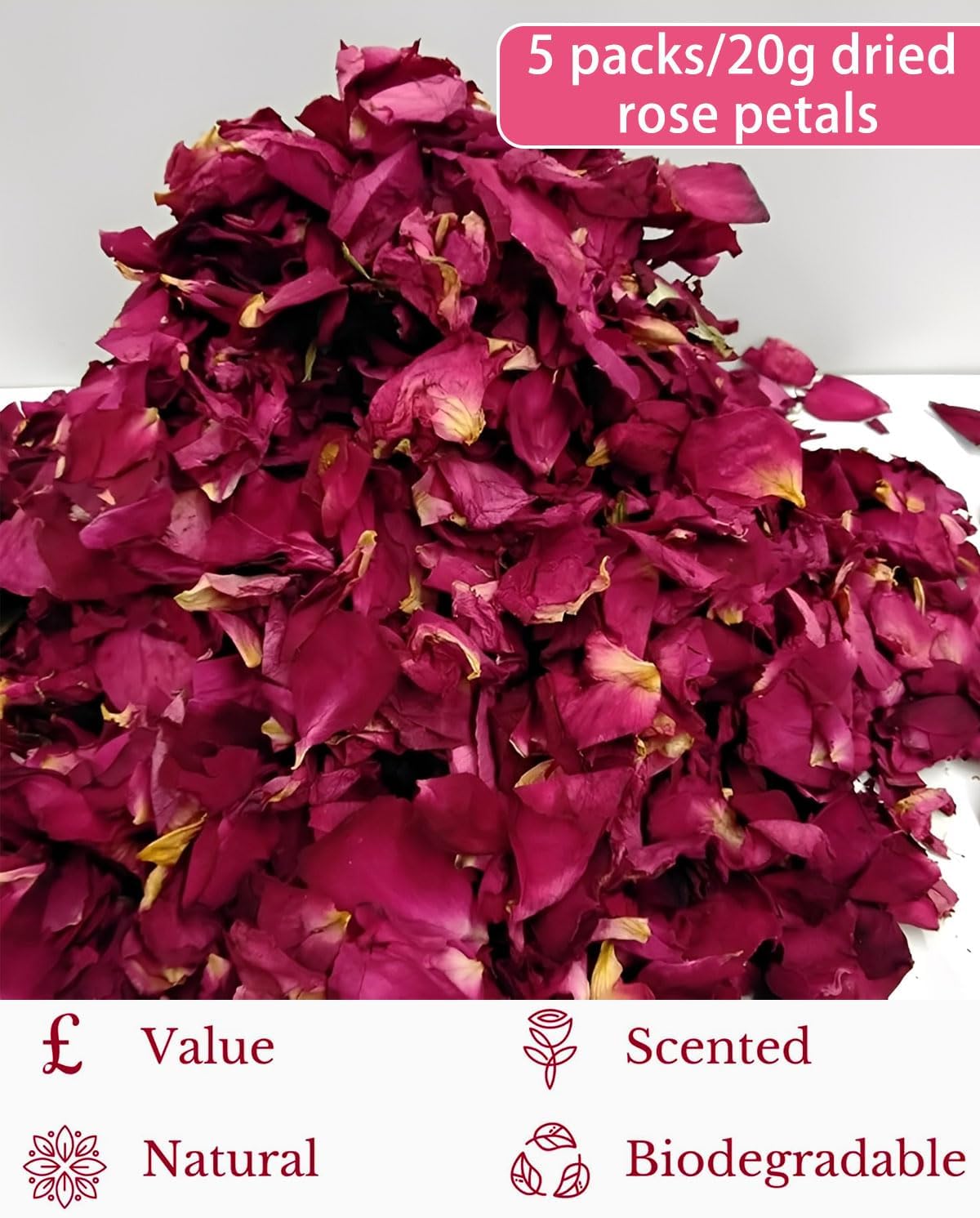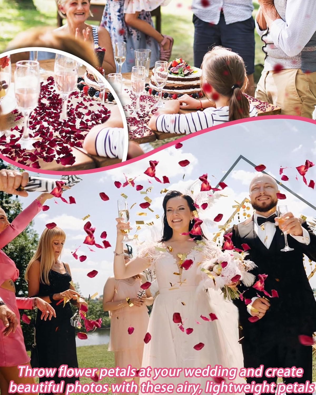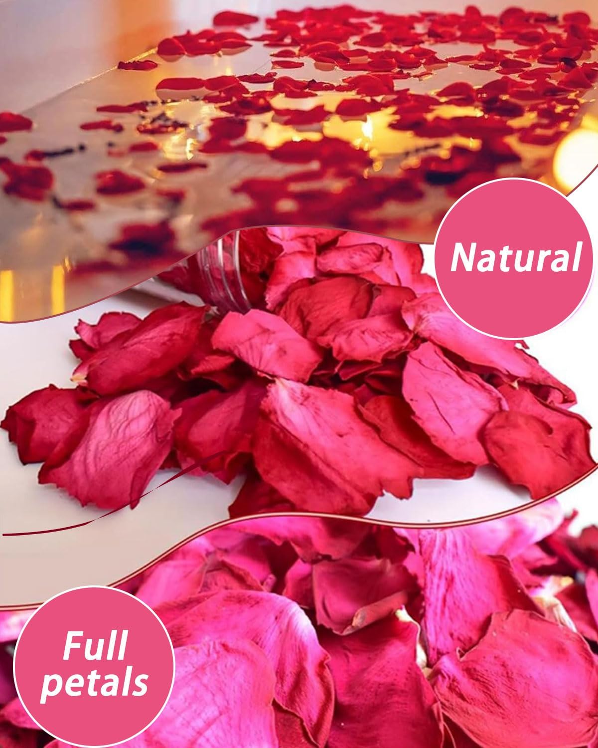 Materiale: realizzato con petali di rosa essiccati naturali al 100%, ecologici e biodegradabili, che aggiungono colori brillanti e un'atmosfera romantica alla tua festa Peso: confezioni selezionate di grande capacità, pari a circa 100 grammi, con una consistenza eccezionale, in grado di soddisfare le esigenze di varie occasioni di festa e di dimostrare il tuo gusto eccellente e la tua scelta ponderata Multifunzionale: fiori secchi naturali selezionati, straordinaria versatilità: impreziosisci squisitamente torte gourmet, crea ingegnosamente candele profumate, prodotti per la cura della pelle e granelli naturali per matrimoni, sublima la tua arte di vivere e la tua cerimonia romantica Facile Da Usare: basta spruzzarlo delicatamente per creare una pioggia di fiori colorati, congelare il momento romantico per gli sposi e sublimare perfettamente la cerimonia nuziale e la festa per gli occhi Utilizzo: Utilizza i petali di rosa naturali per aggiungere un'atmosfera elegante e romantica alle cerimonie nuziali e alle decorazioni dei banchetti nuziali. Sono la scelta perfetta per creare decorazioni per navate, decorazioni da tavola e gioielli fatti a mano