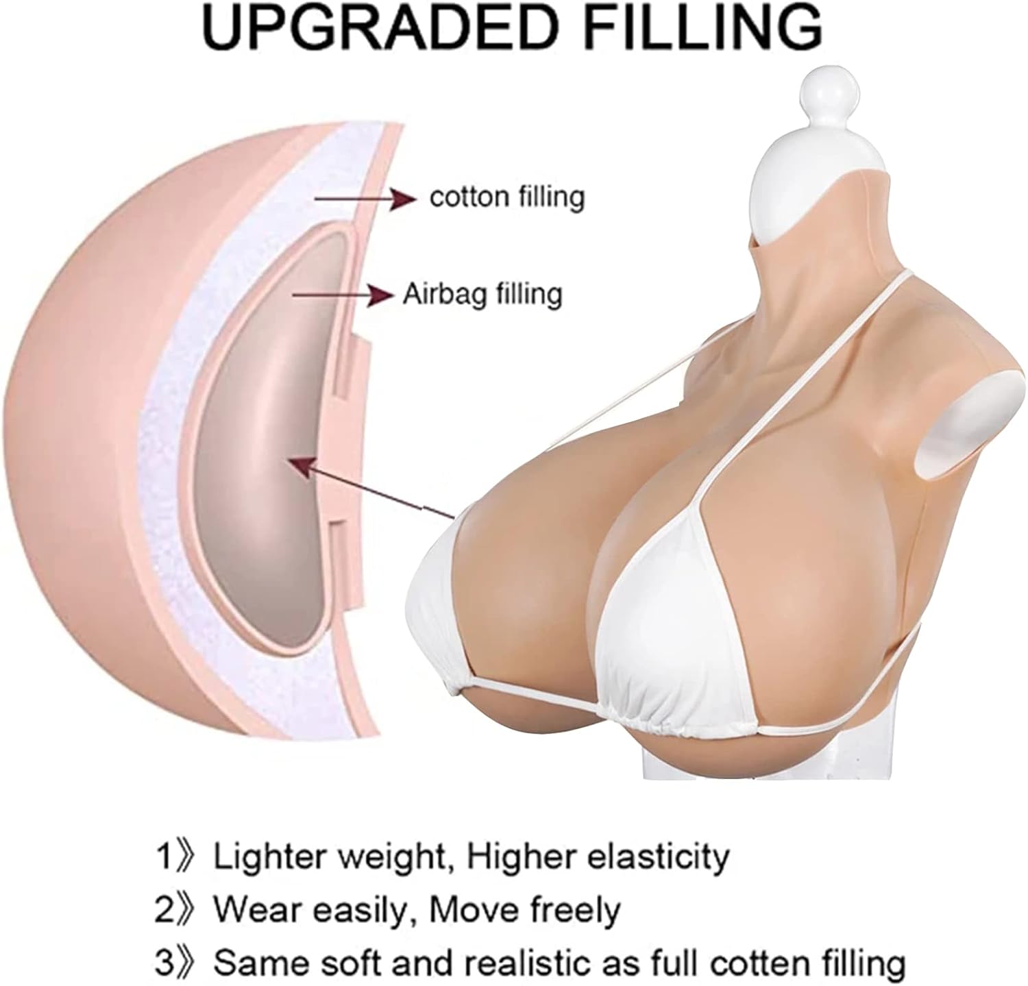 Materiale: realizzato in silicone alimentare senza olio, questo prodotto è riempito con airbag e cotone per una sensazione più solida ma morbida sul petto, in grado di allungarsi fino al 200% per una vestibilità perfetta. Caratteristiche: Progettato con una dimensione del busto plus, include una maggiore larghezza delle spalle e del petto per una maggiore vestibilità e un comfort superiore. Vanta colori di lunga durata senza sbiadire o riflettere, garantendo durata nel tempo. Dimensioni del prodotto: disponibile in tazza Z, peso 9,8 kg. Adatto per persone con un'altezza di 165-195 cm e un peso di 65-115 kg. Dimensioni del seno: 26 x 24,5 x 24 cm, adatto per dimensioni del busto da 80 a 130 cm. Vantaggio: la coppa Z offre un aspetto più grande del previsto, combinando un aspetto sostanziale con un tocco morbido, rendendolo una scelta ideale per coloro che preferiscono pettorali più grandi. Privacy: viene fornito con una confezione discreta che non rivela informazioni sul prodotto esternamente, garantendo la privacy. Include 1x forme seno crossdresser e offre una politica di restituzione e scambio per la soddisfazione del cliente.